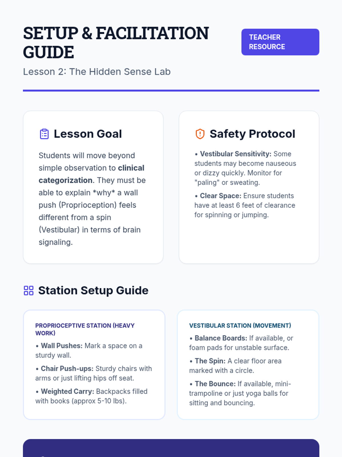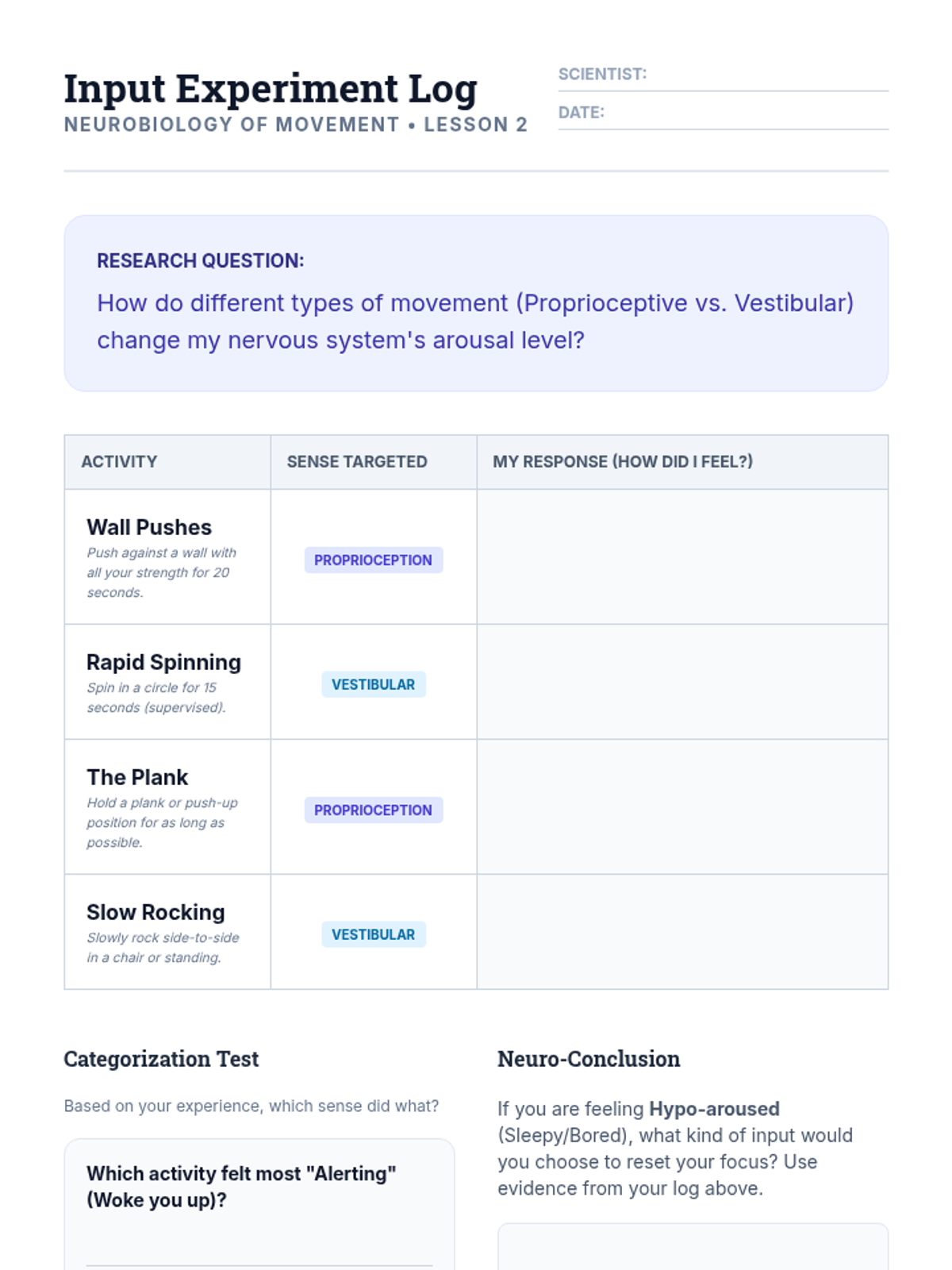 This lesson distinguishes between proprioceptive (heavy work) and vestibular (movement/balance) senses through experimentation and categorization of various sensory inputs.