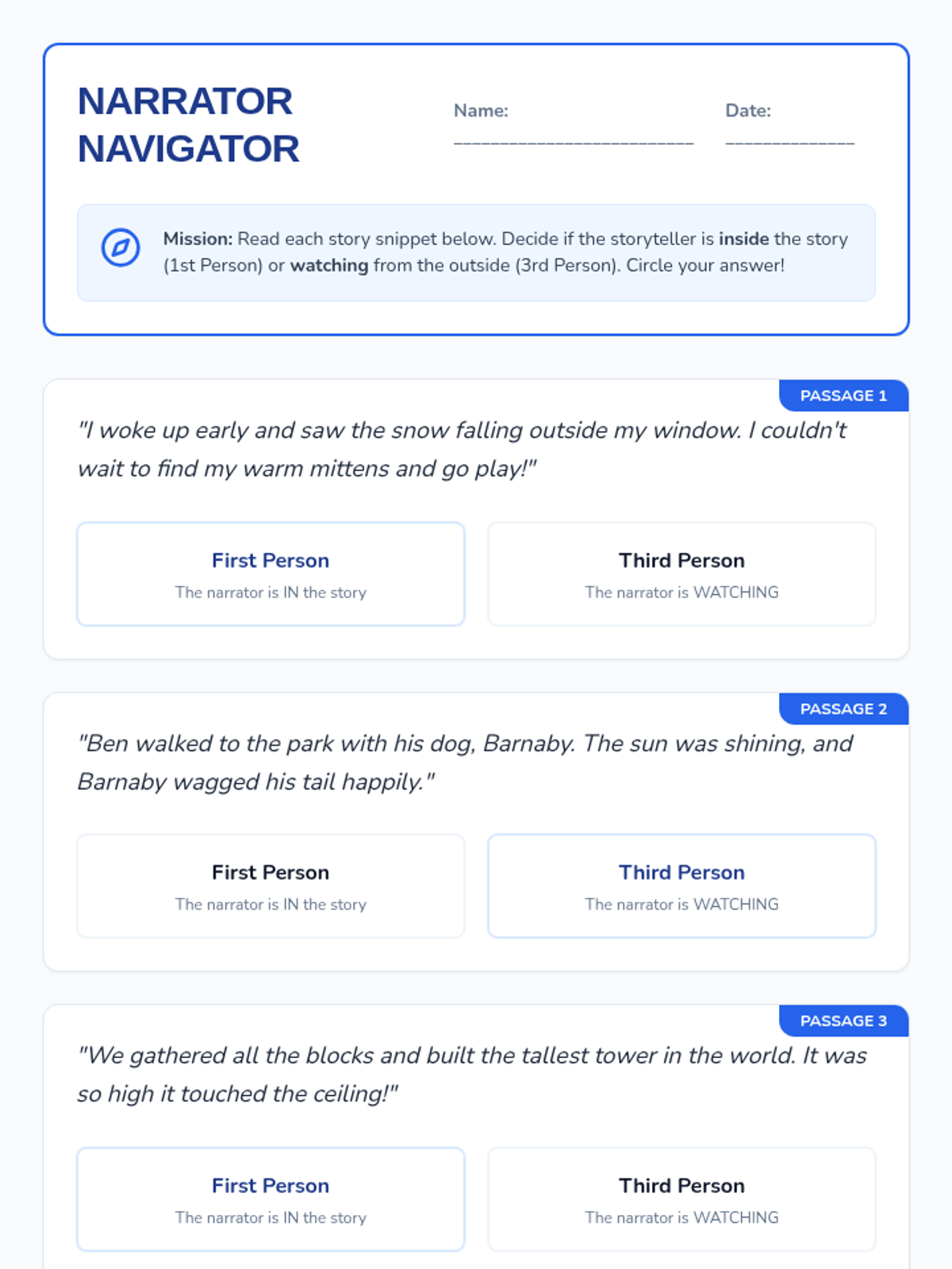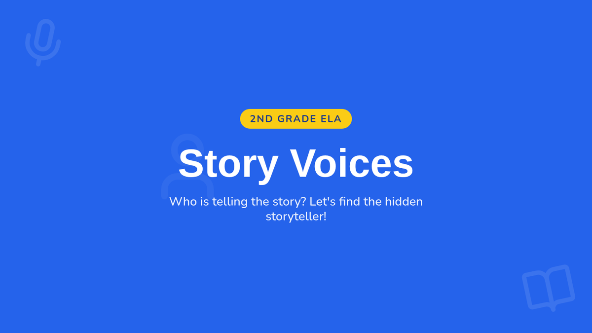 Students are introduced to the concept of a narrator as the person or character telling a story through a hands-on 'hat' demonstration and comparative listening.