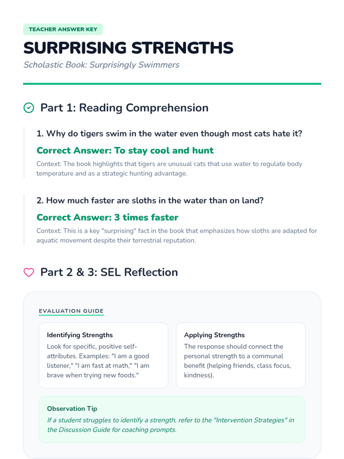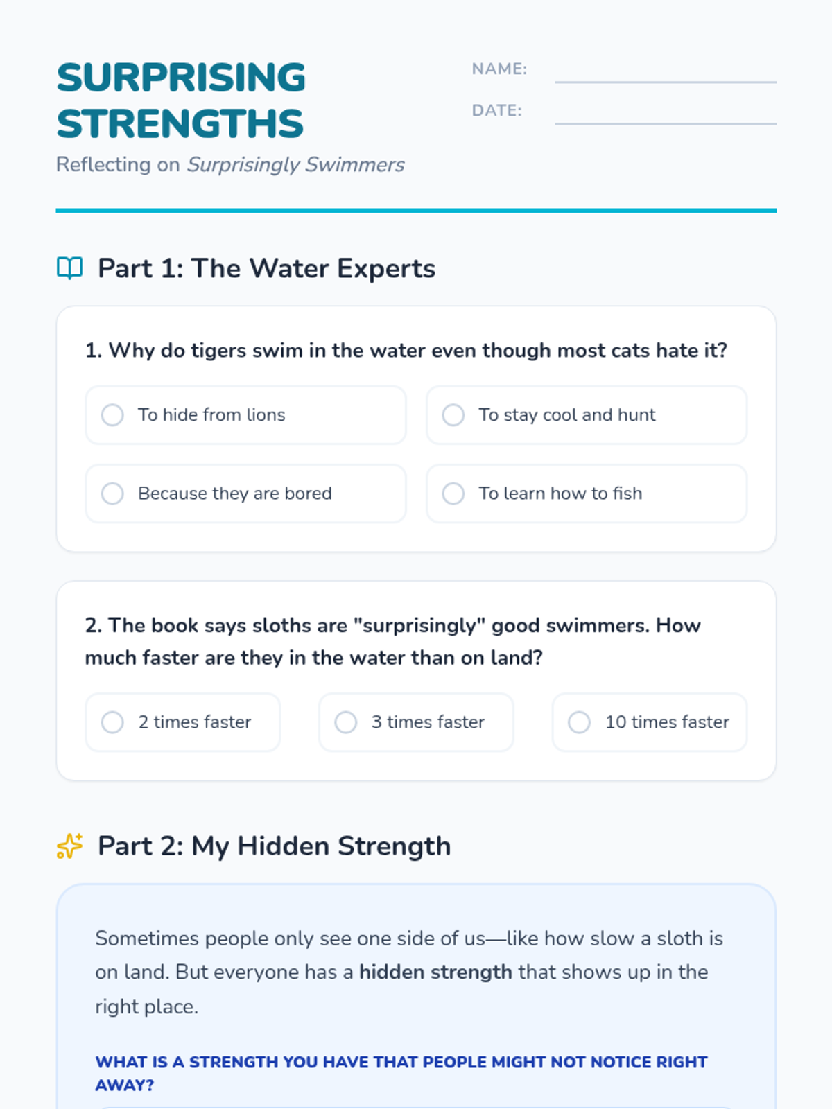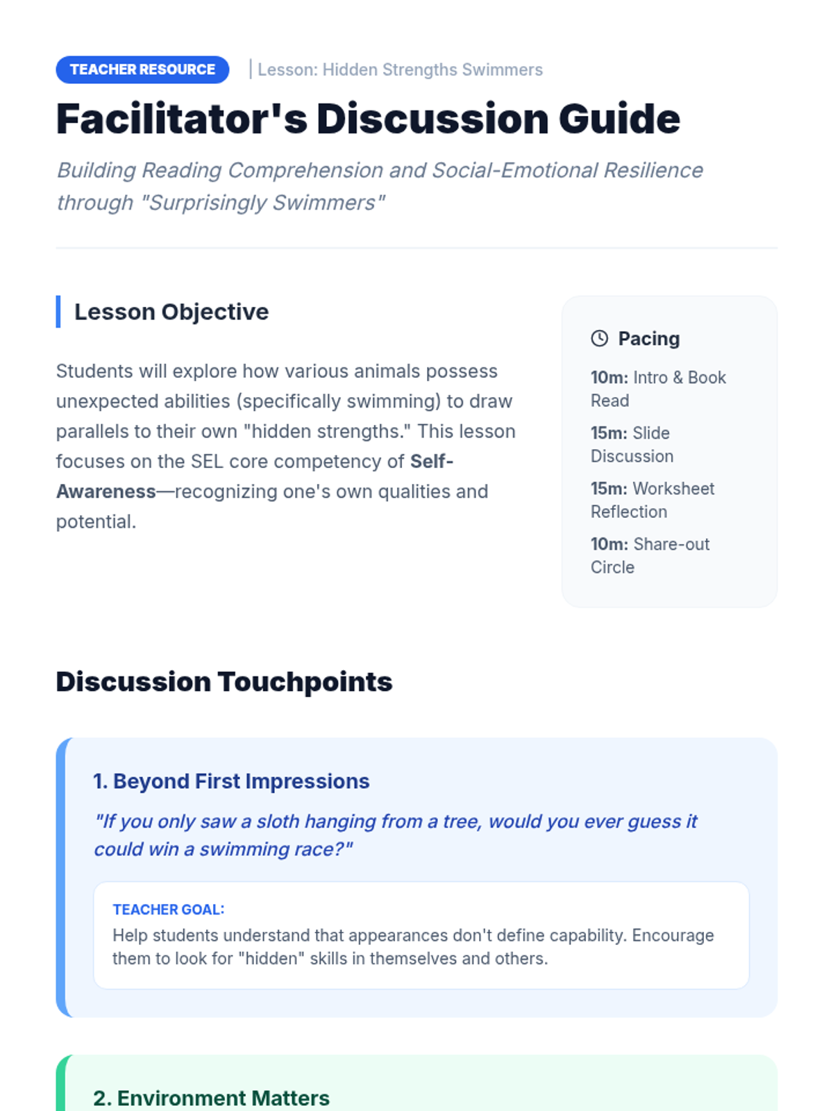 A lesson focused on the Scholastic book 'Surprisingly Swimmers', blending reading comprehension with social-emotional reflections on hidden strengths and perseverance.