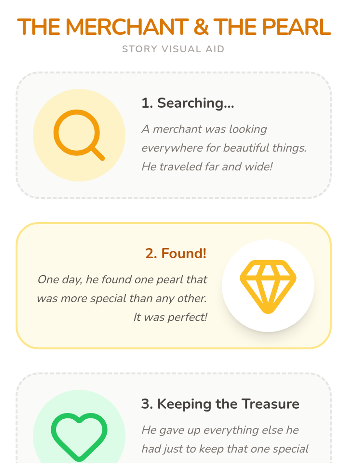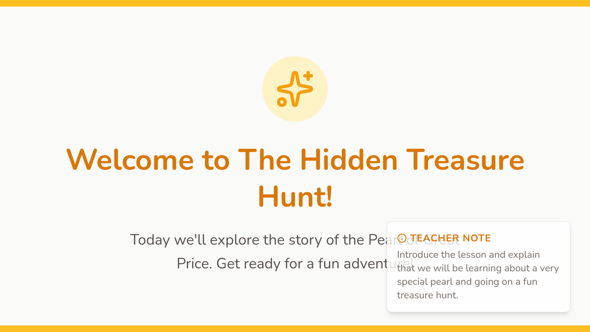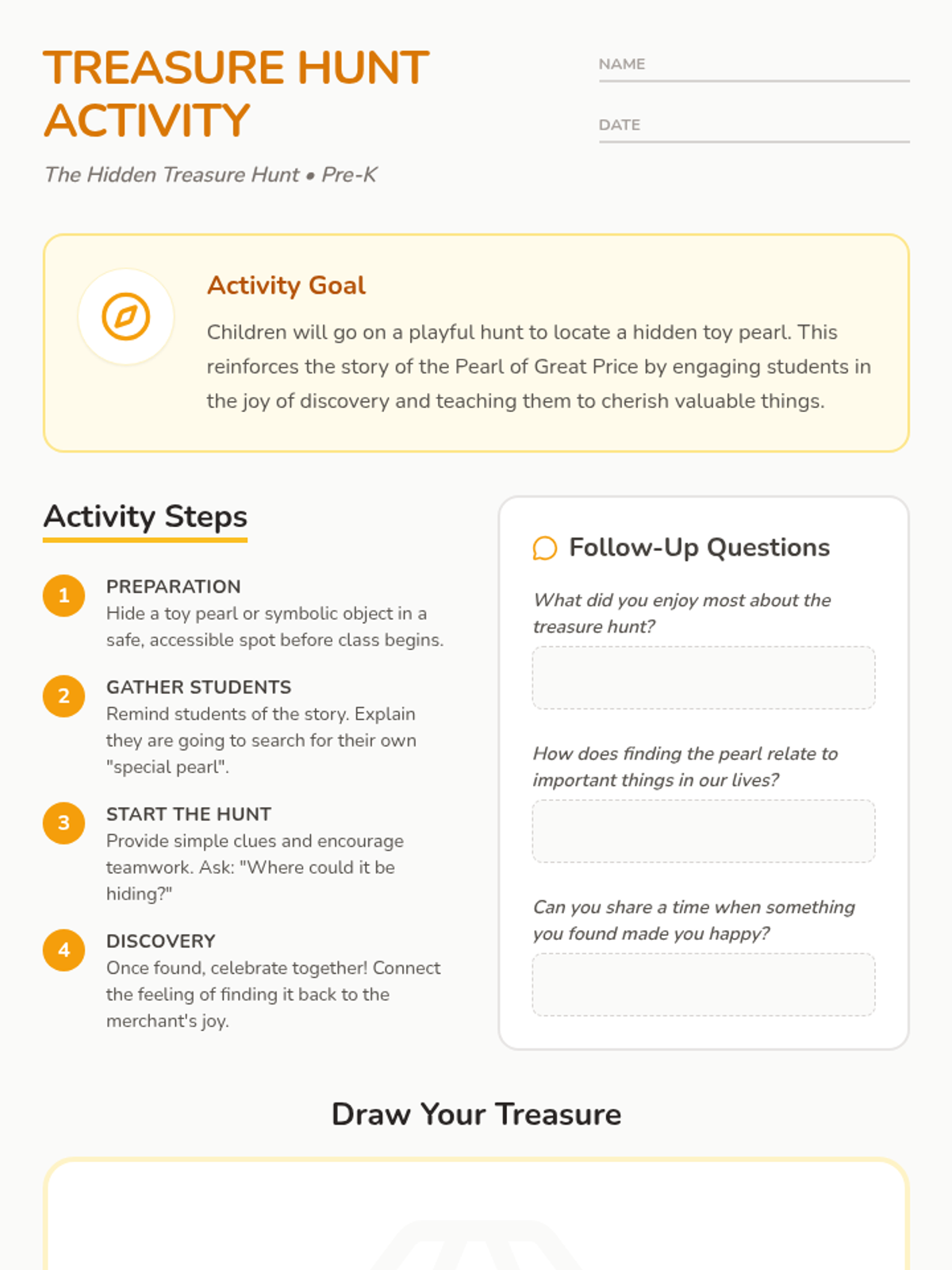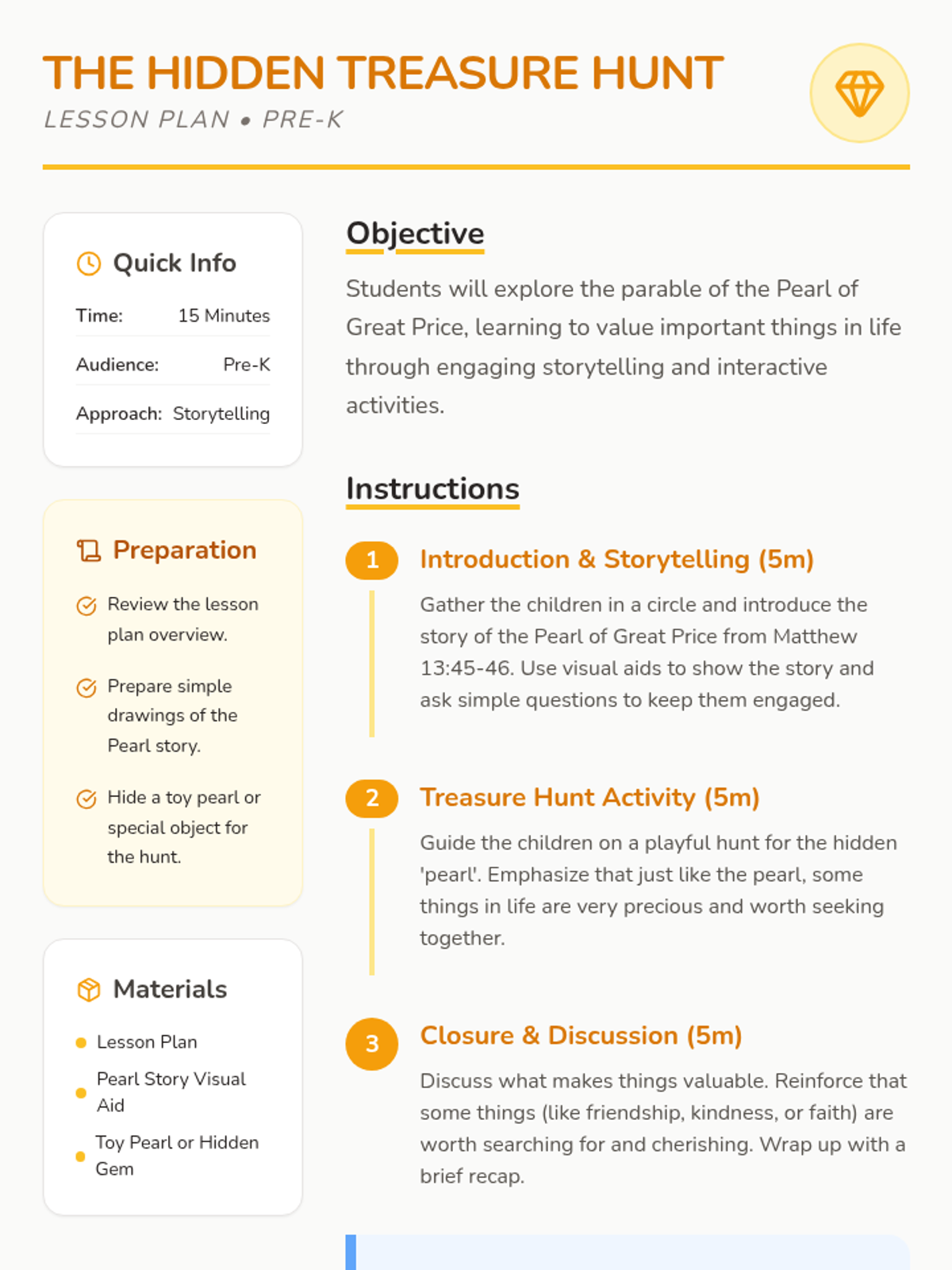 A 15-minute Pre-K lesson exploring the parable of the Pearl of Great Price through interactive storytelling and a classroom treasure hunt. Students learn about the value of finding and cherishing things that are truly special.
