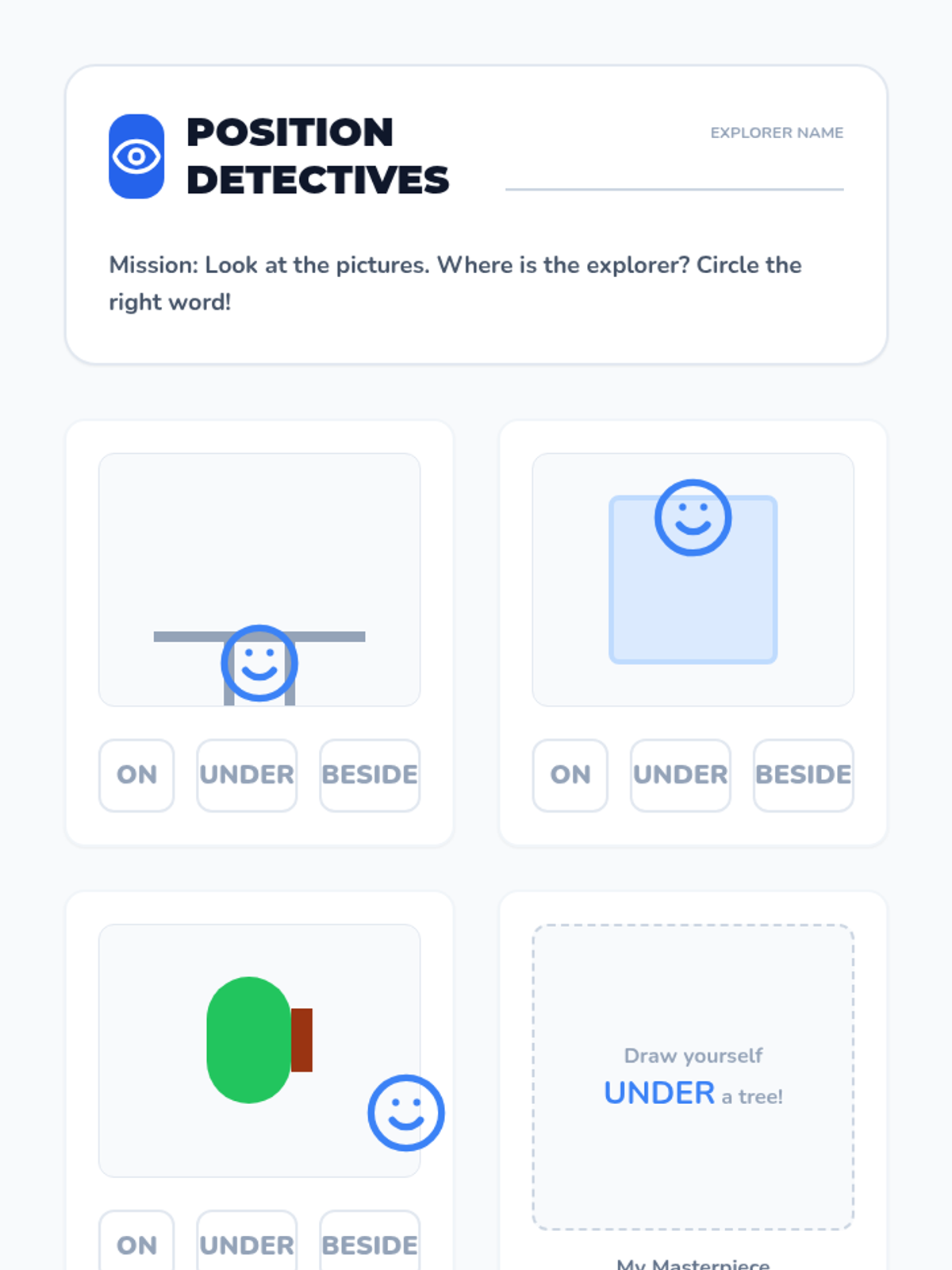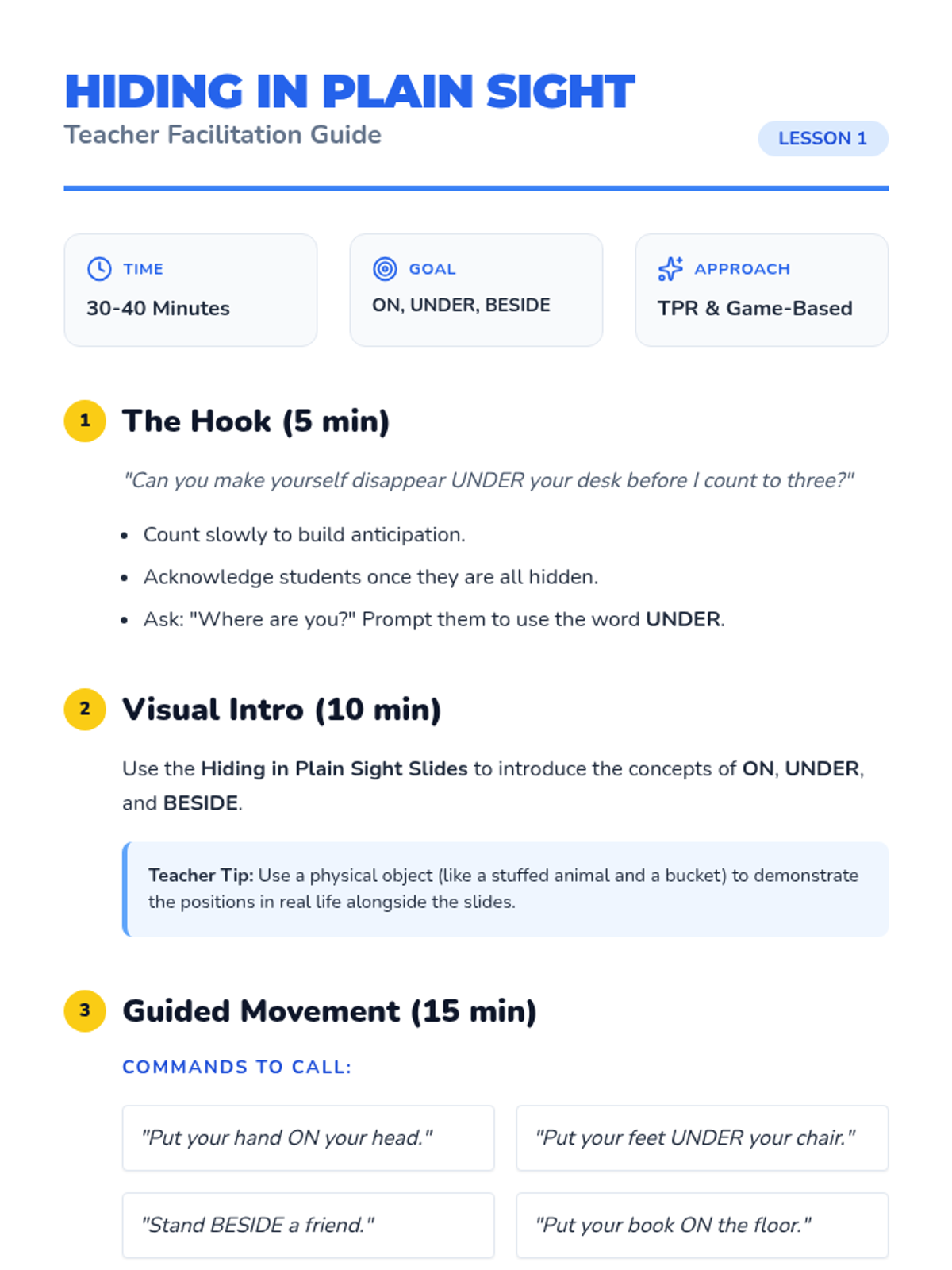 Students participate in a total physical response activity to build muscle memory for spatial vocabulary terms like 'under,' 'on,' and 'beside'.