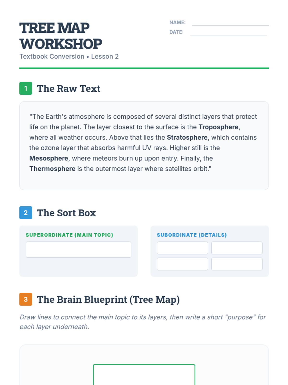 Focuses on hierarchical structures (main ideas and supporting details). Students learn to convert dense text into tree maps and concept webs, practicing the distinction between superordinate and subordinate information.