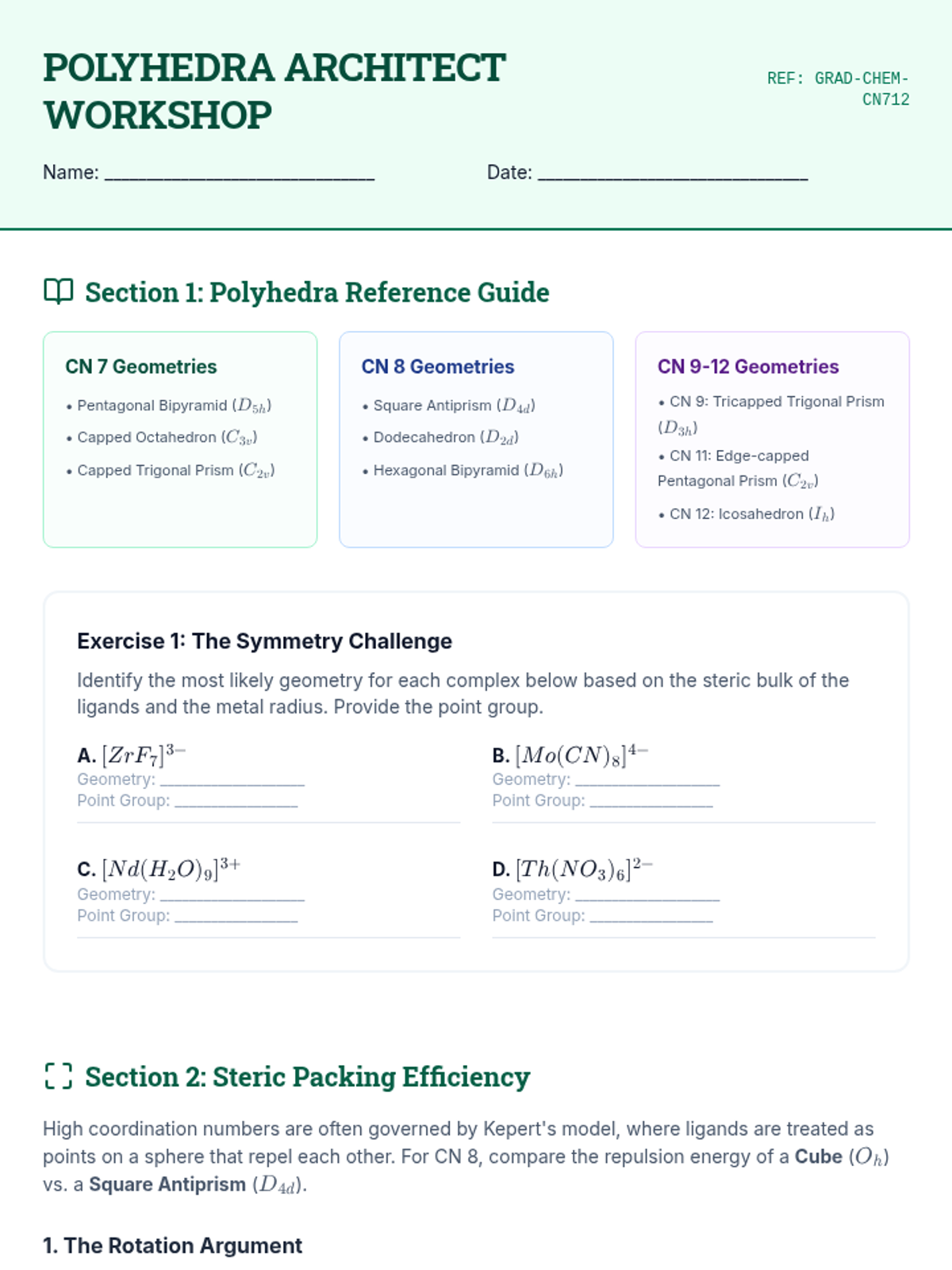 Moving beyond coordination number 6, learners explore the geometries of lanthanide and actinide complexes (CN 7-12). Topics include polyhedra packing efficiency and fluxional behavior in solution.