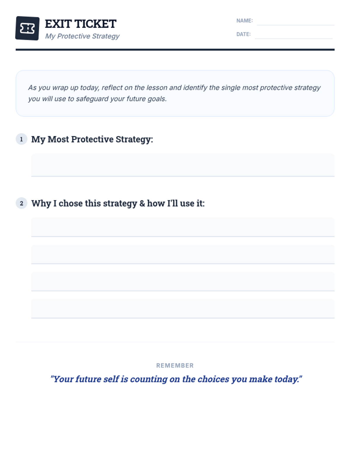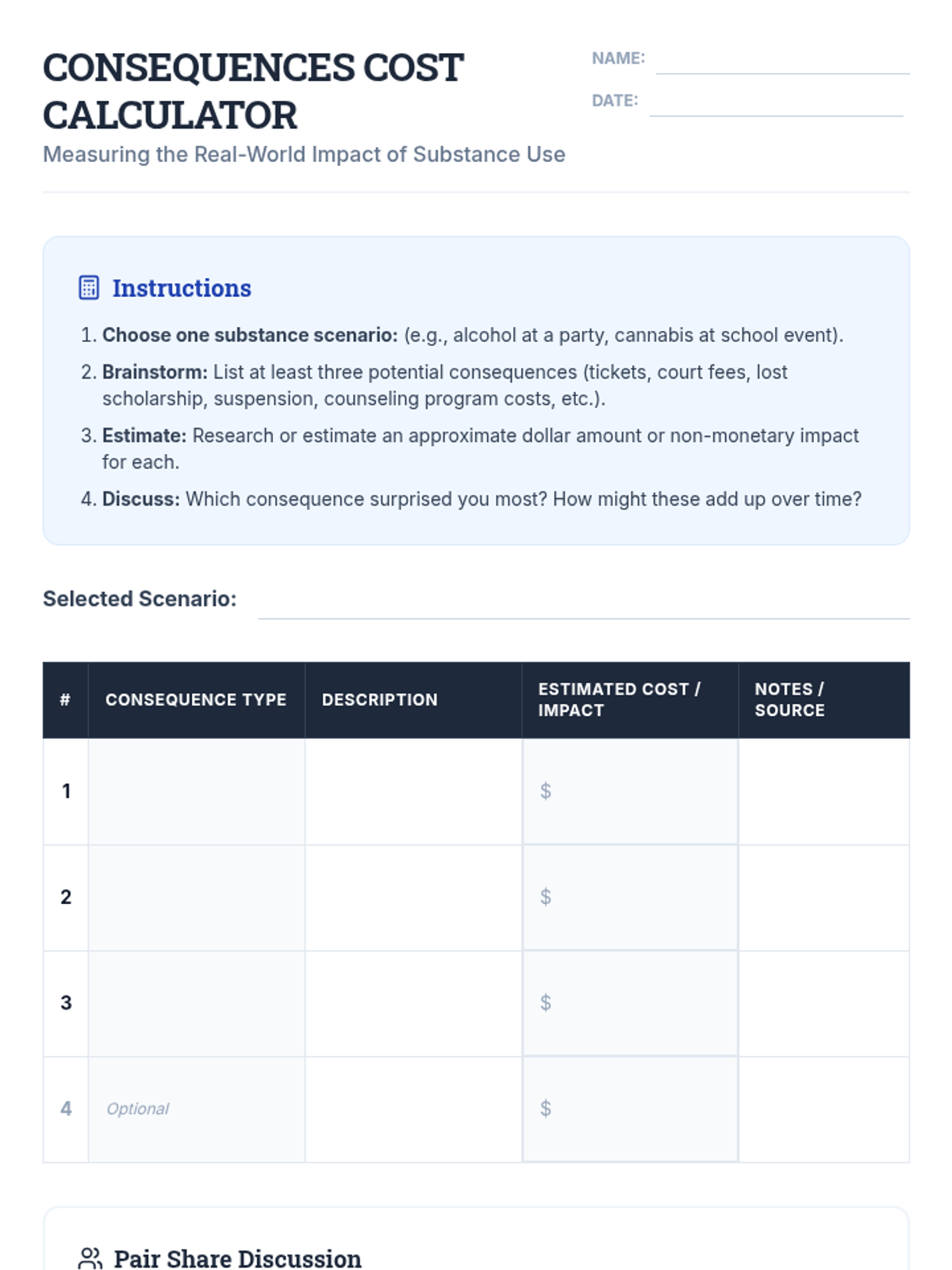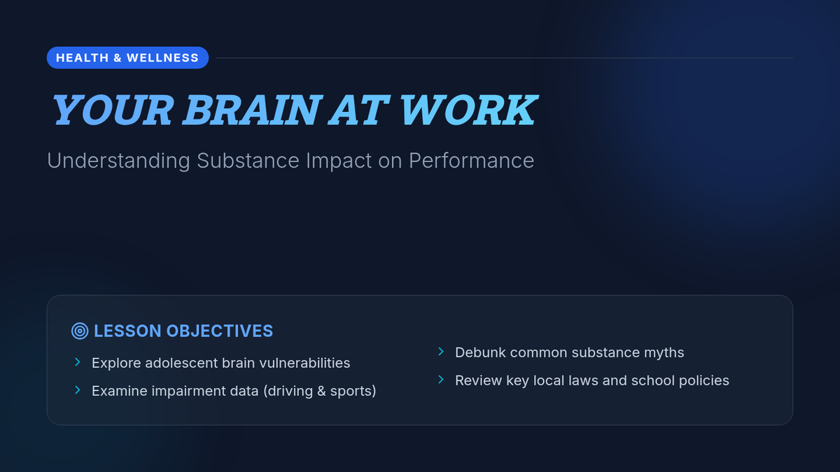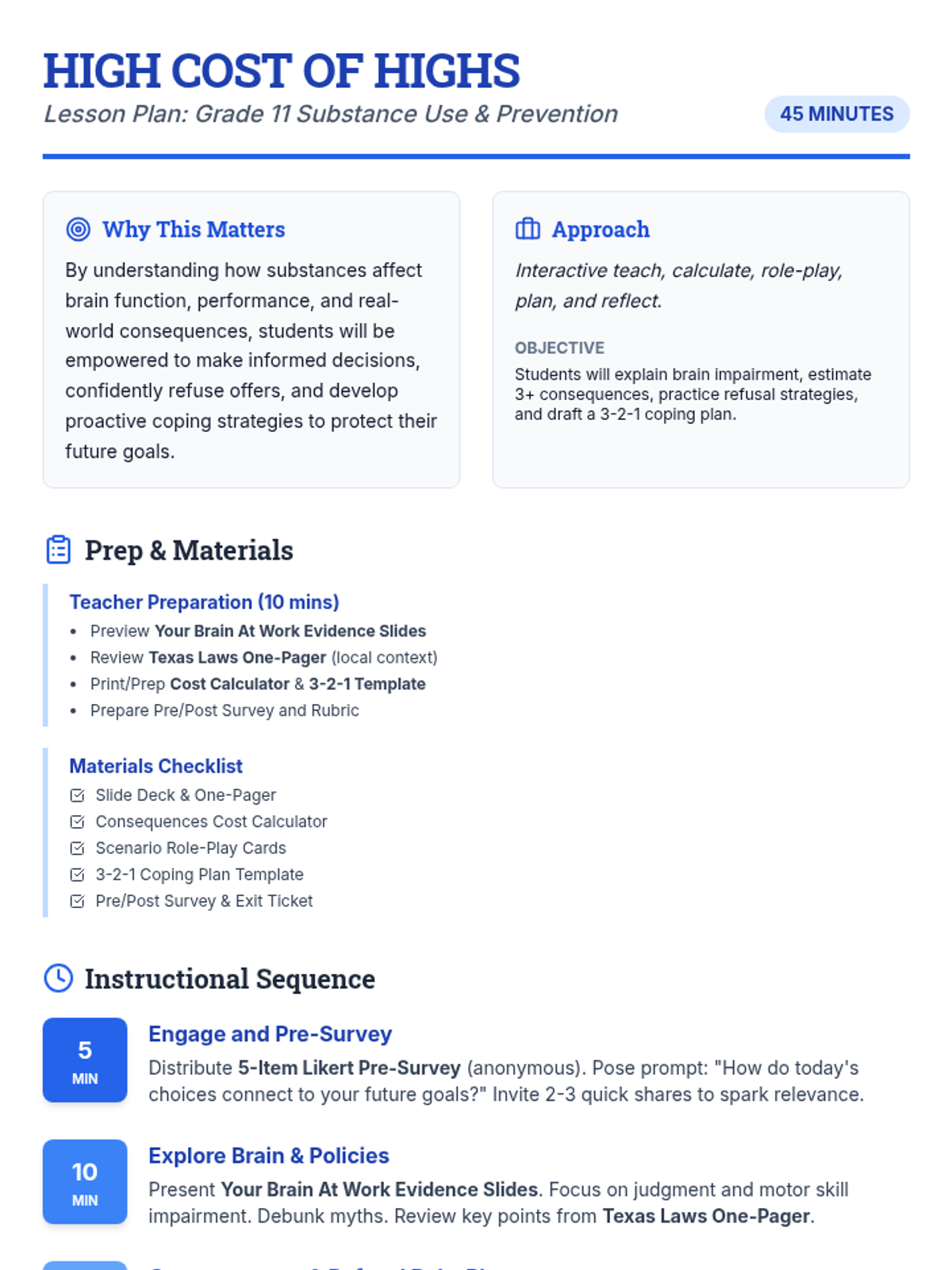 A 45-minute lesson for 11th graders exploring how substances impair the adolescent brain and performance, potential consequences, and refusal strategies. Includes a personalized 3-2-1 coping plan to protect future goals.