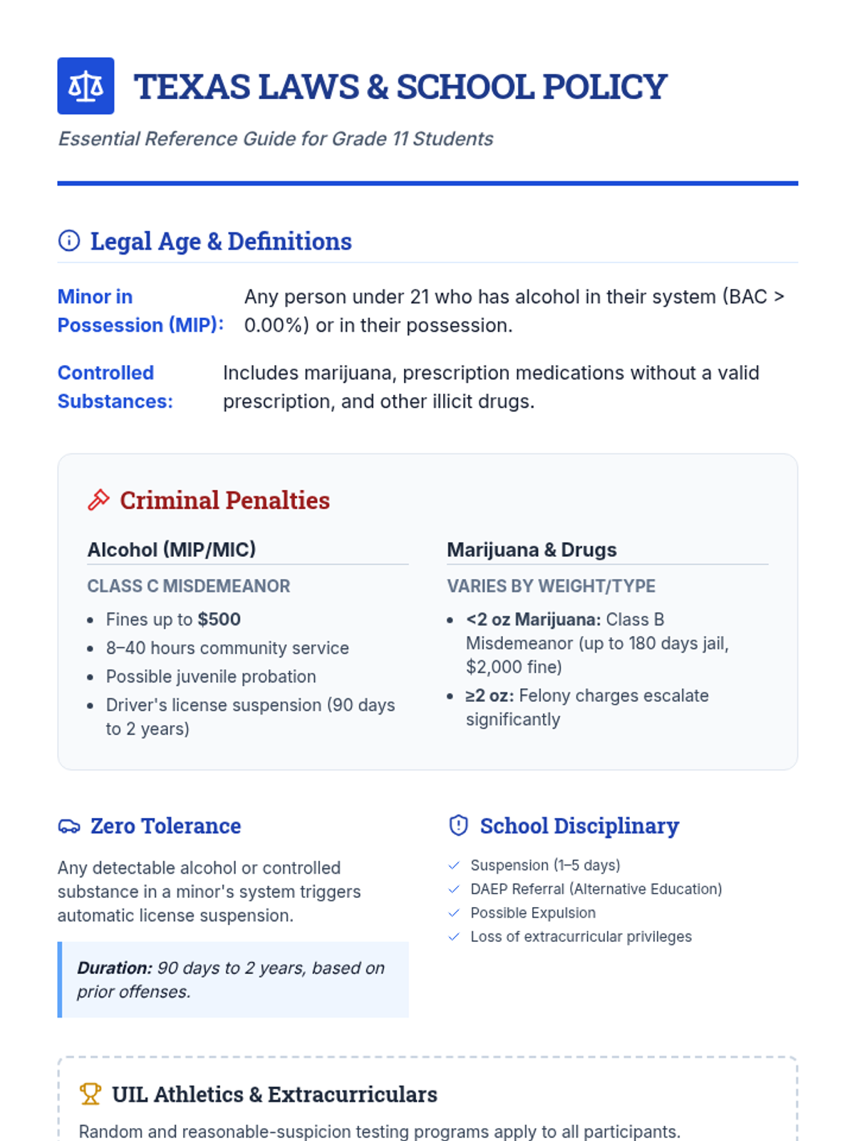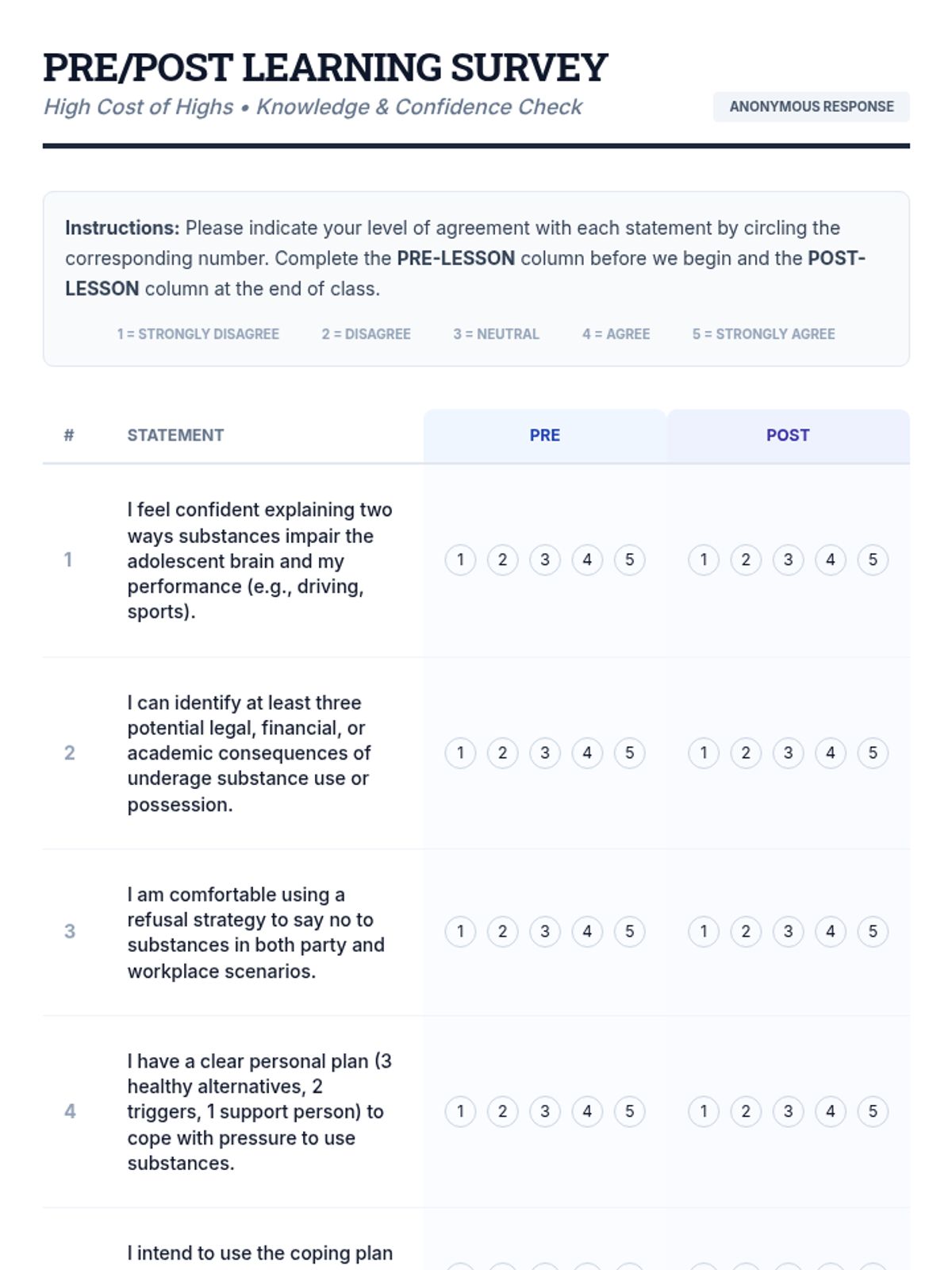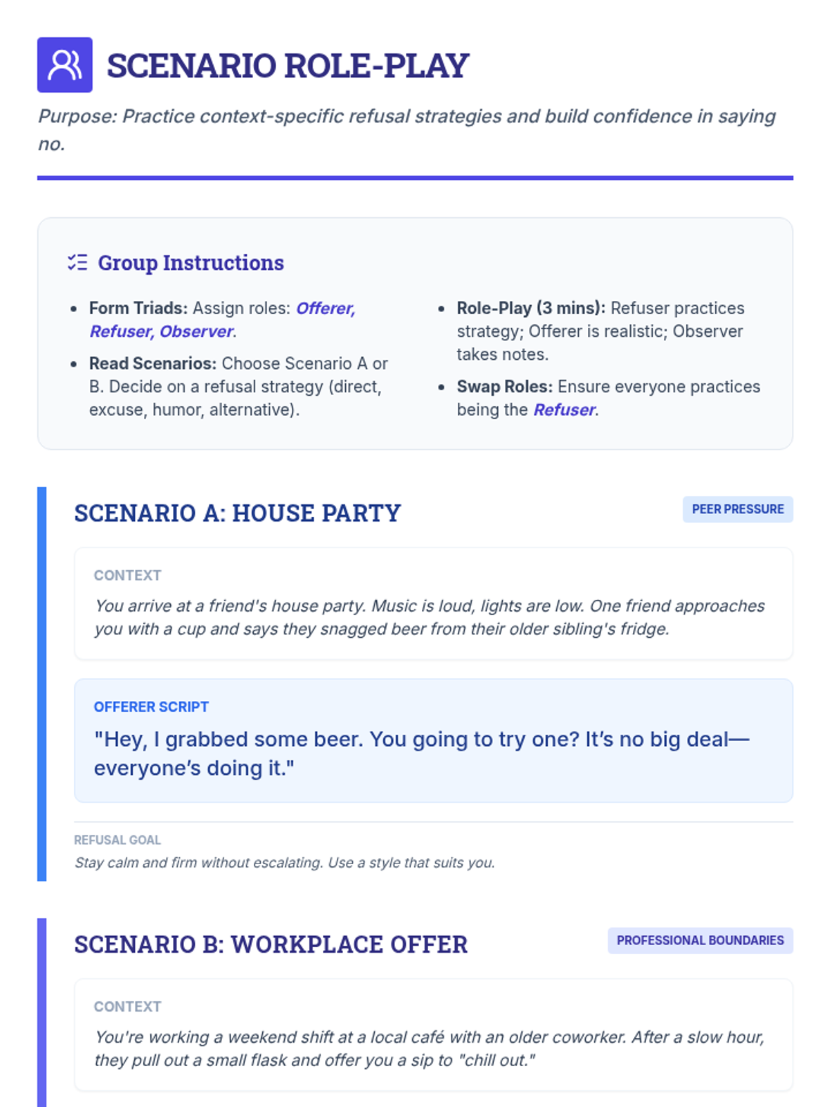 A 45-minute lesson for 11th graders exploring how substances impair the adolescent brain and performance, potential consequences, and refusal strategies. Includes a personalized 3-2-1 coping plan to protect future goals.