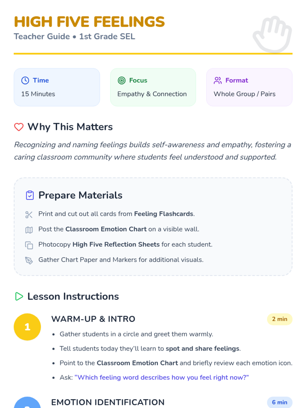 In this 15-minute Tier 1 SEL lesson for 1st graders, students explore emotions and build positive classroom connections through interactive activities, helping them identify feelings, practice empathy, and foster a supportive community.
