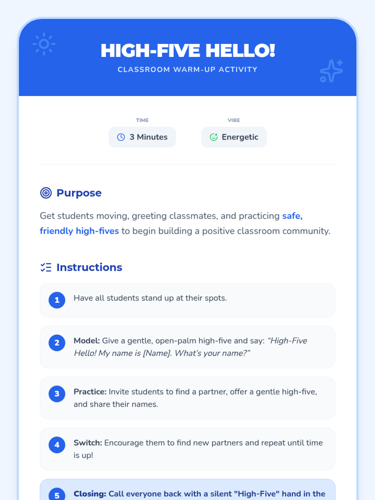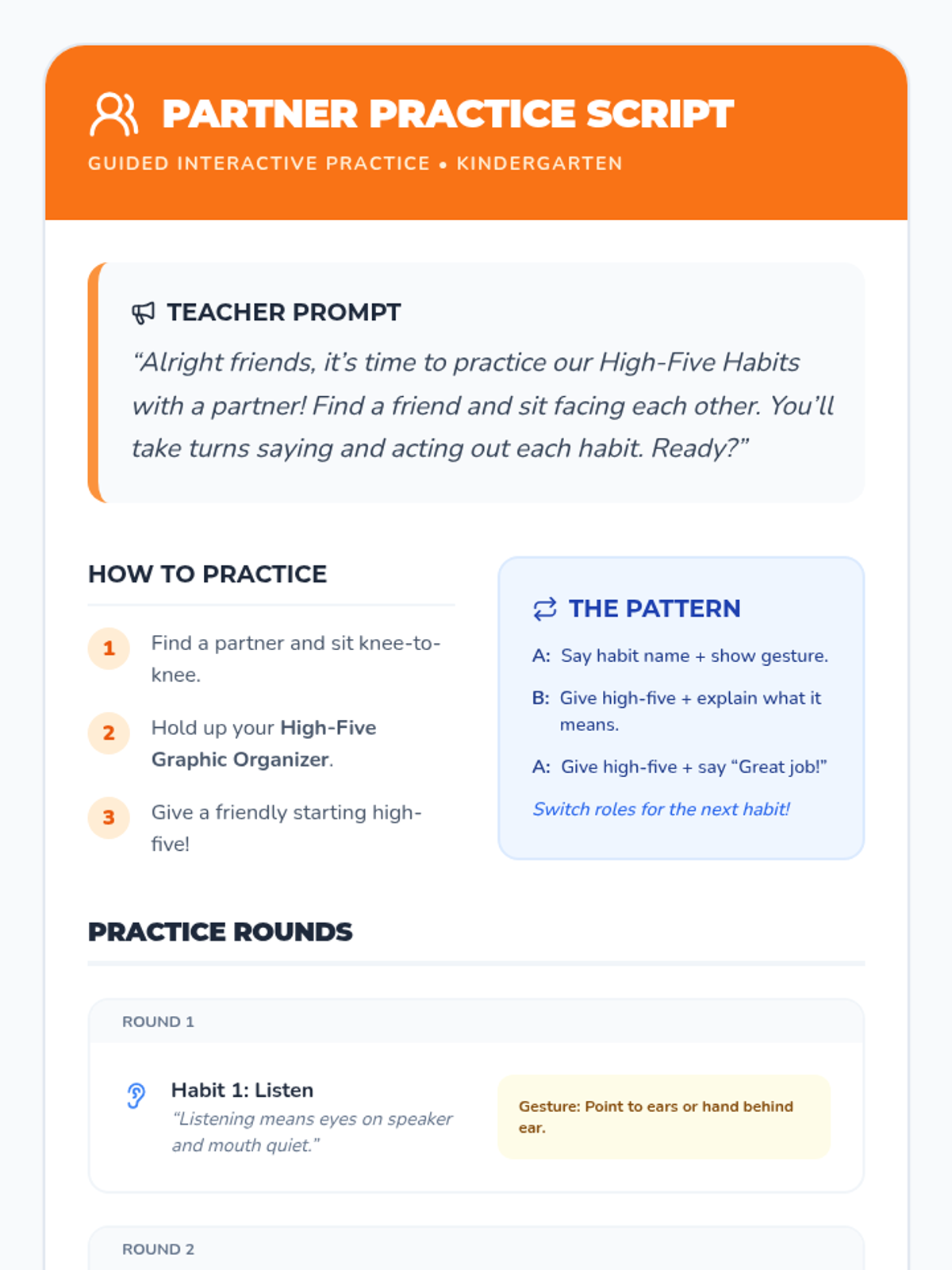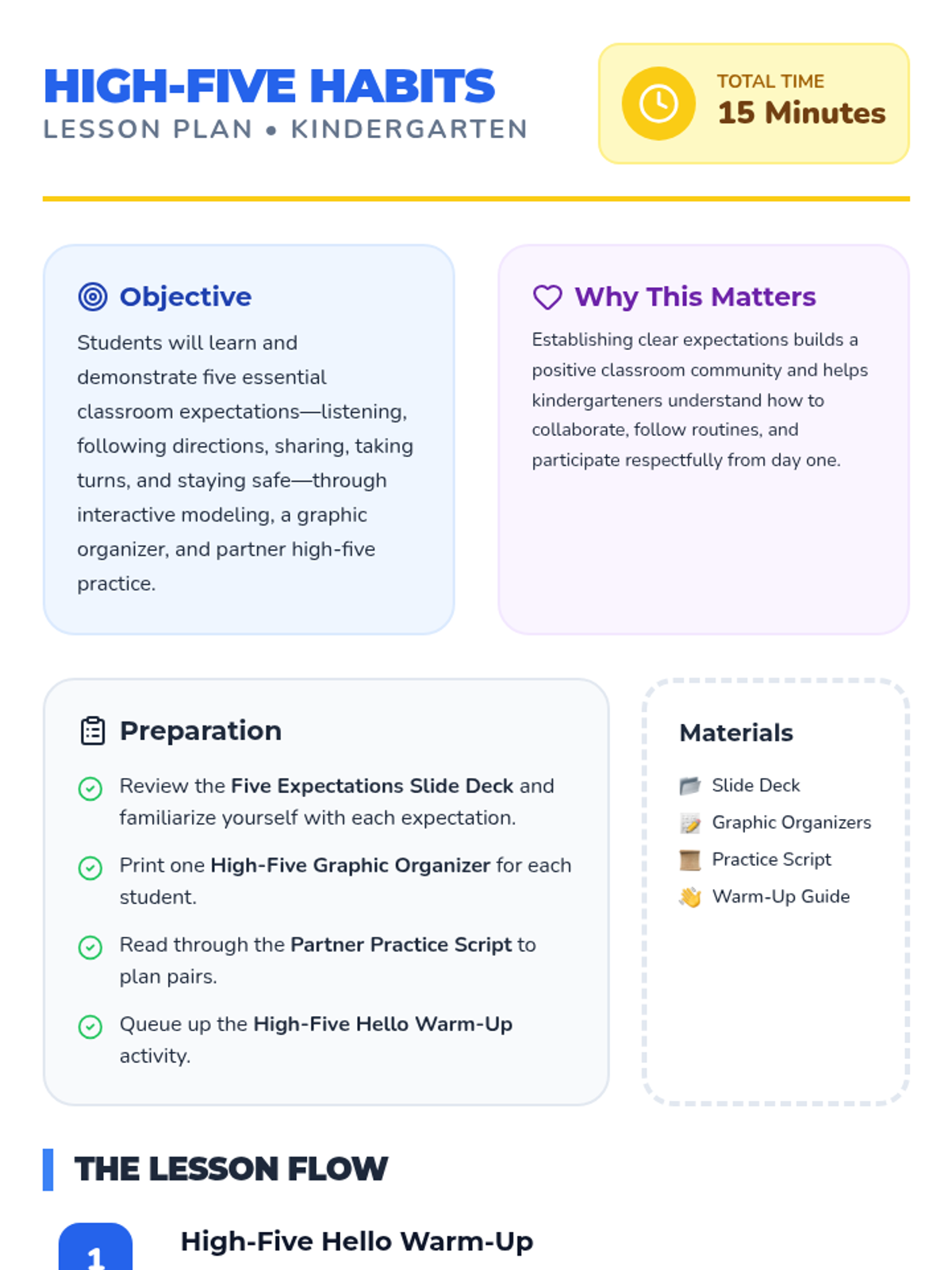A 15-minute kindergarten lesson focused on building classroom community by teaching five essential expectations through interactive modeling and partner practice.