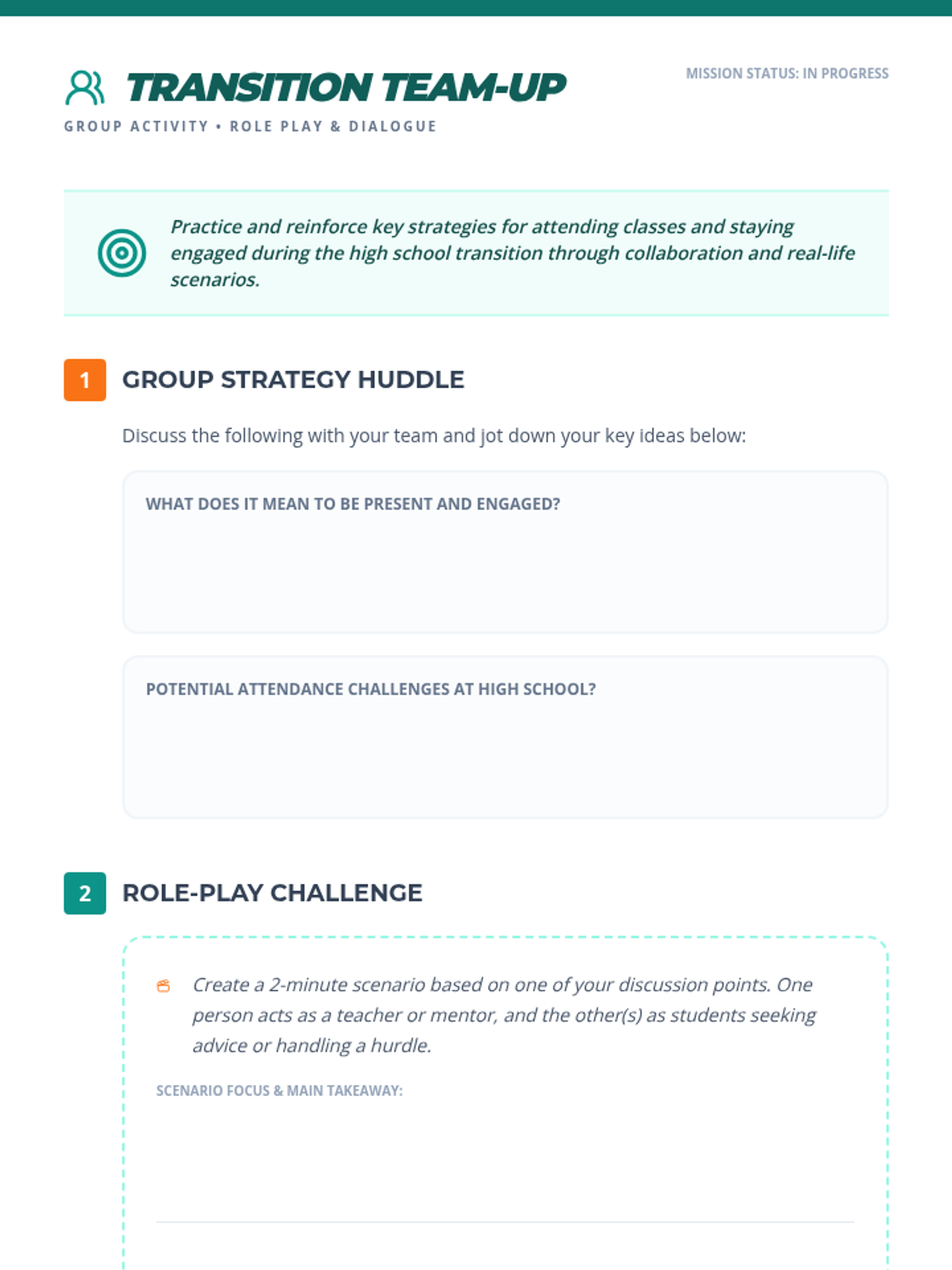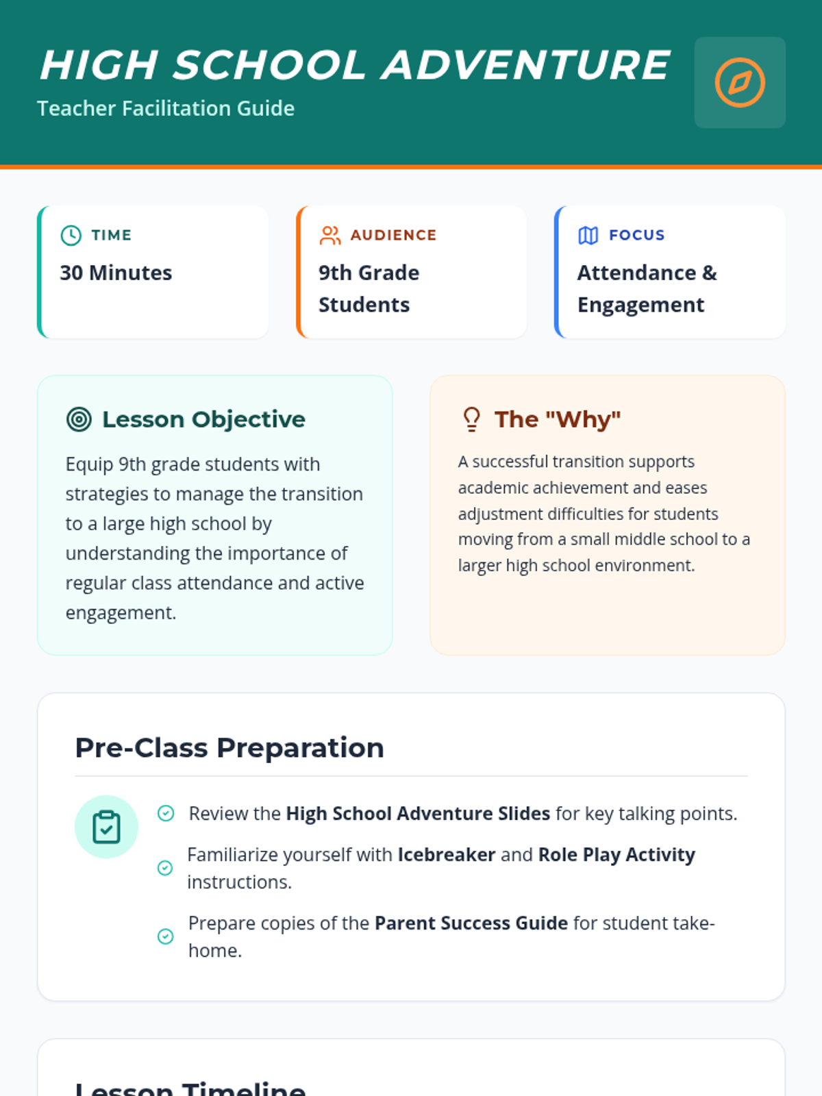 A Tier 2 small group lesson for 9th graders focusing on the transition to high school, specifically emphasizing engagement and attendance.