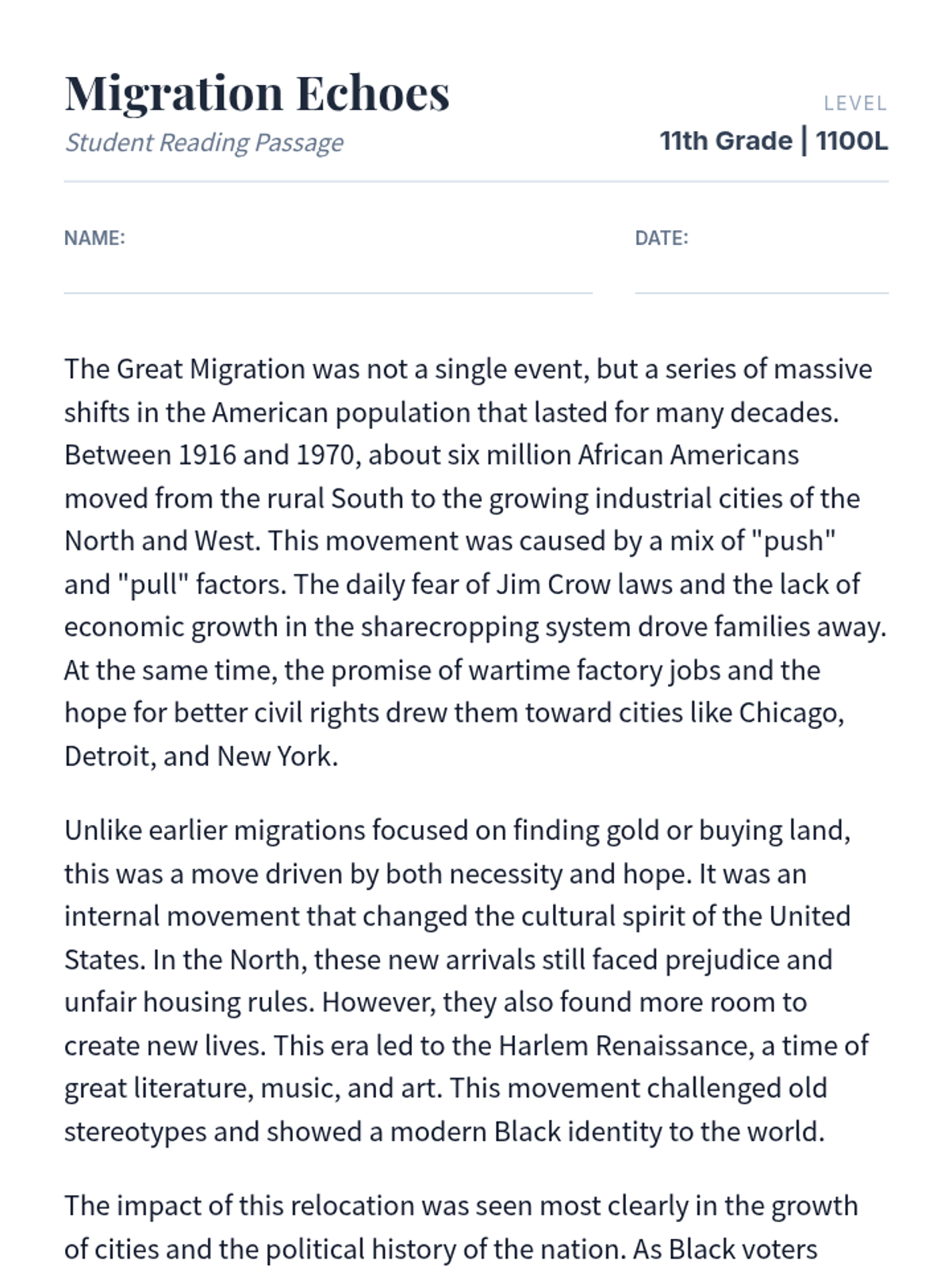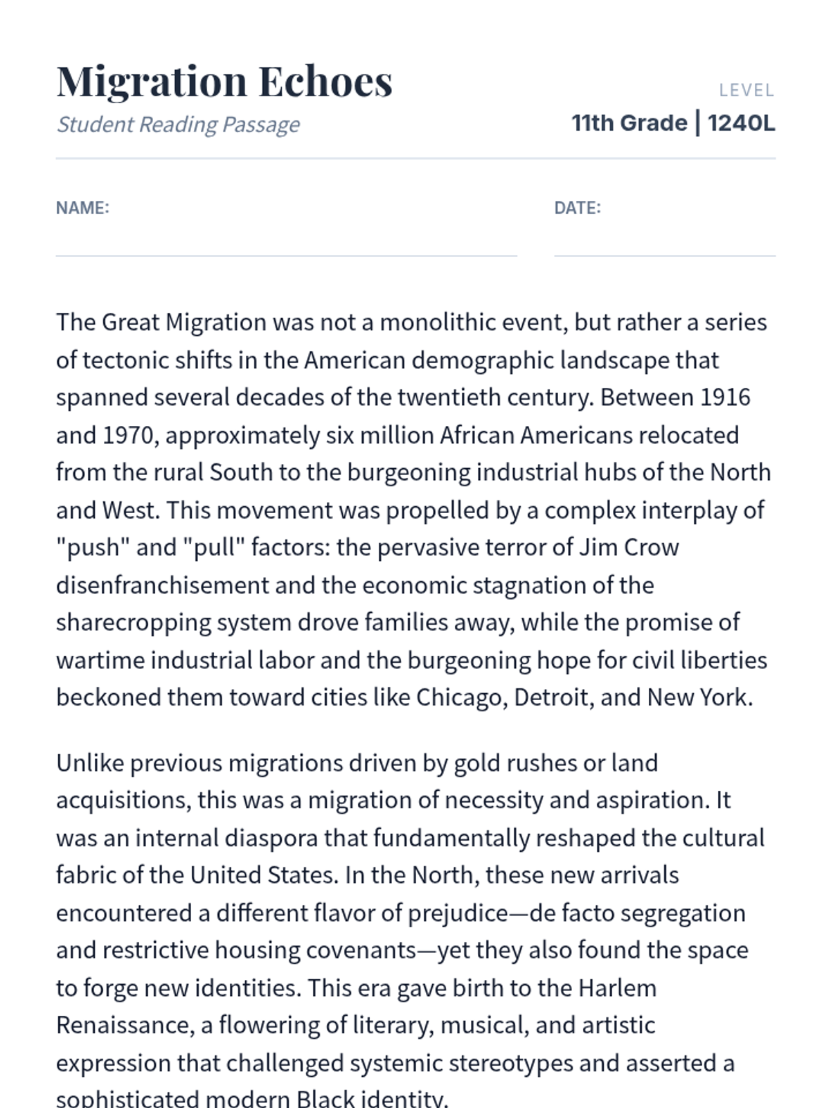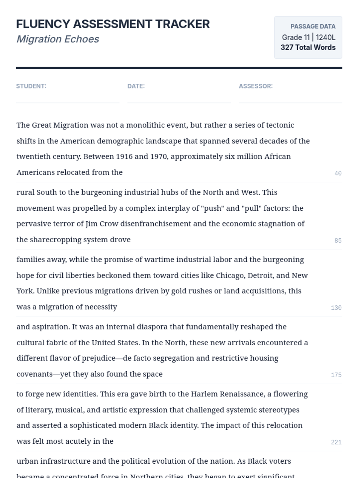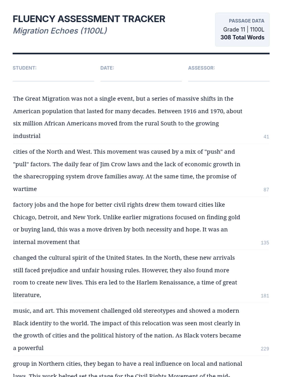 An 11th-grade reading fluency assessment featuring a complex informational text about the Great Migration, designed to measure accuracy, rate, and prosody.