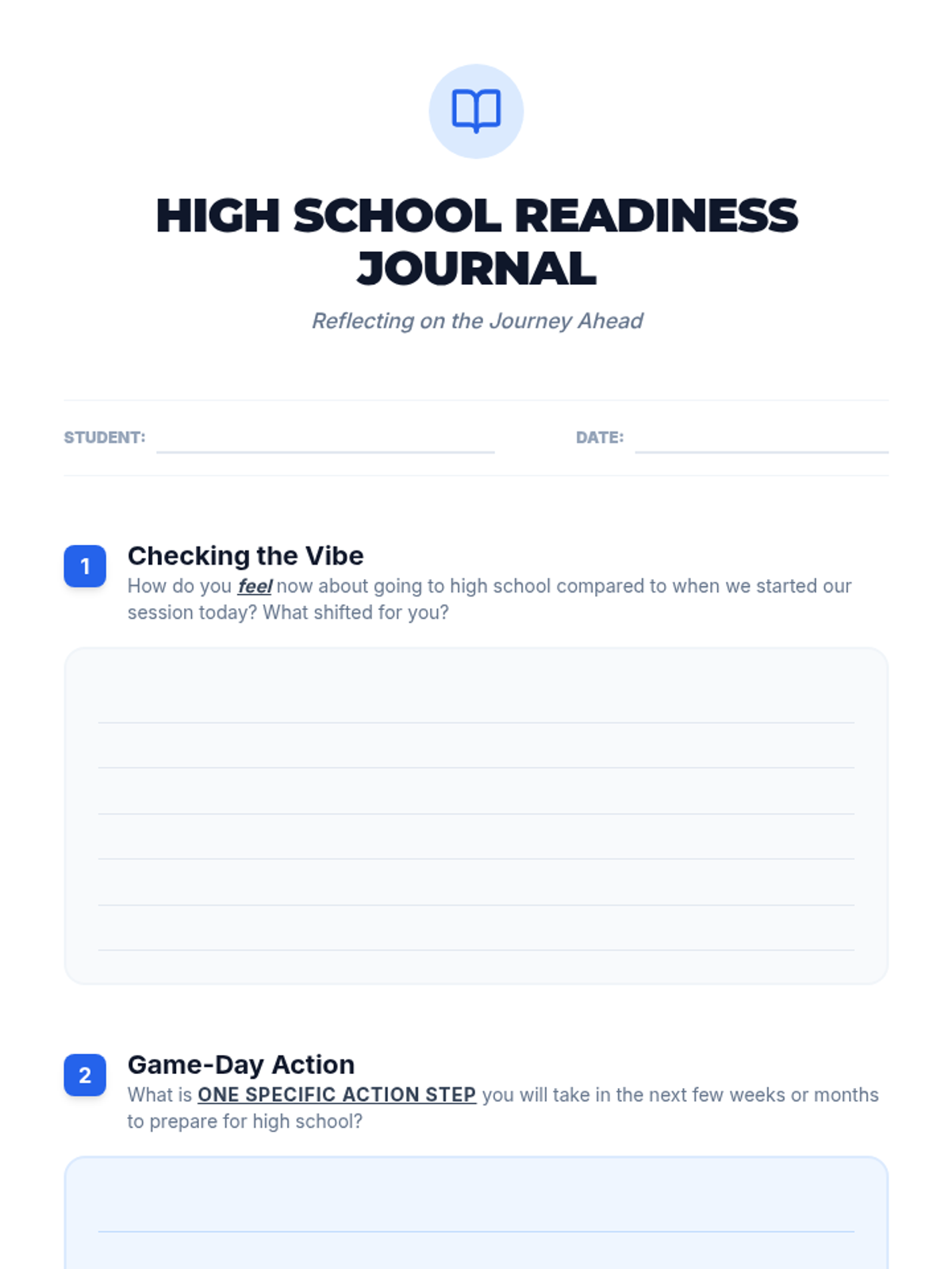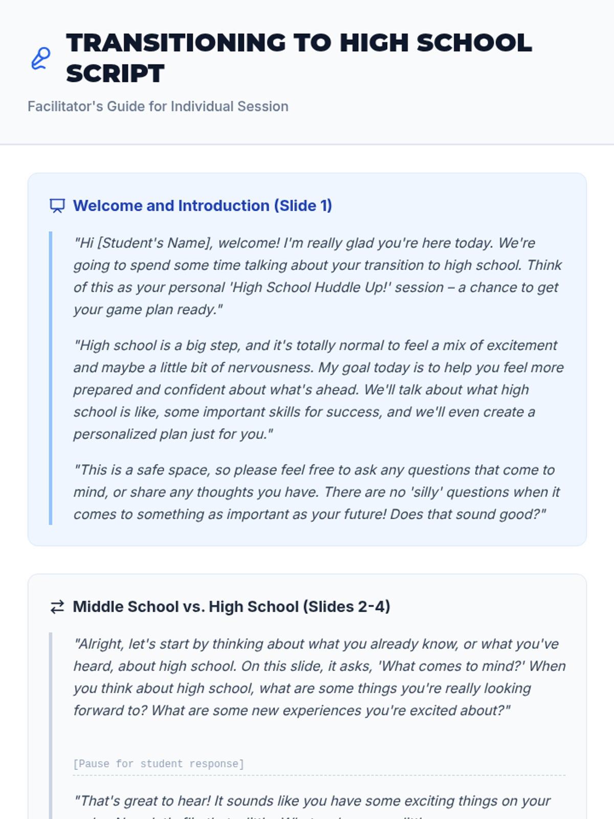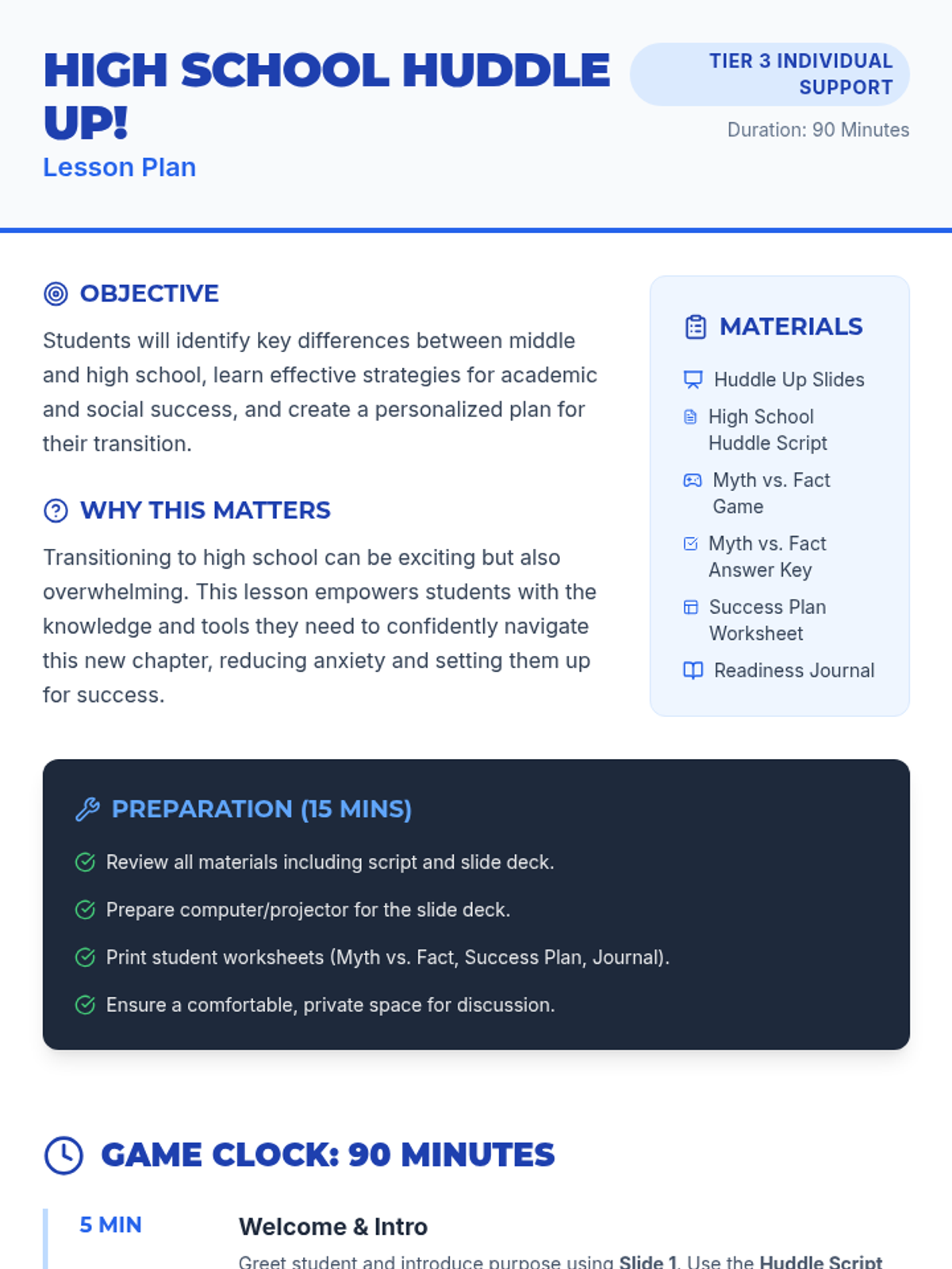 A comprehensive 90-minute individual session for 8th-grade students to ease the transition to high school by building skills, debunking myths, and creating a personalized success plan.