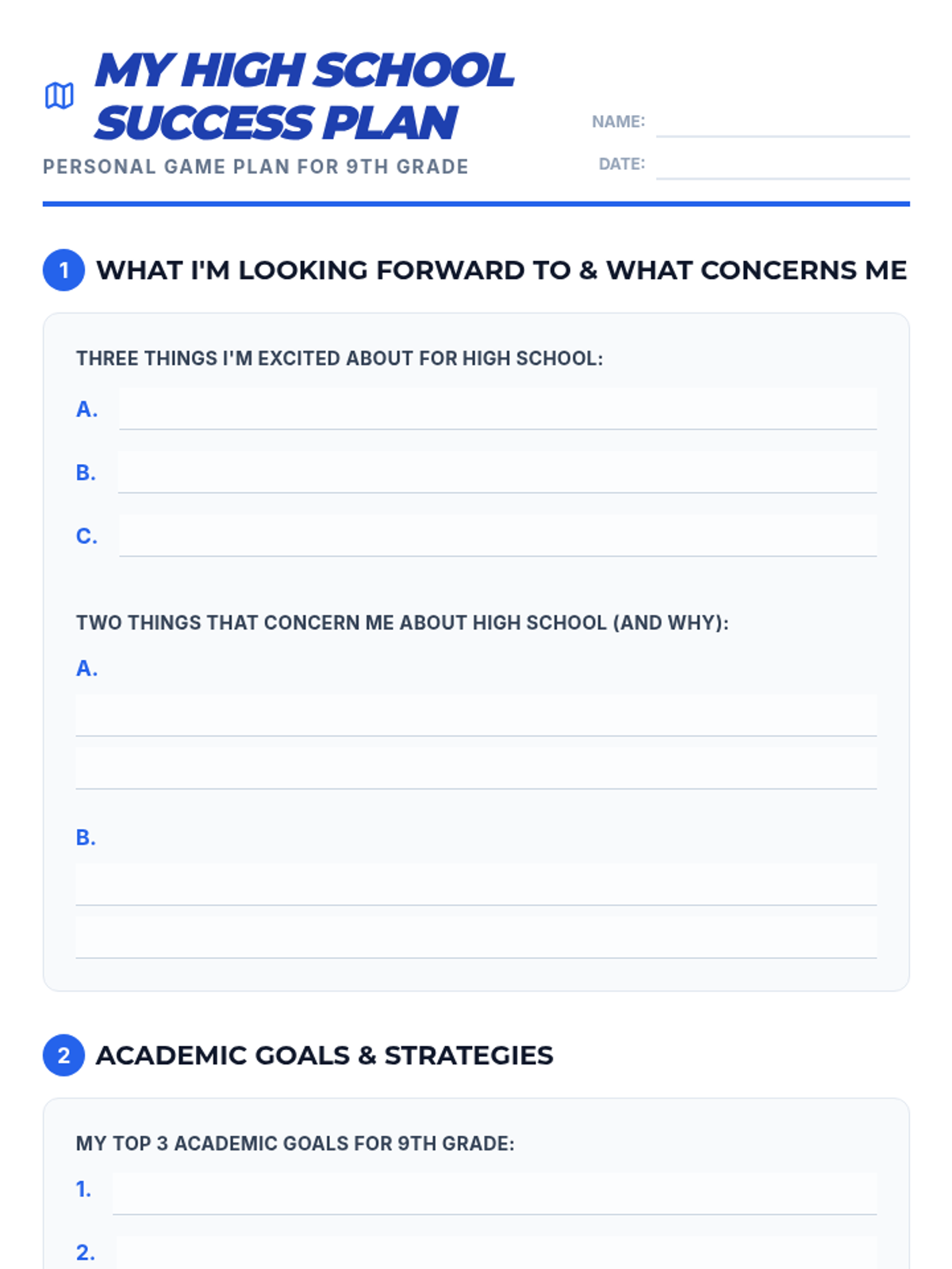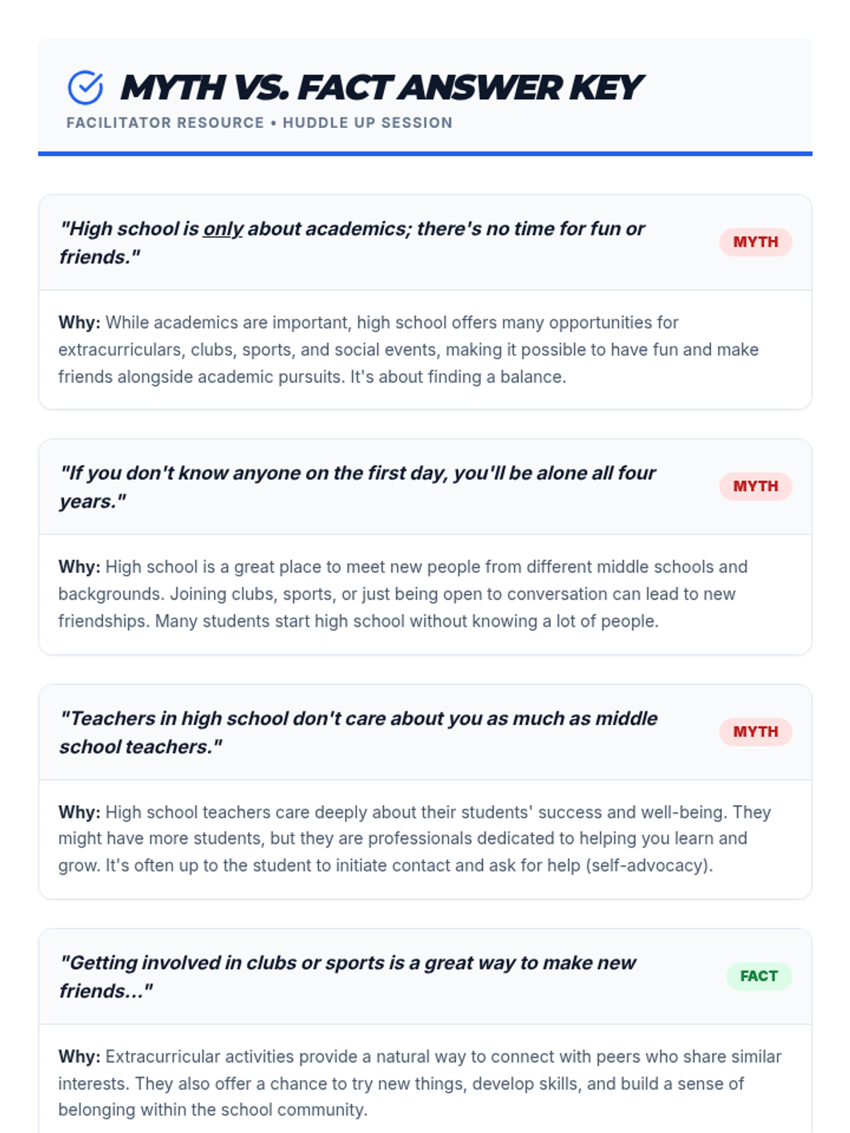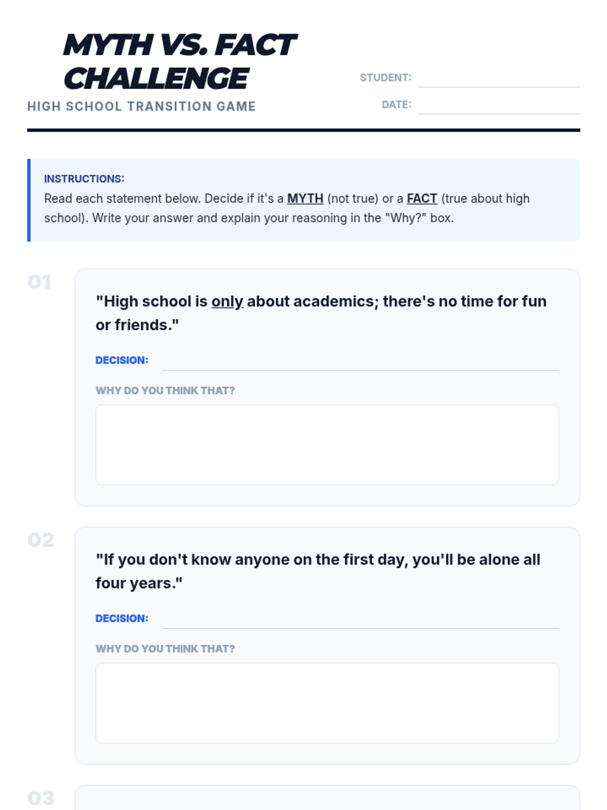 A comprehensive 90-minute individual session for 8th-grade students to ease the transition to high school by building skills, debunking myths, and creating a personalized success plan.
