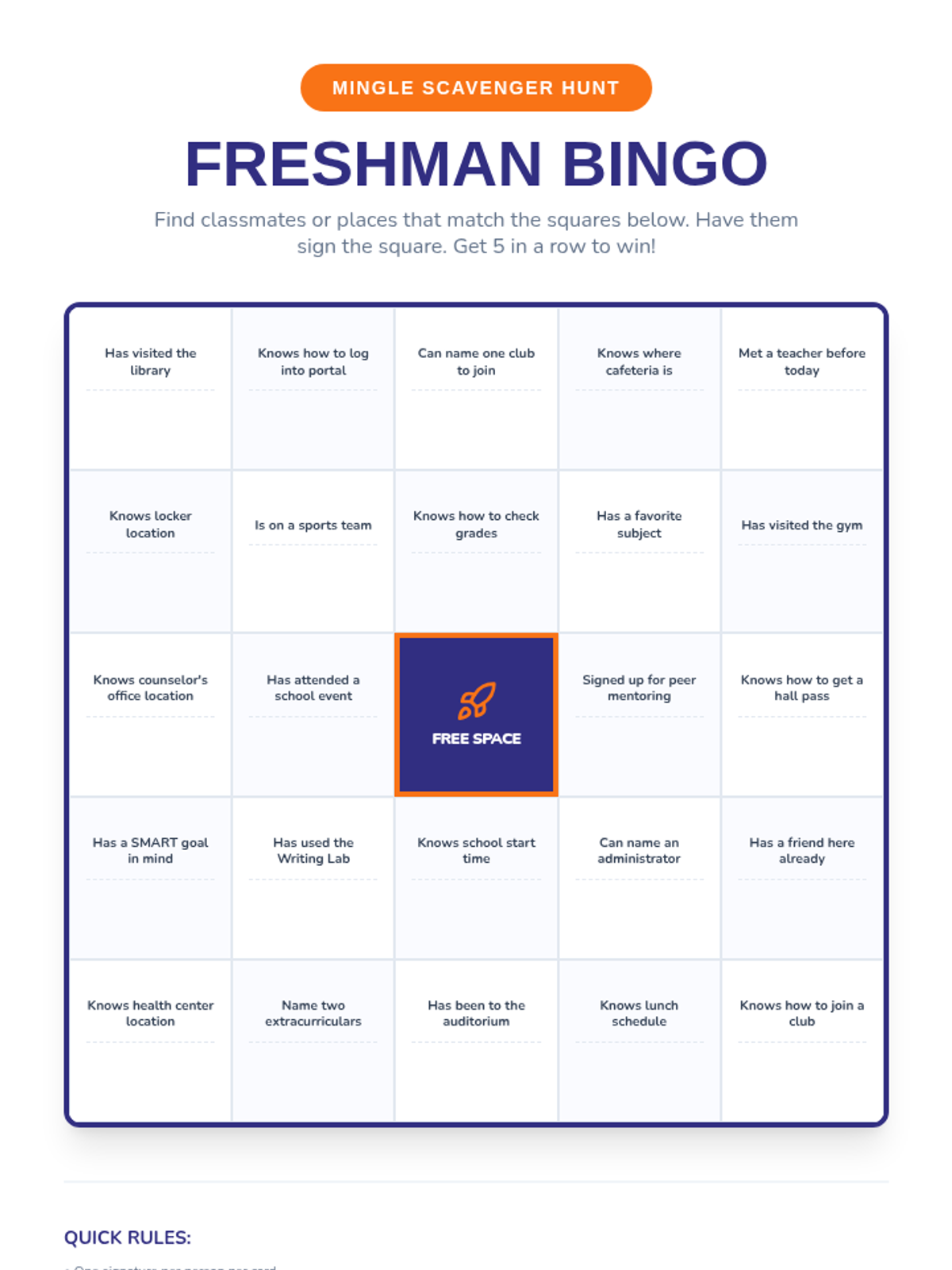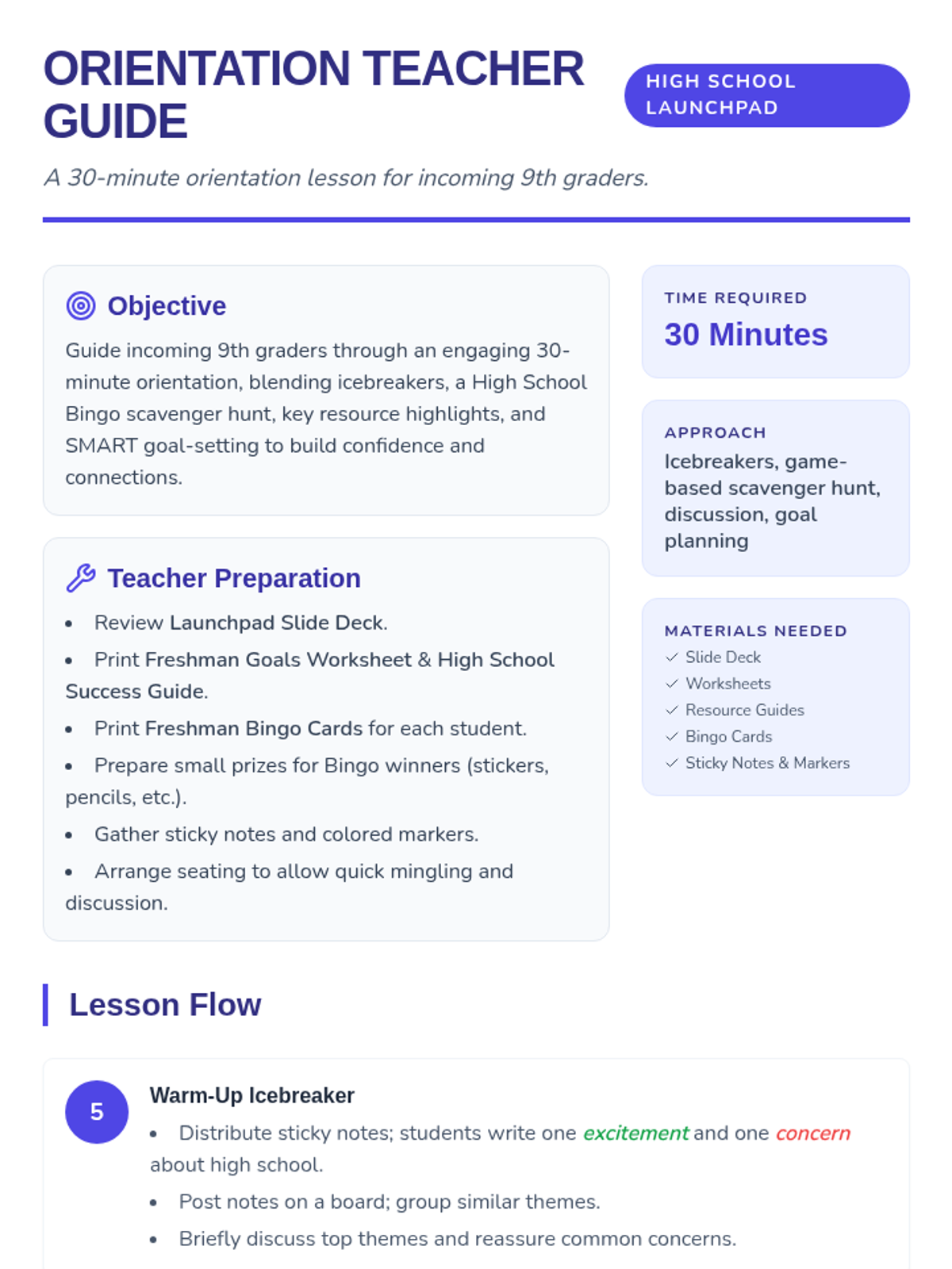 An engaging 30-minute orientation session for incoming 9th graders designed to ease the transition to high school through interactive activities, resource exploration, and goal setting.