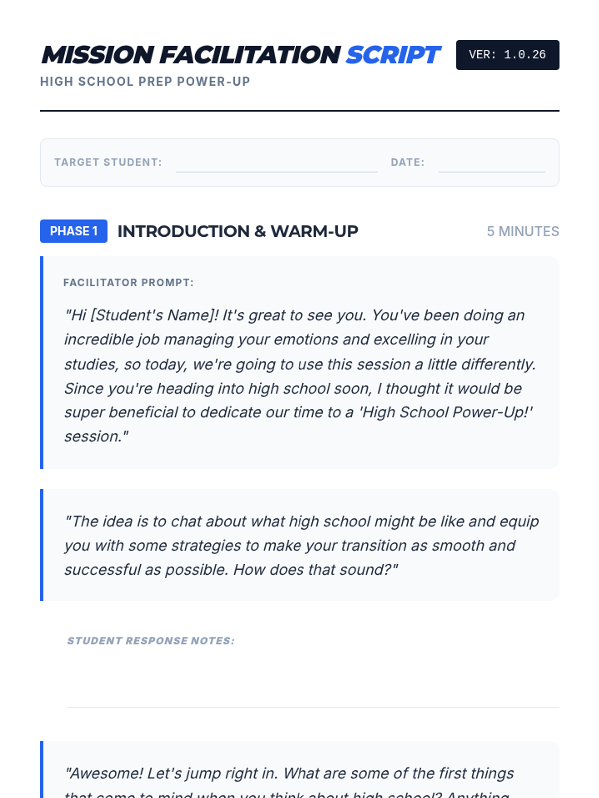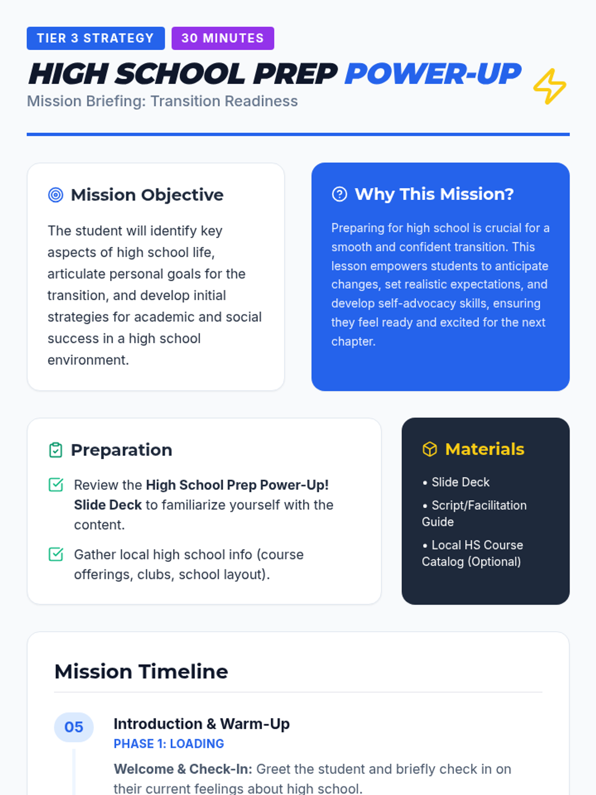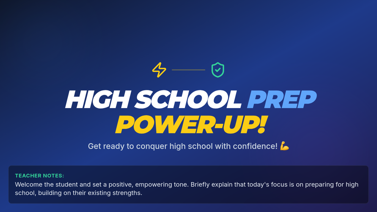 A 30-minute individual Tier 3 session for excelling 8th graders to prepare for the academic and social transition to high school using a 'power-up' framework.