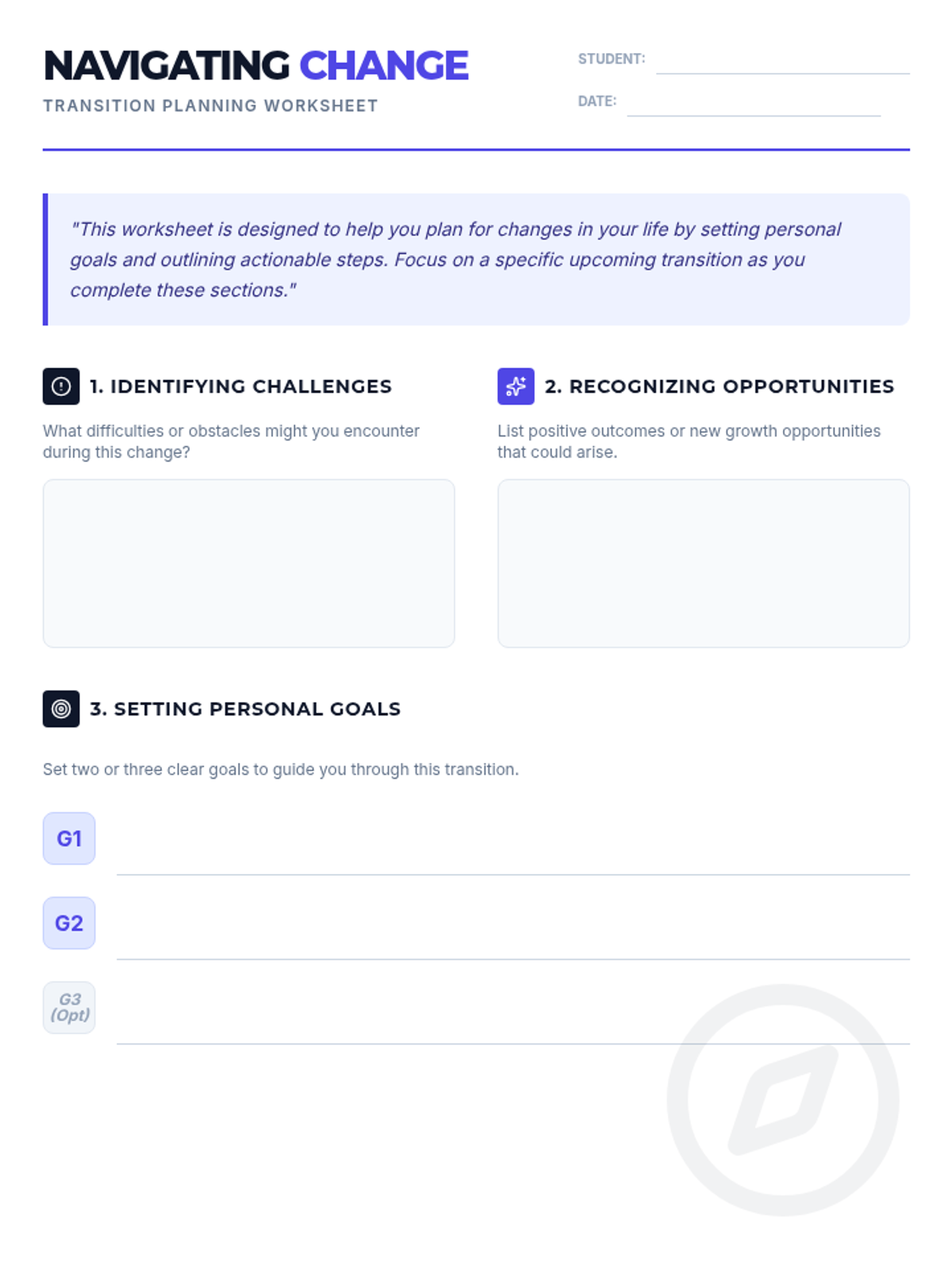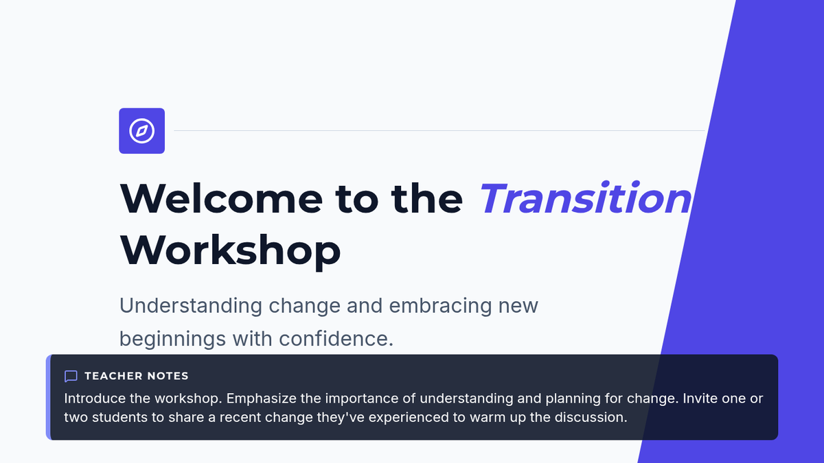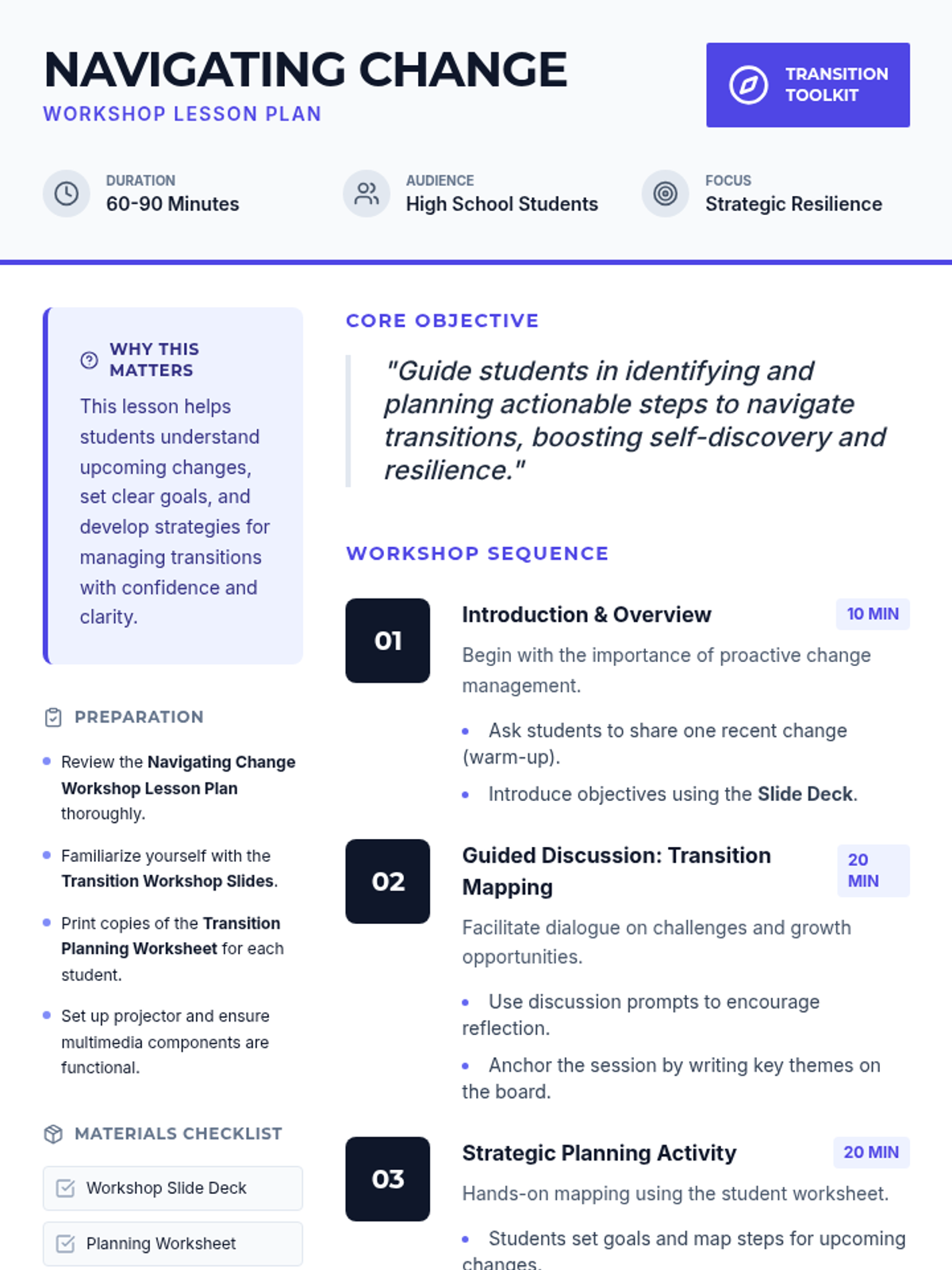 A comprehensive workshop designed for high school students to analyze upcoming life transitions, set strategic goals, and develop resilience-building habits for successful change management.
