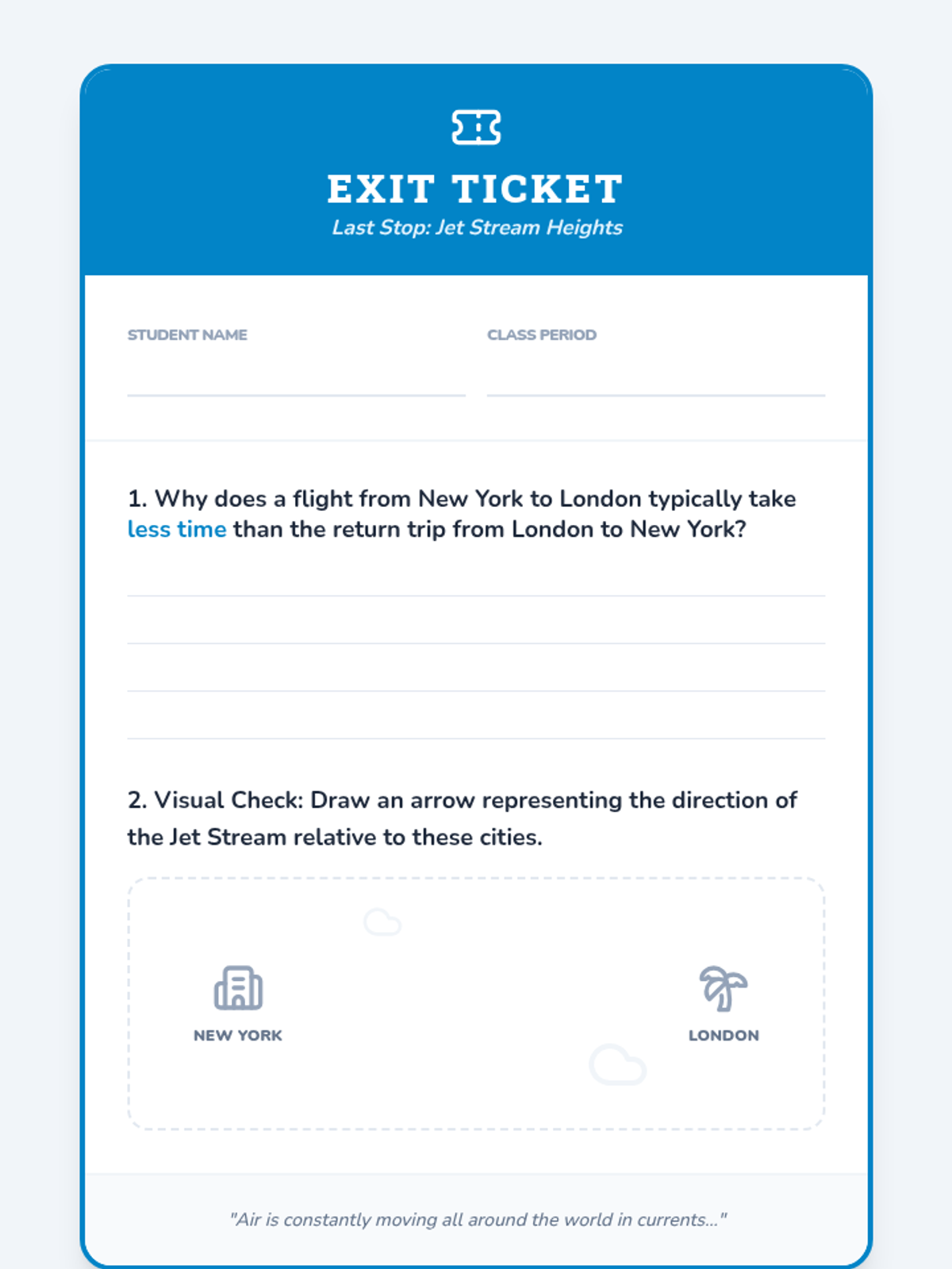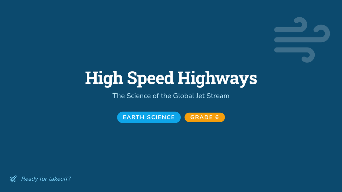 This lesson explores the formation and function of the jet stream, specifically how Earth's rotation and atmospheric pressure zones create high-speed 'ribbons' of air that impact global travel and weather. Students will use math to calculate flight times influenced by the jet stream's 442 km/h speeds.