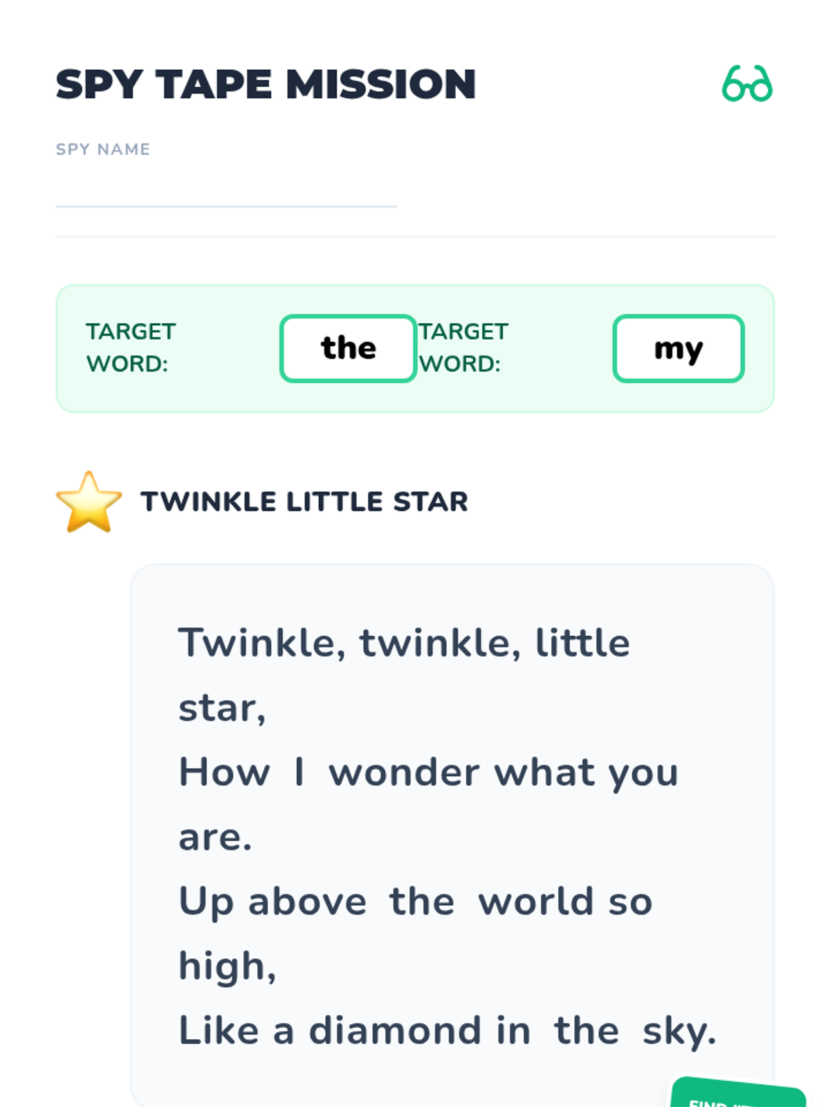 Using 'spy tape', students identify and highlight target sight words within nursery rhymes and short poems.