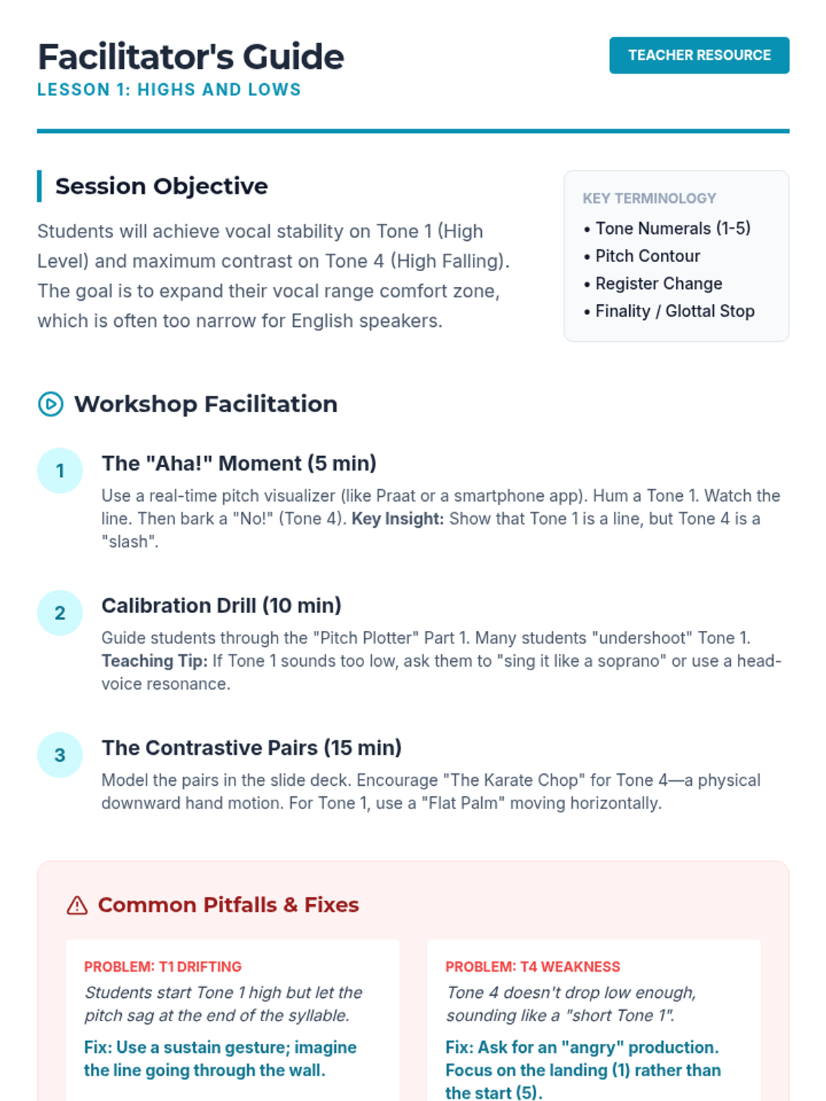 Focuses on the high, level pitch of Tone 1 and the sharp, high-falling pitch of Tone 4, emphasizing maximum vocal range and stability.