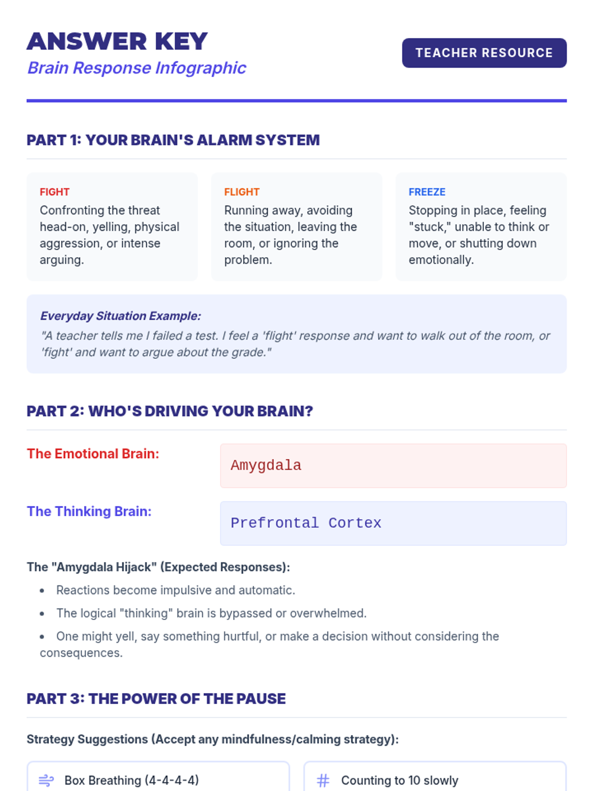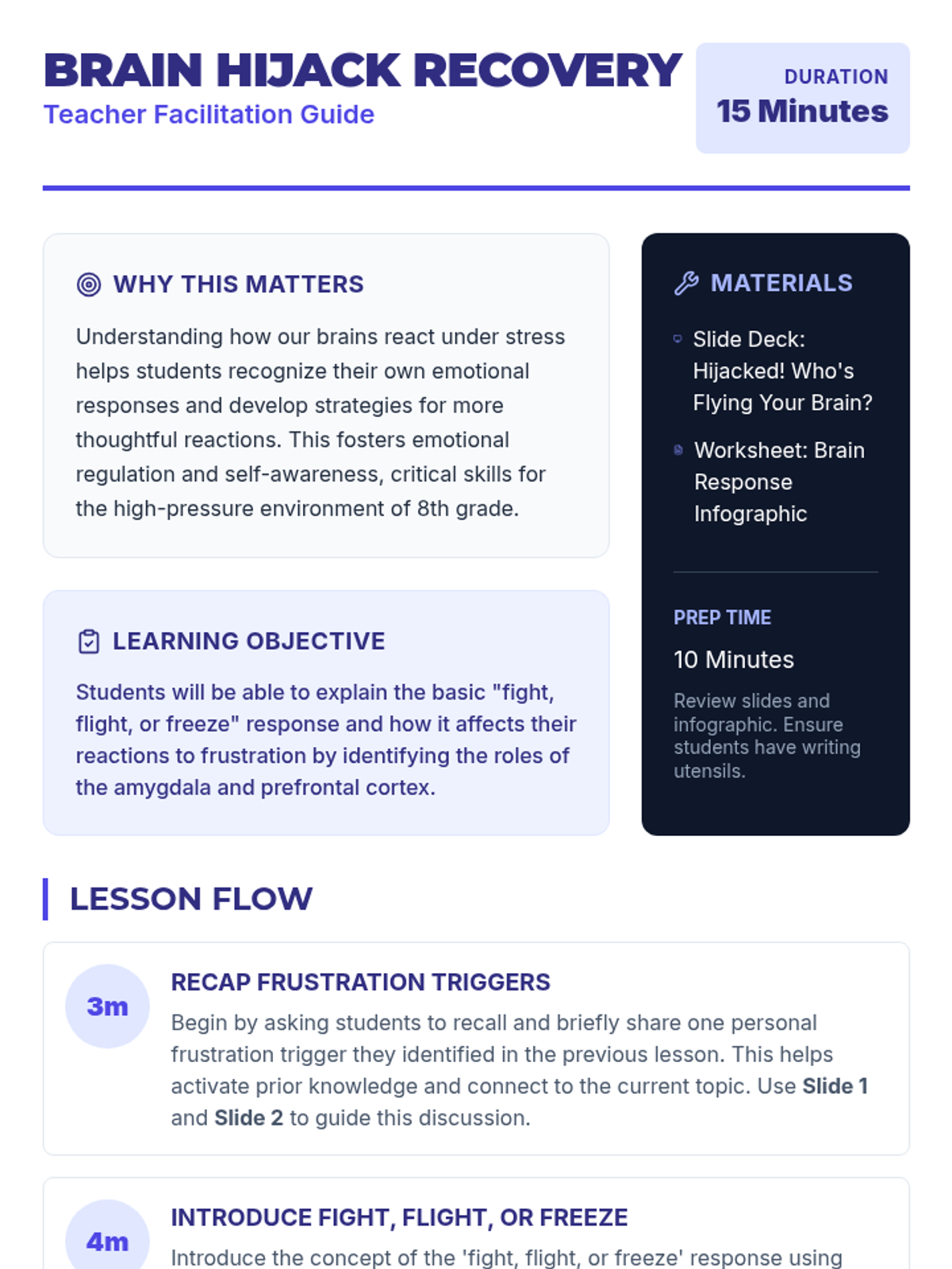 An 8th-grade lesson exploring the 'fight, flight, or freeze' response and the science behind 'amygdala hijacks' to improve emotional regulation.
