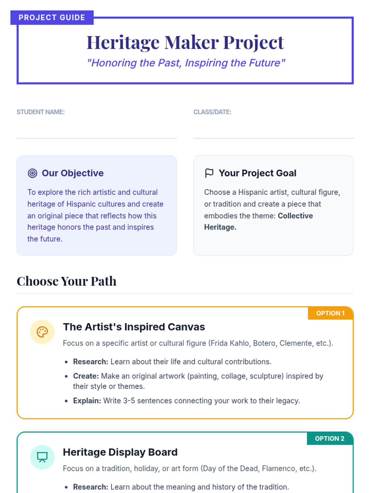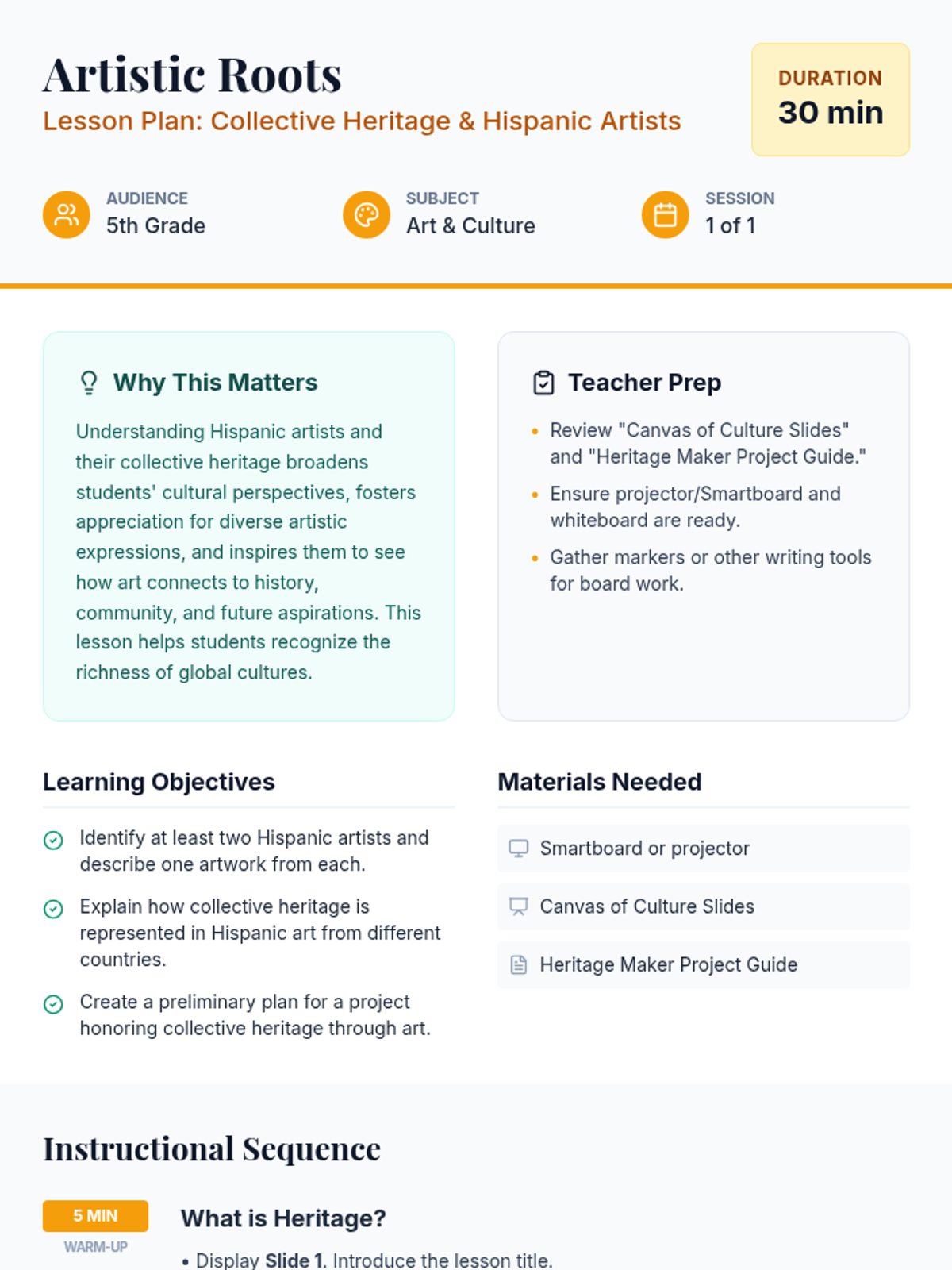 This 30-minute lesson introduces 5th-grade students to influential Hispanic artists and icons, exploring how their work reflects a collective heritage and connects the past to the future. Students will explore artists like Frida Kahlo and Fernando Botero before beginning a creative project plan.