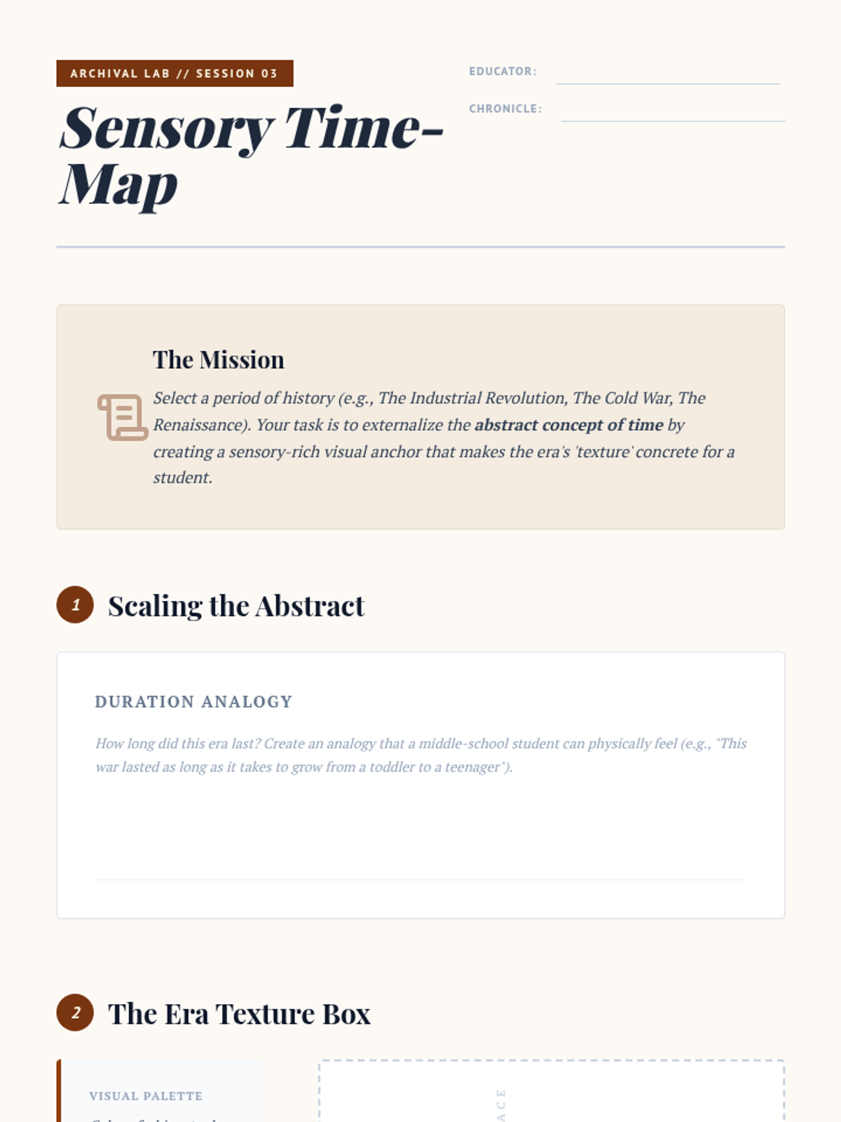 Techniques for visualizing abstract concepts of time, cause-and-effect, and sensory details in historical texts.