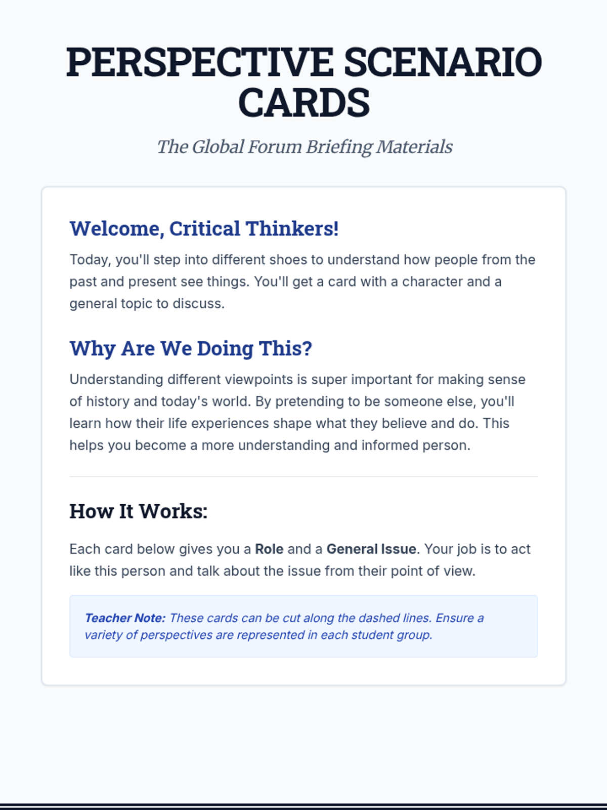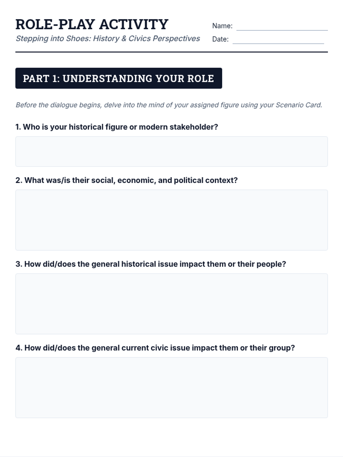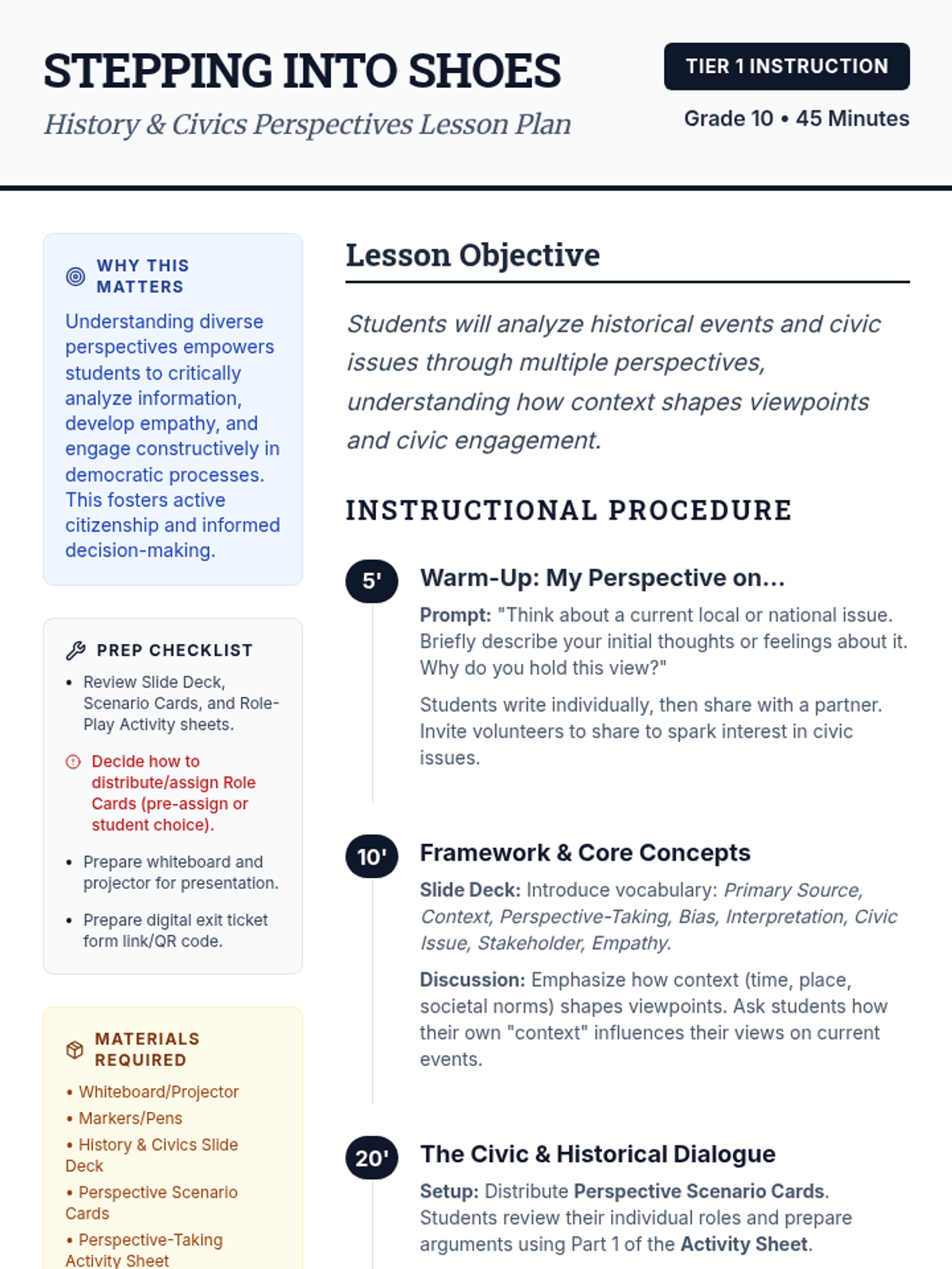 A 45-minute lesson where students role-play historical figures and modern stakeholders to understand how personal and temporal context shapes perspectives on civic and historical issues.
