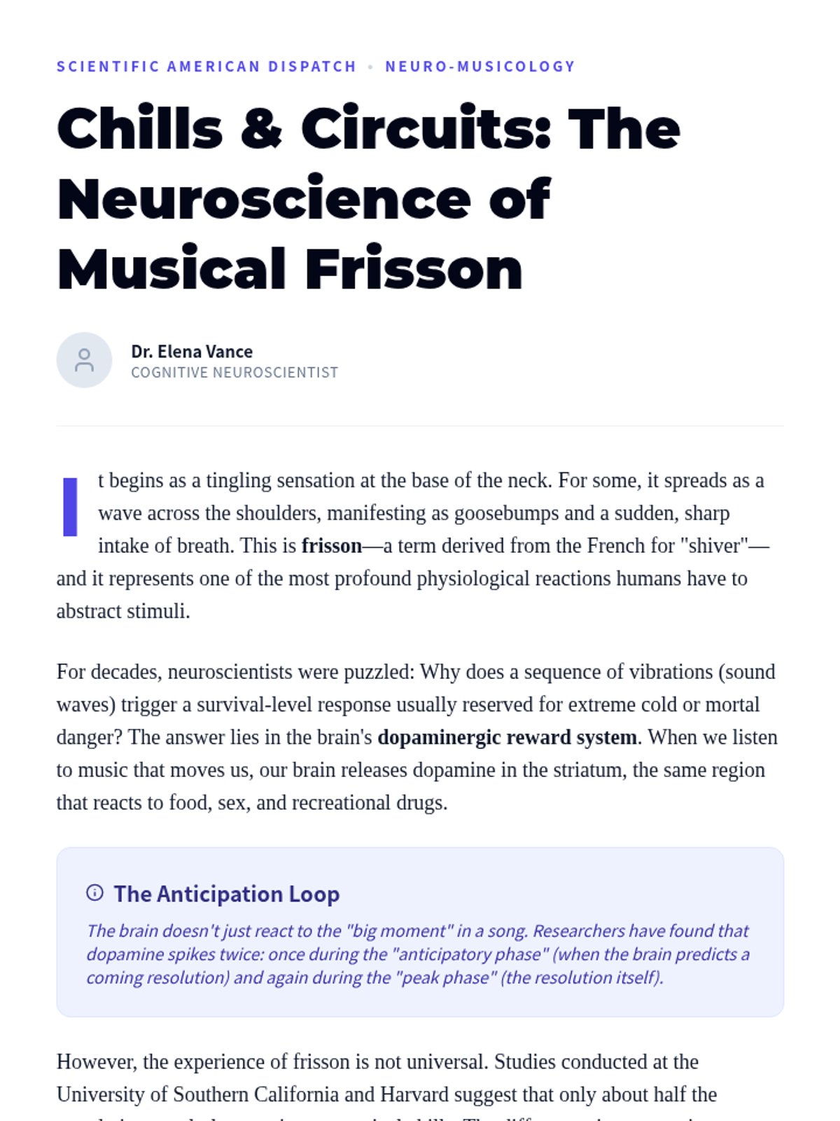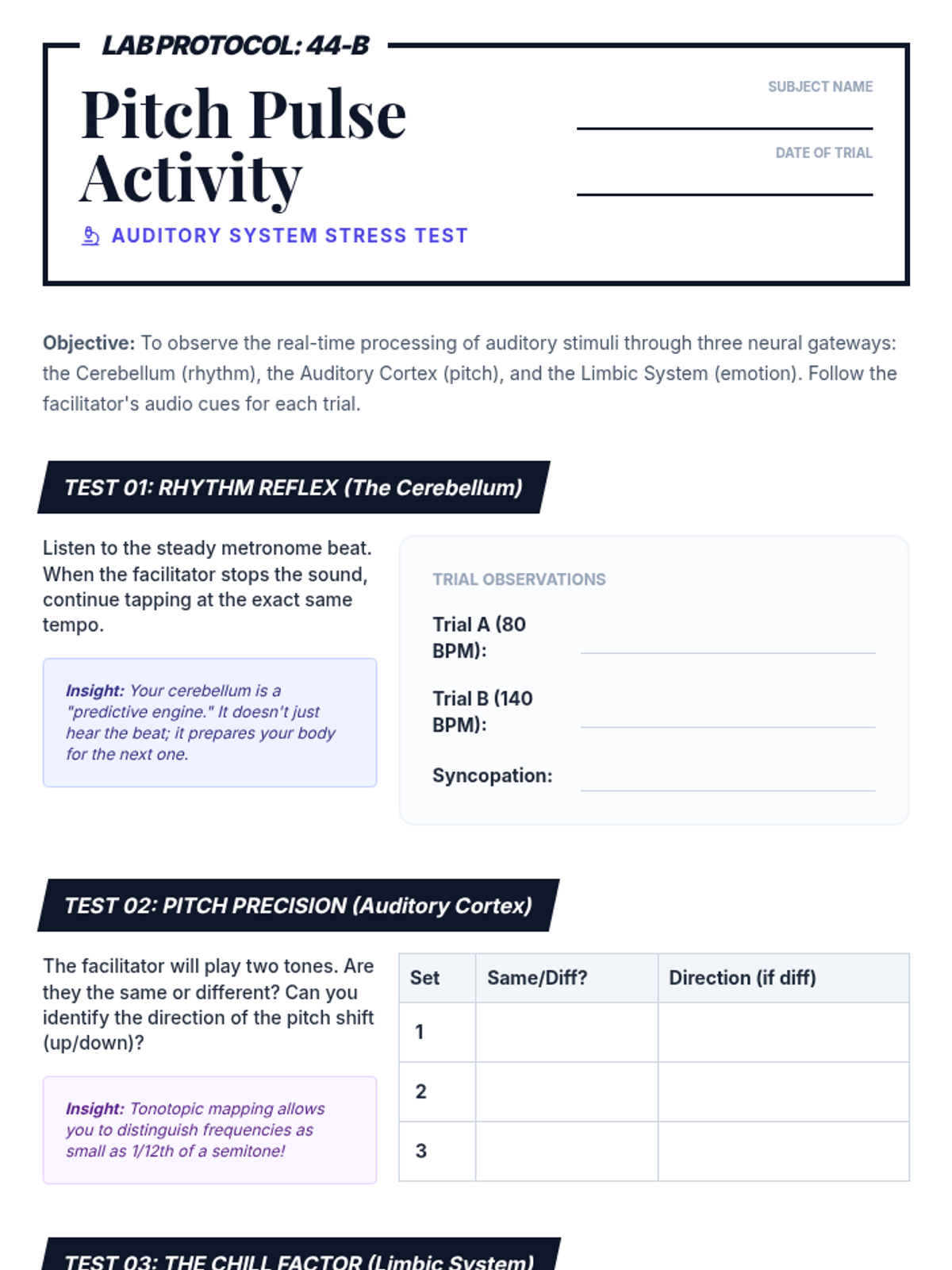 A high-school level exploration of how the human brain processes music, focusing on the neurological pathways for pitch, rhythm, and the emotional responses that trigger memory and physiological sensations like 'chills'. Students engage in scientific analysis and auditory testing to map the mind's ear.