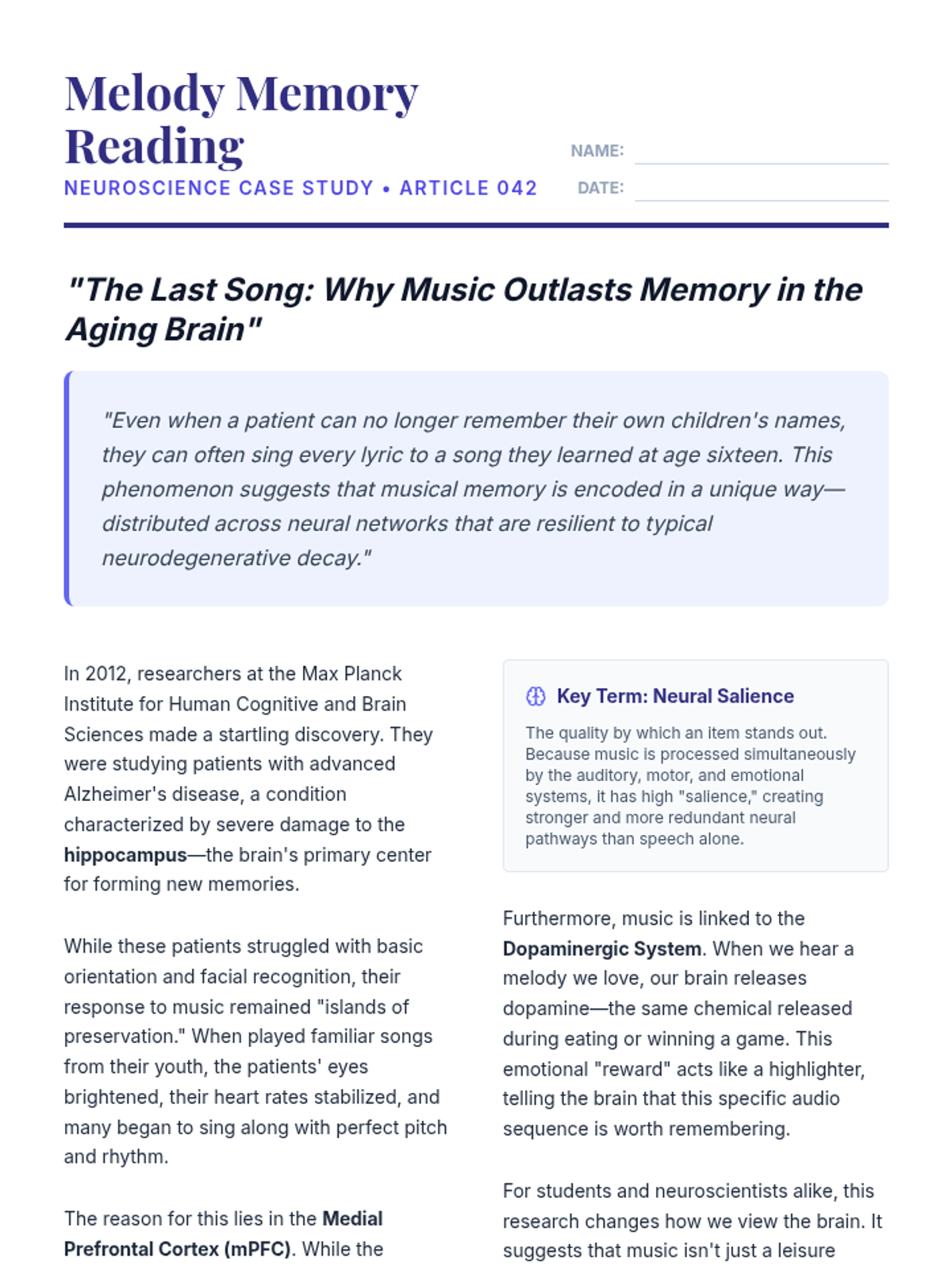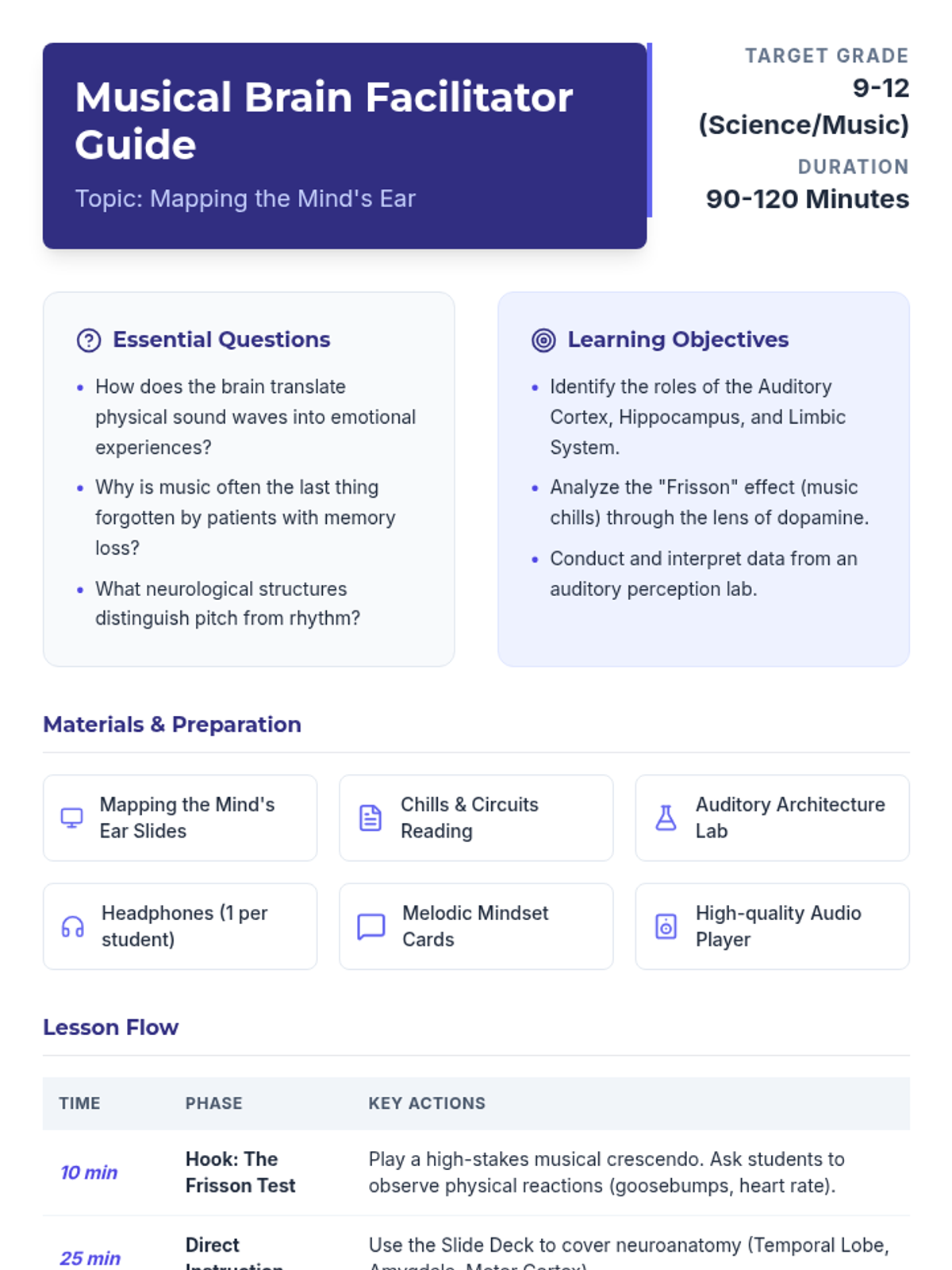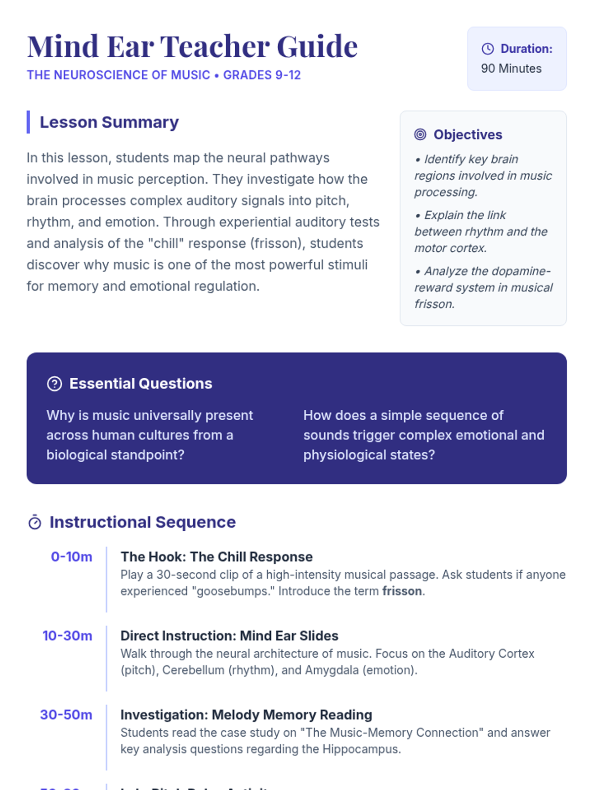 A high school lesson exploring the neuroscience of music, investigating how the brain processes auditory stimuli, triggers emotions, and encodes memories through melodies.