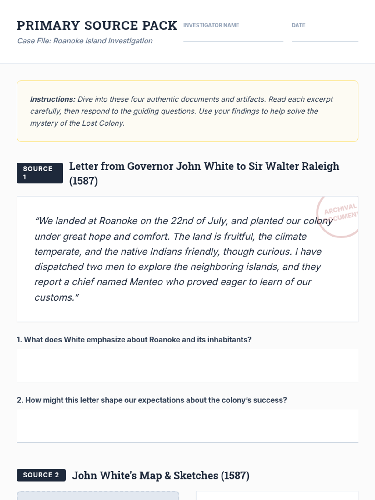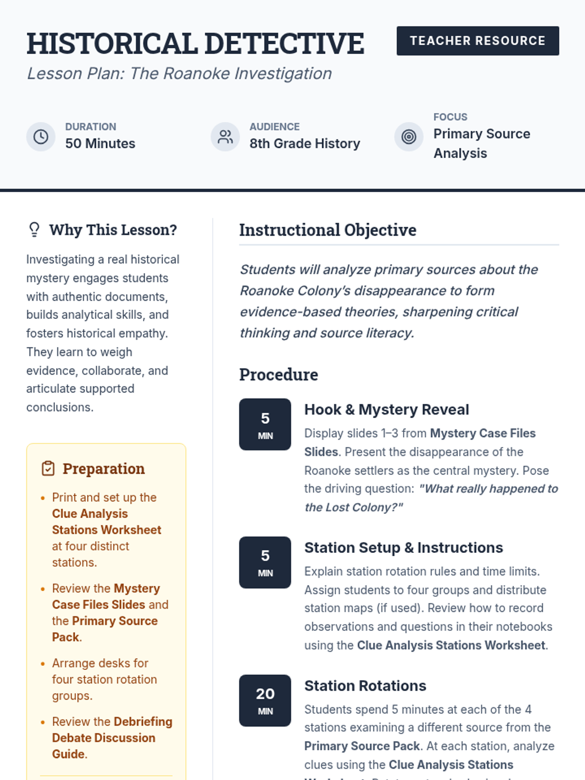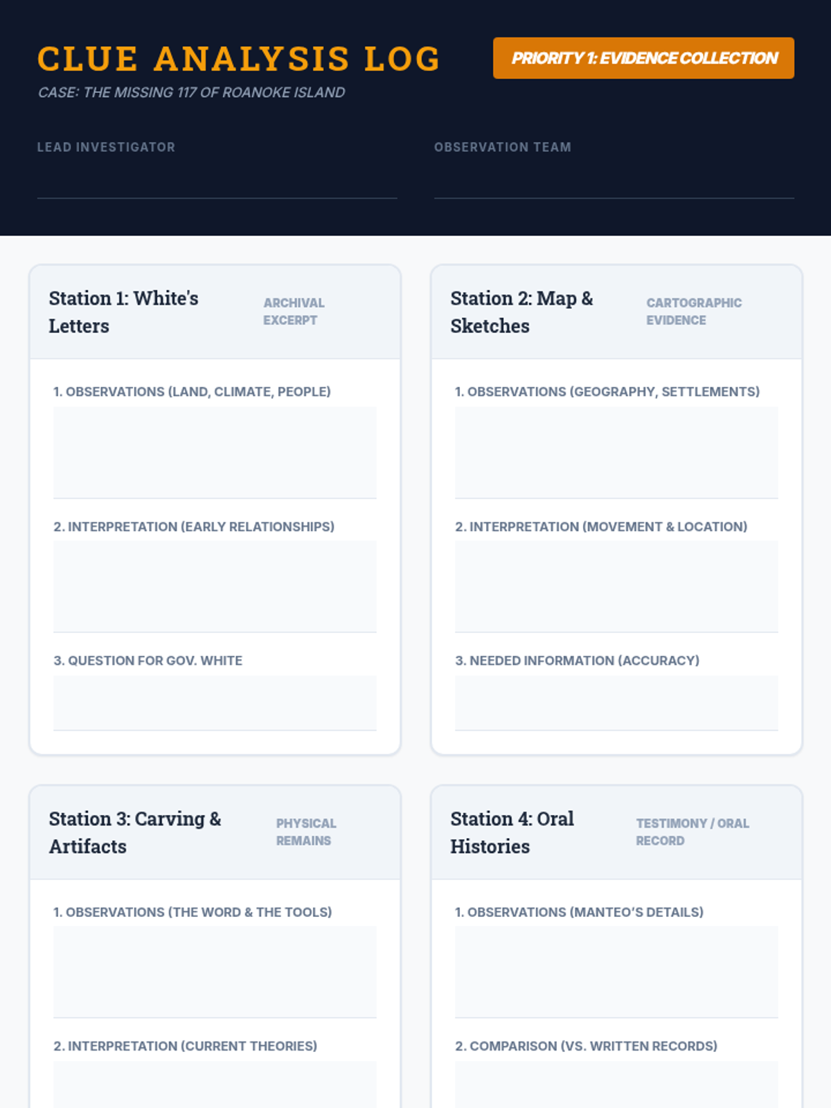 Students become historical detectives to investigate the disappearance of the Roanoke Colony. By analyzing primary source letters, maps, artifacts, and oral histories, 8th graders develop evidence-based hypotheses and engage in a structured debate.