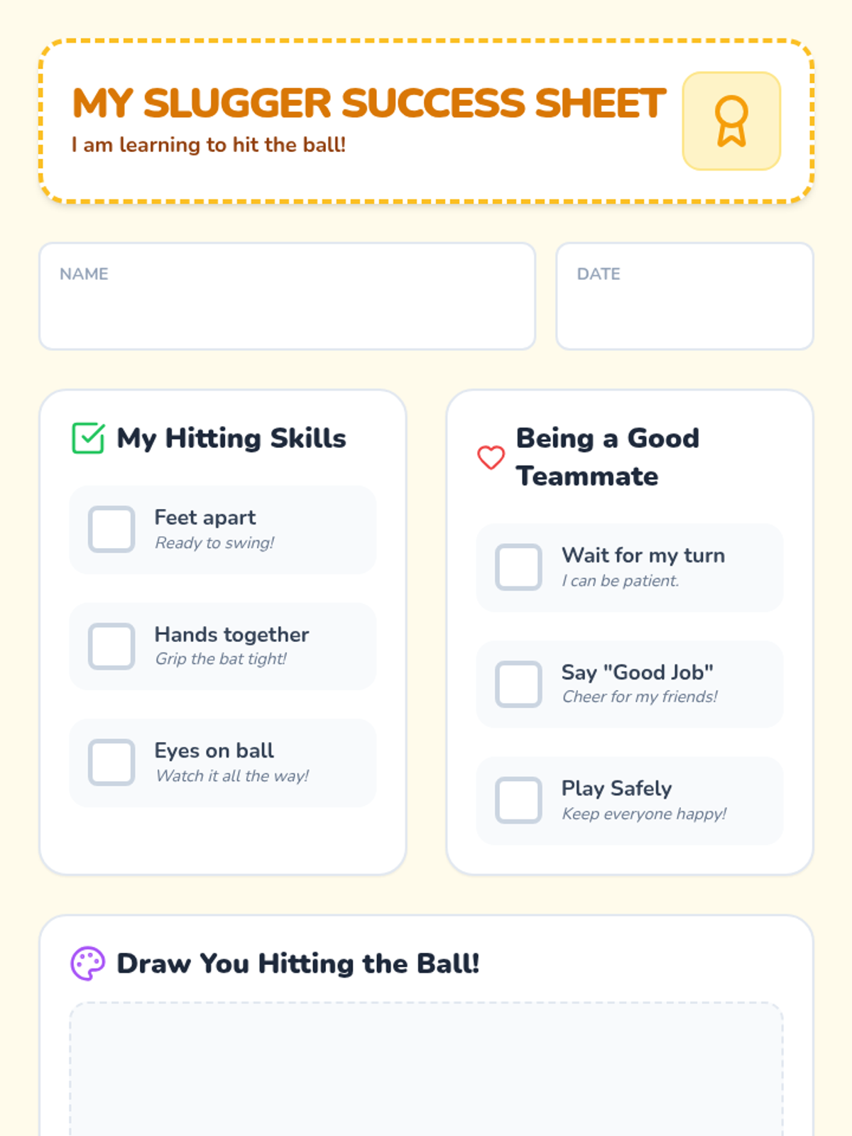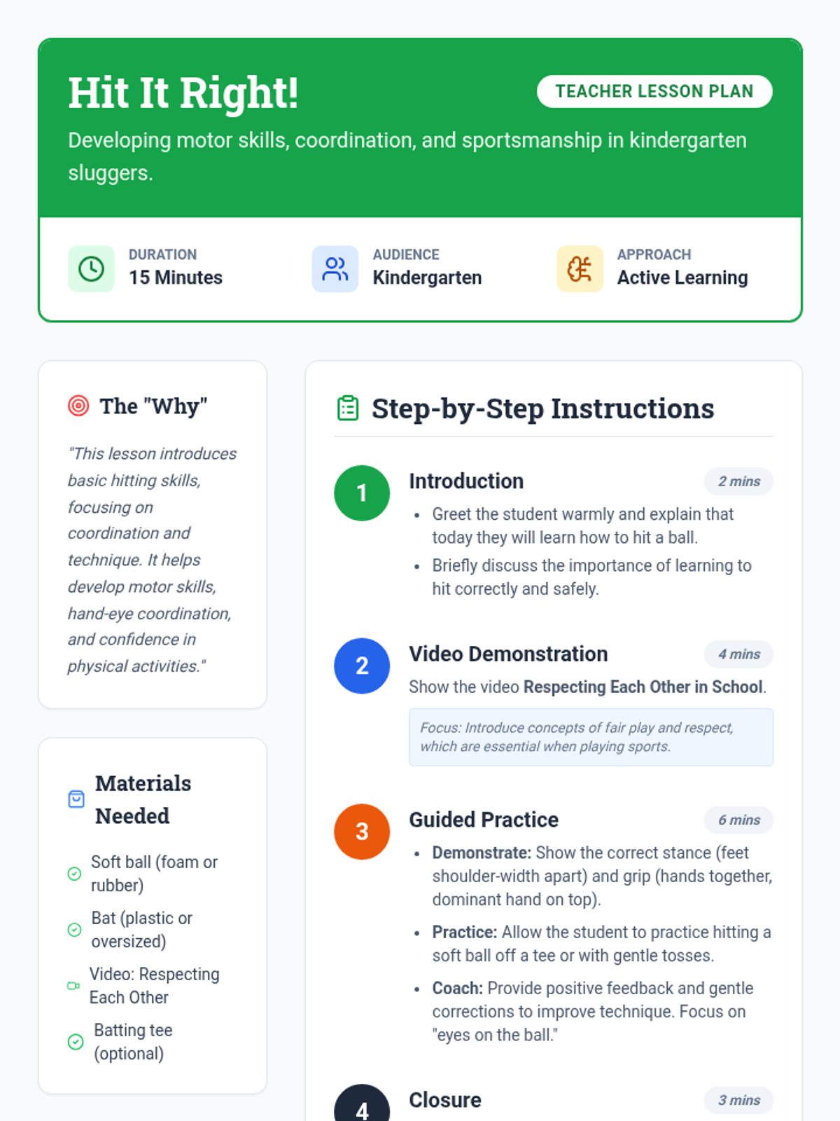 A fun, 15-minute active learning session for kindergarteners focusing on basic hitting skills, hand-eye coordination, and the importance of respect and fair play in sports.