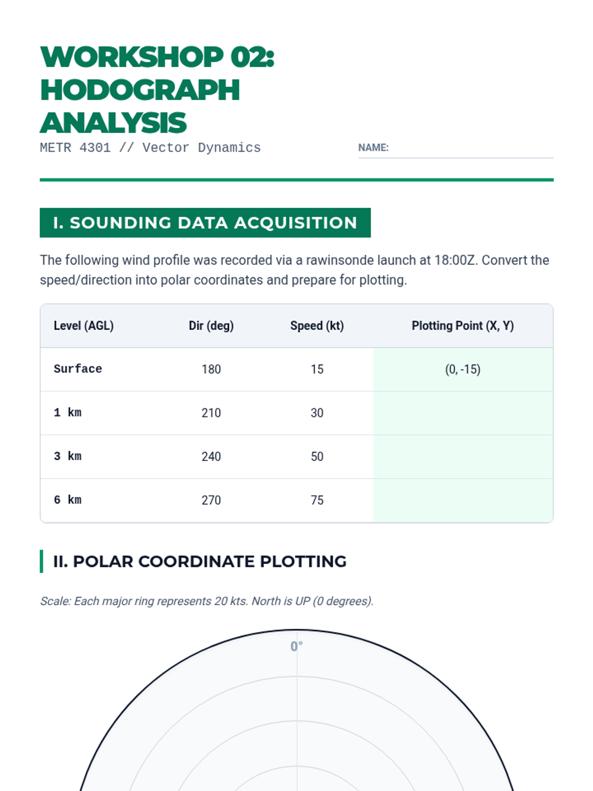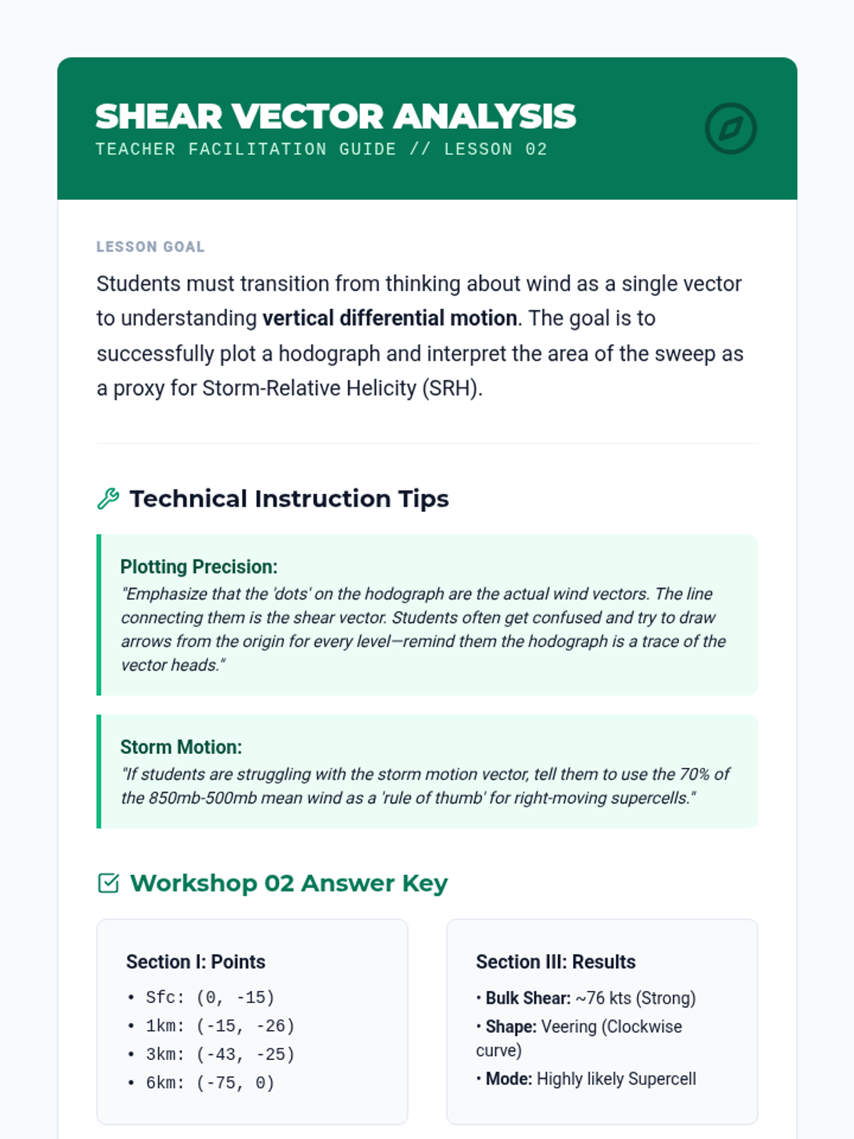 This lesson introduces the hodograph as a tool for visualizing vertical wind shear. Students learn to plot wind vectors to calculate bulk shear and storm-relative helicity, predicting storm type and rotation potential based on the shape of the shear profile.