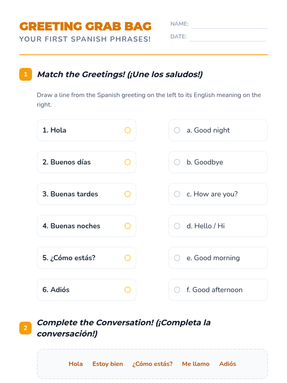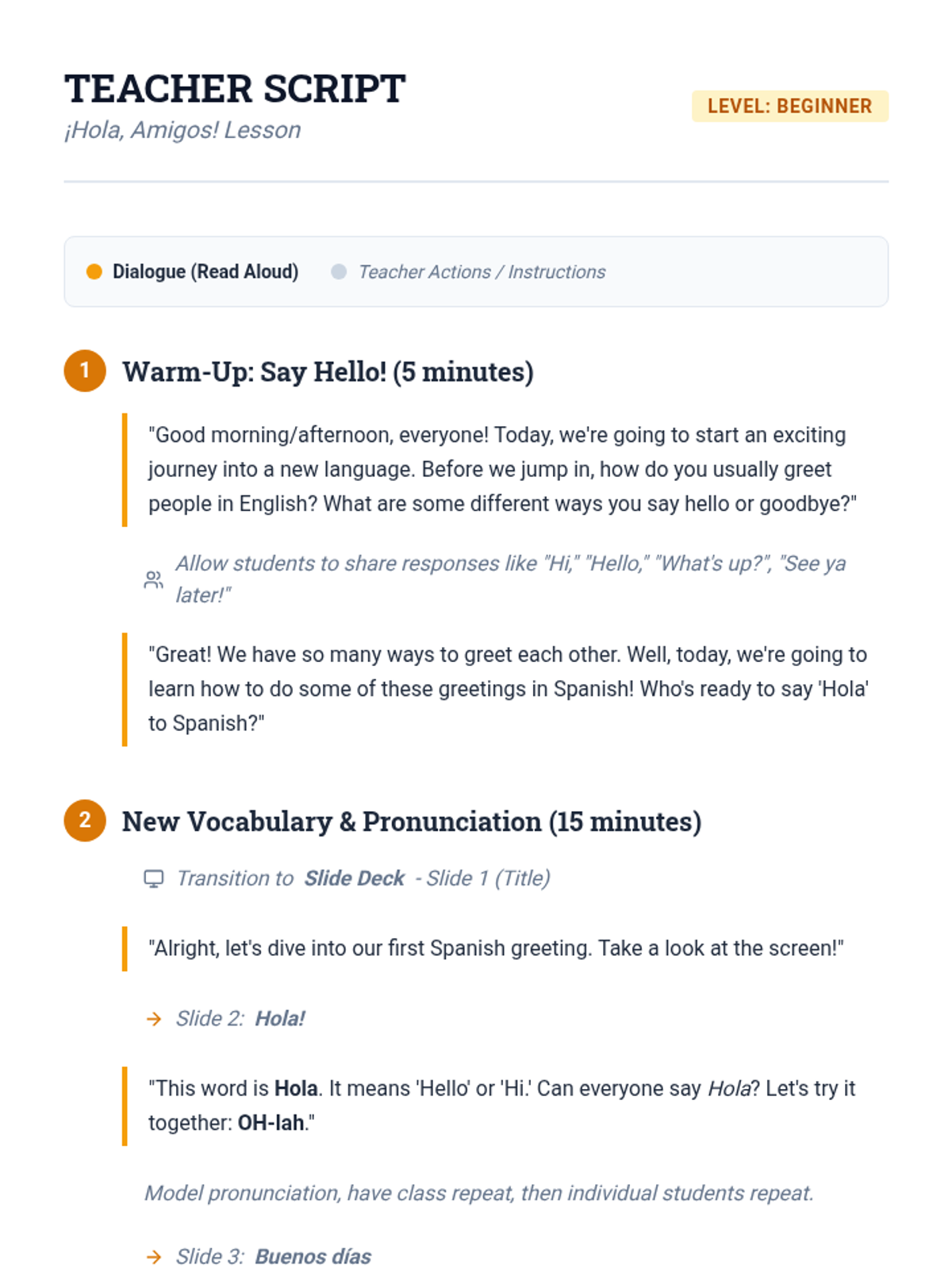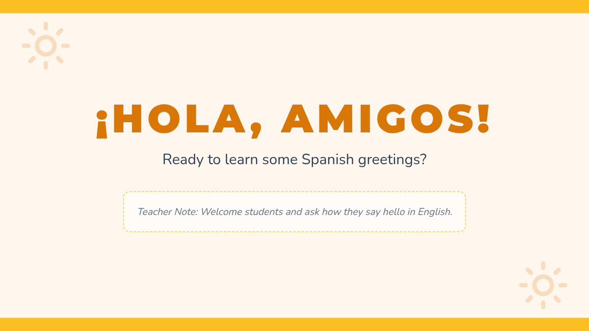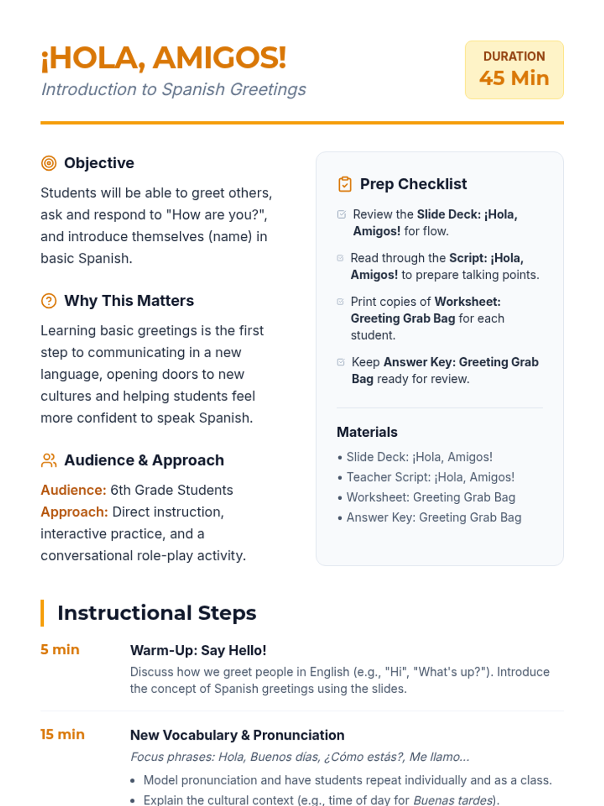 A 45-minute introductory lesson for 6th-grade students to learn basic Spanish greetings, introductions, and simple conversational exchanges. Students will practice pronunciation and use phrases like 'Hola', 'Buenos días', and 'Me llamo' in interactive activities.