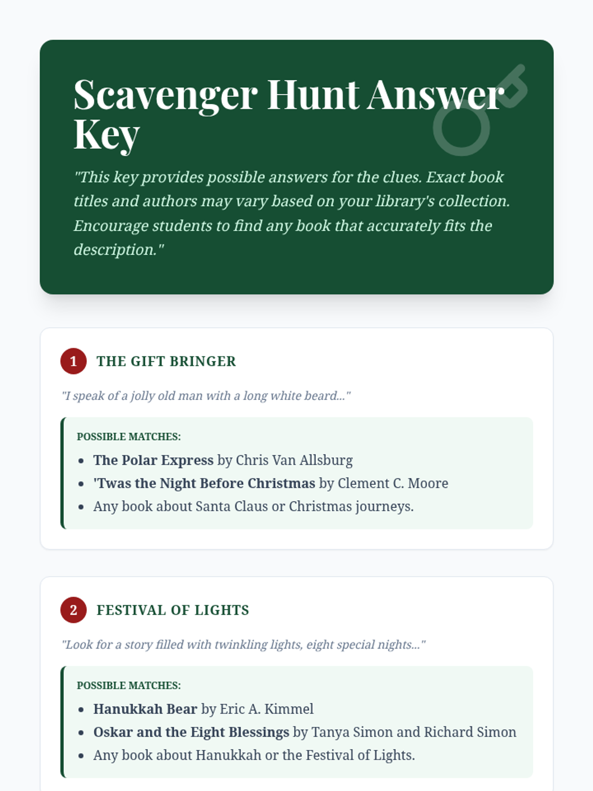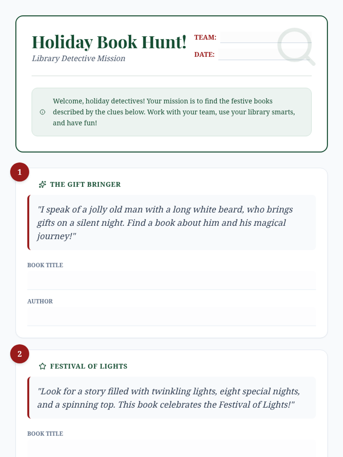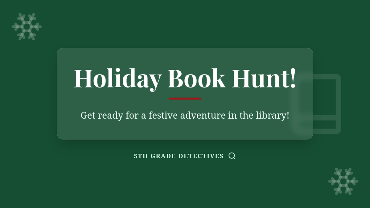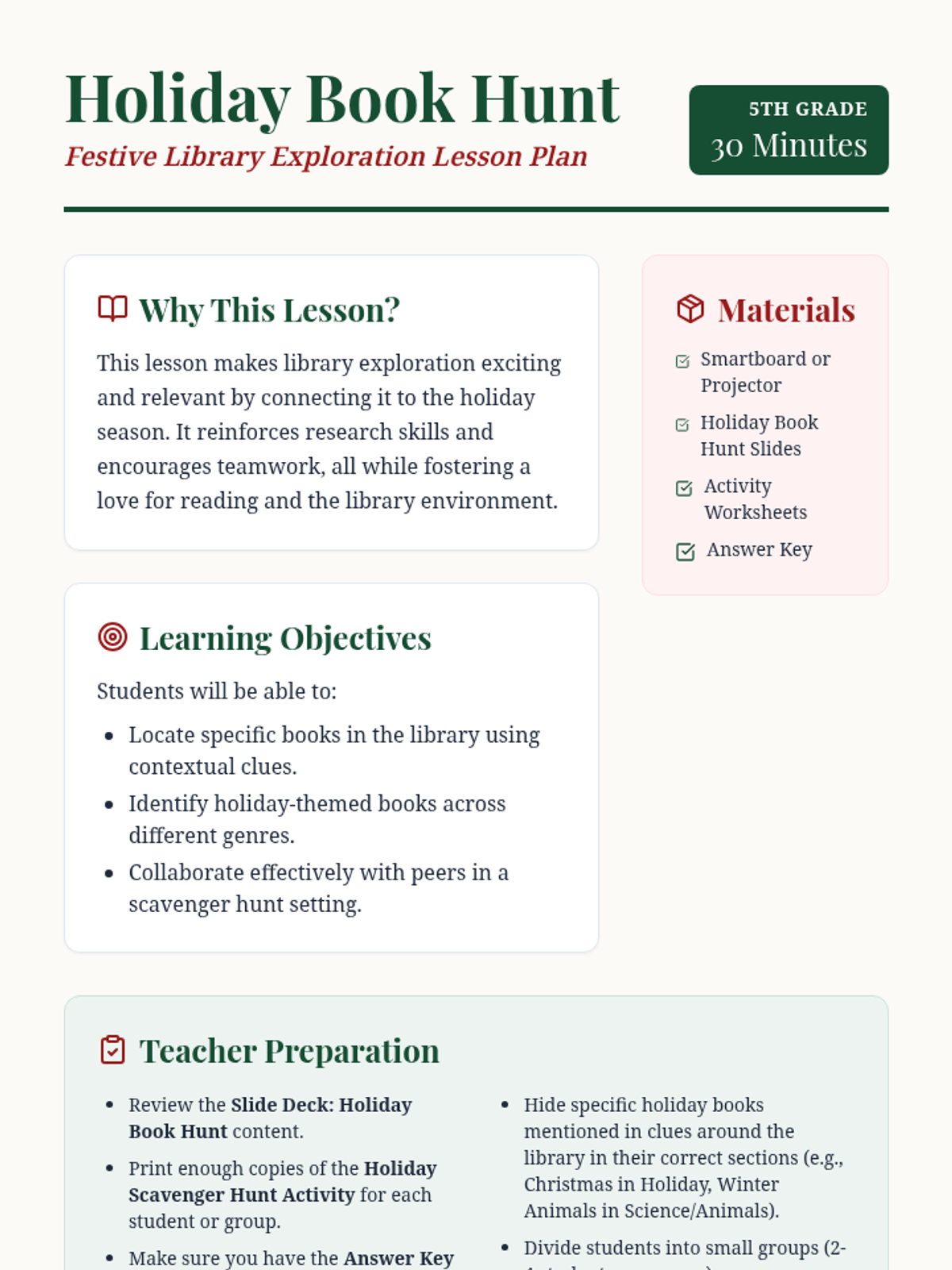 A festive library scavenger hunt for 5th grade students to practice library organization skills while exploring holiday-themed literature. Students work in teams to solve clues and locate books across various genres and sections.