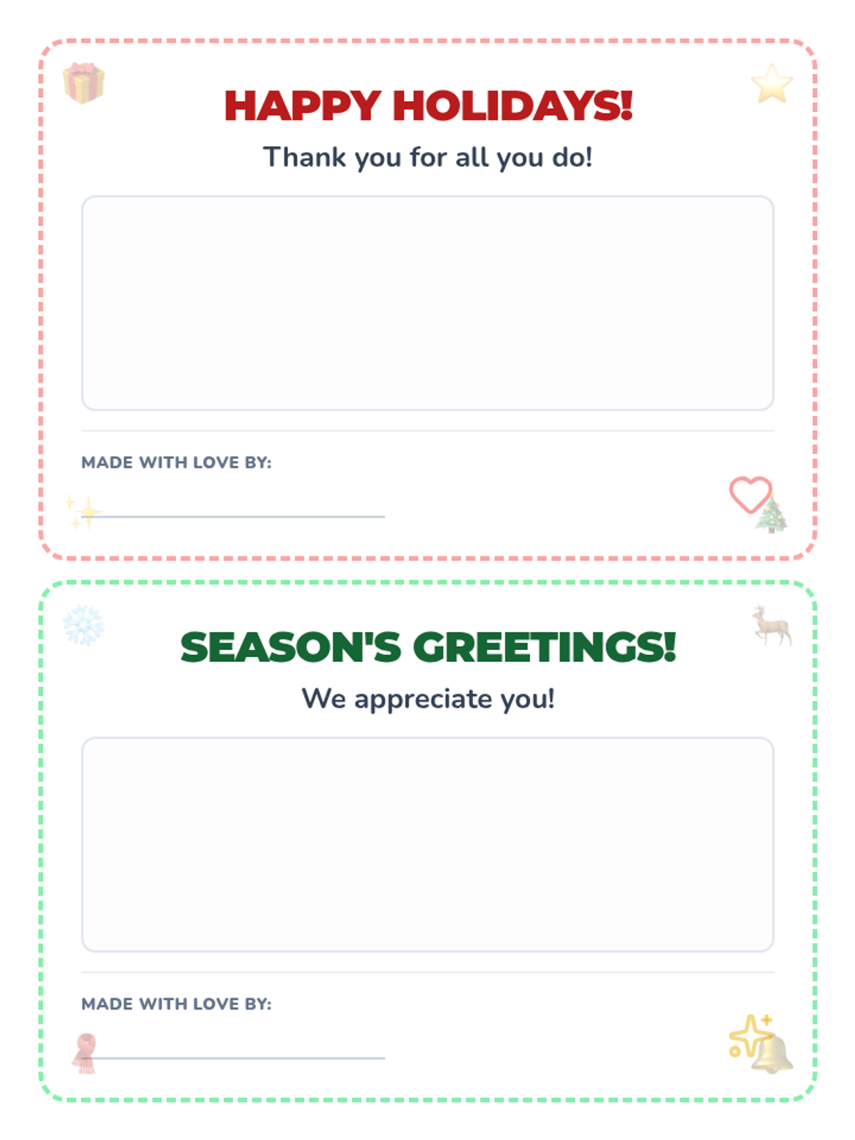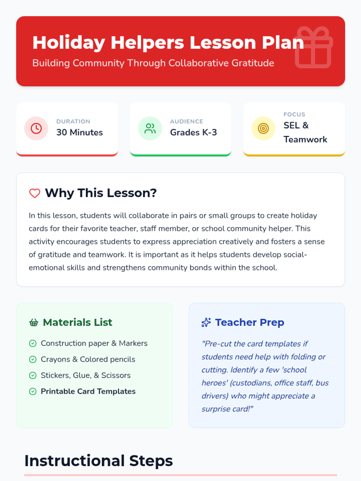 A collaborative Tier 2 lesson where students work in small groups to create holiday cards for school staff, practicing gratitude and teamwork.