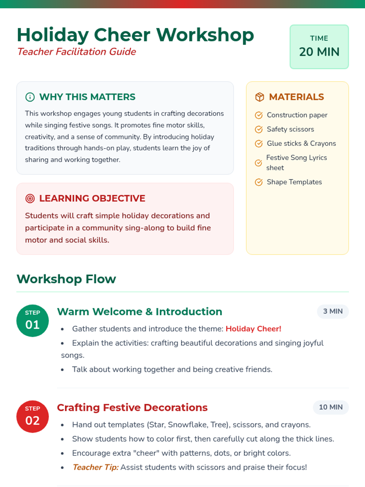 A festive 20-minute workshop for Pre-K and Kindergarten students to craft holiday decorations and sing seasonal songs, focusing on fine motor skills and community building.