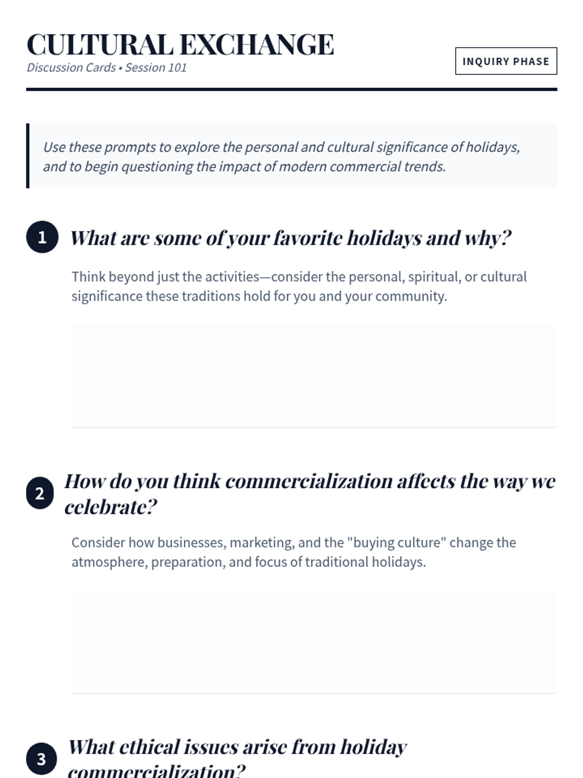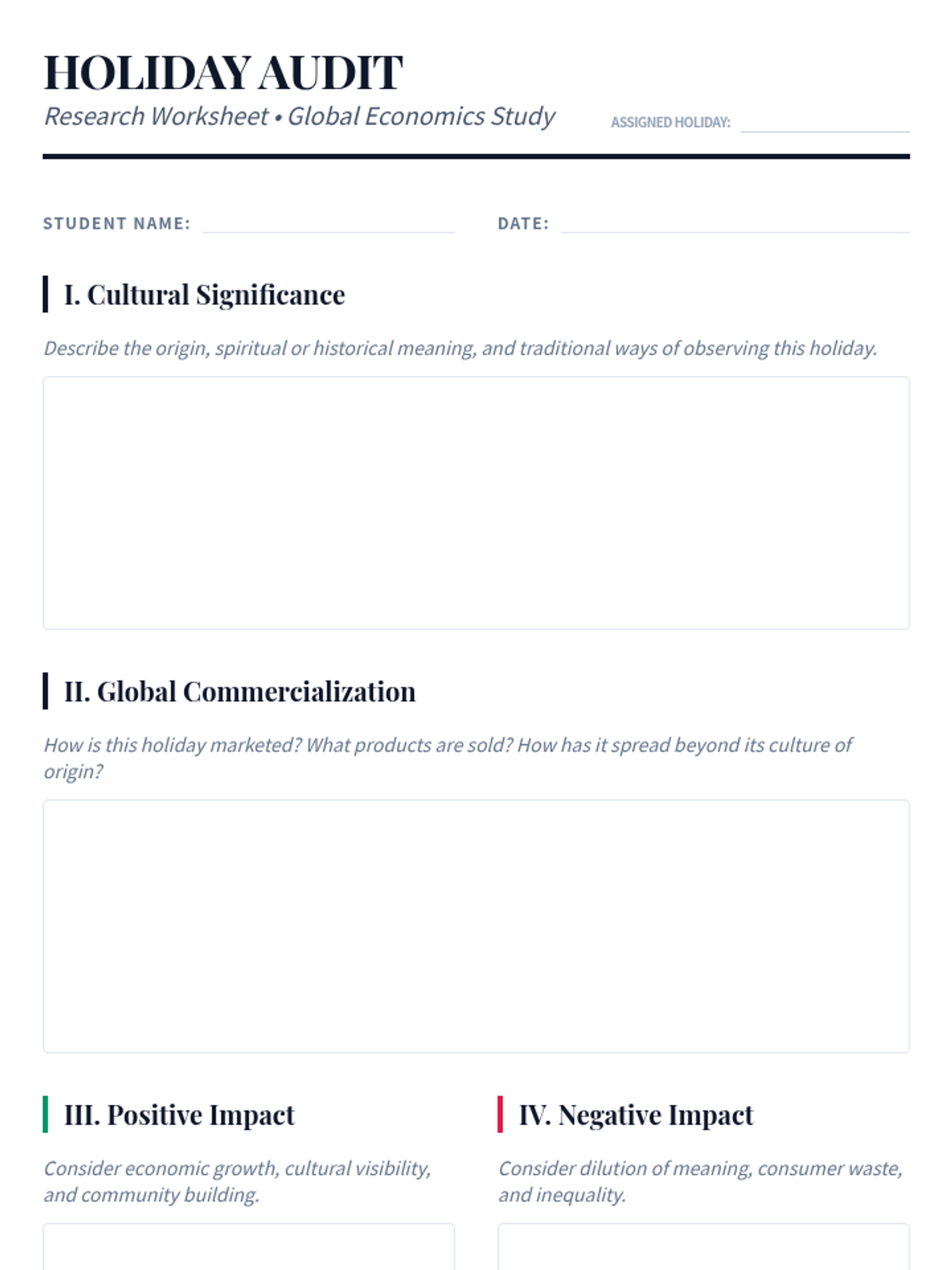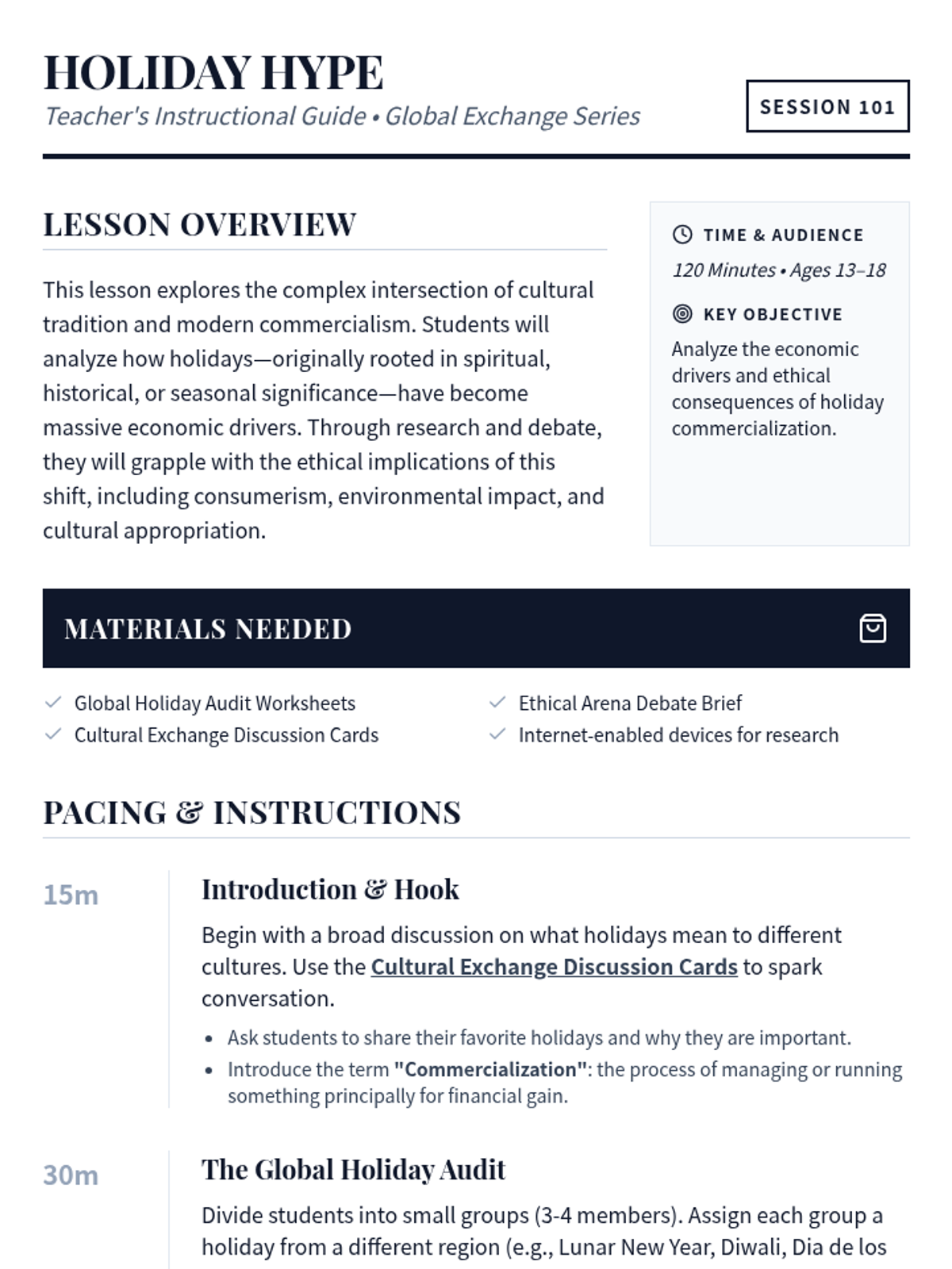 This lesson explores the commercial aspects of holidays and their ethical implications across different cultures. Students engage in research and debate to develop analytical and ethical reasoning skills regarding global commercialization.