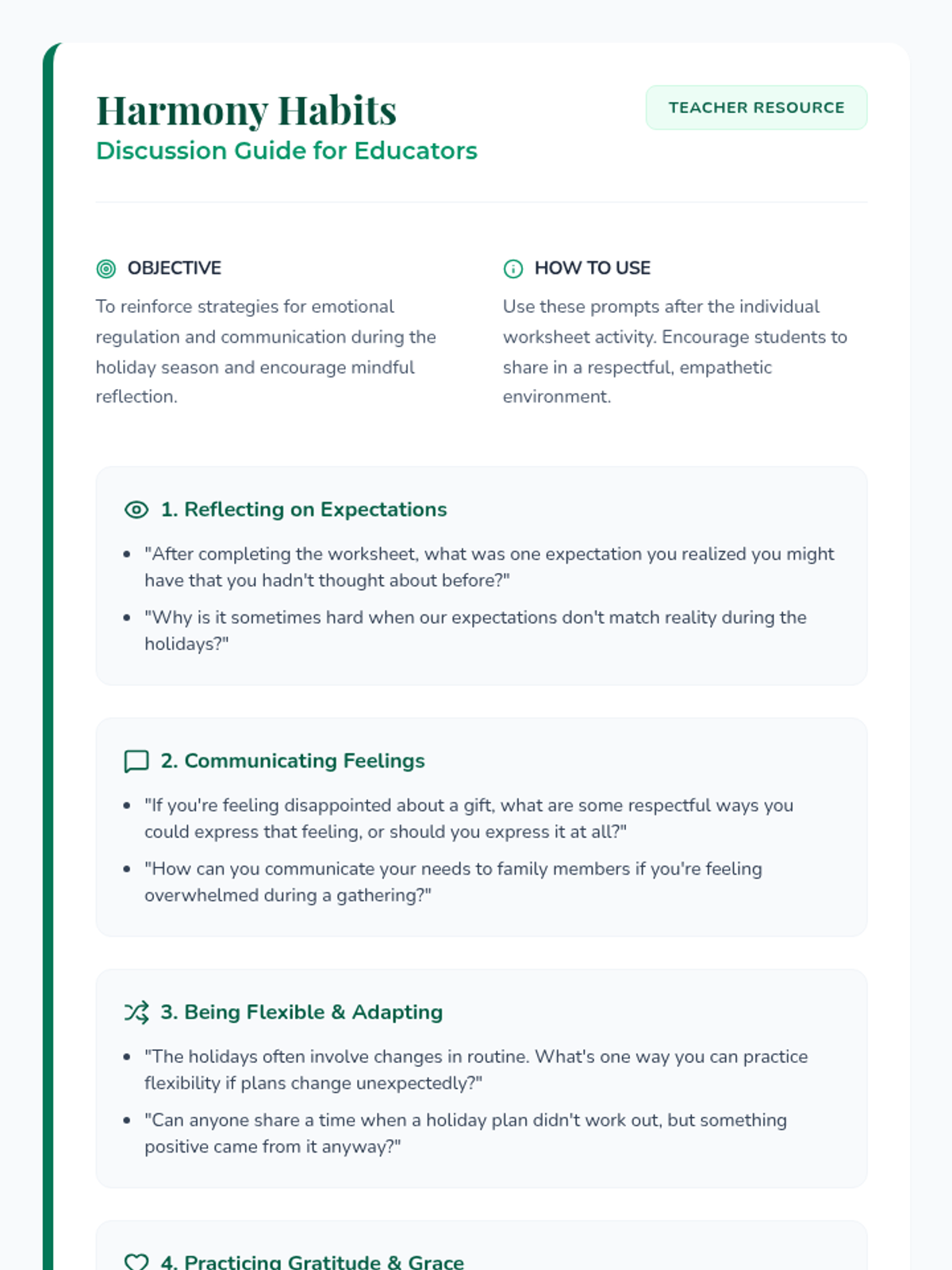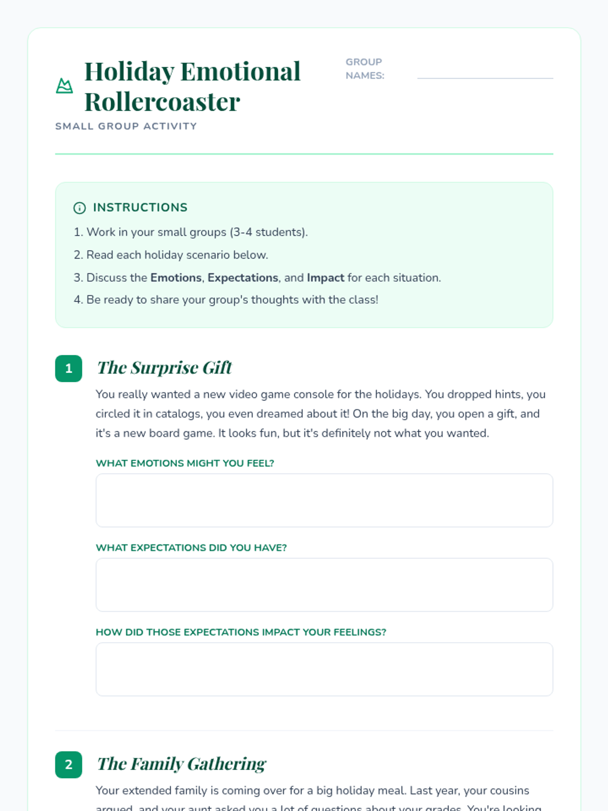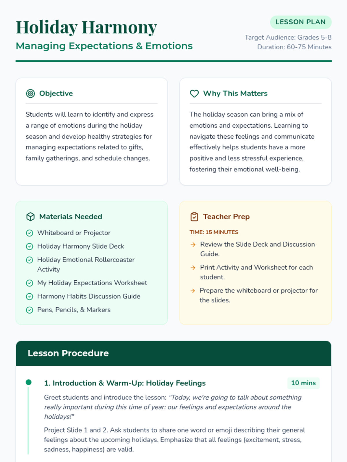 This 60-75 minute lesson helps students in grades 5-8 navigate the emotional landscape of the holidays by exploring expectations and developing strategies for emotional regulation and communication.