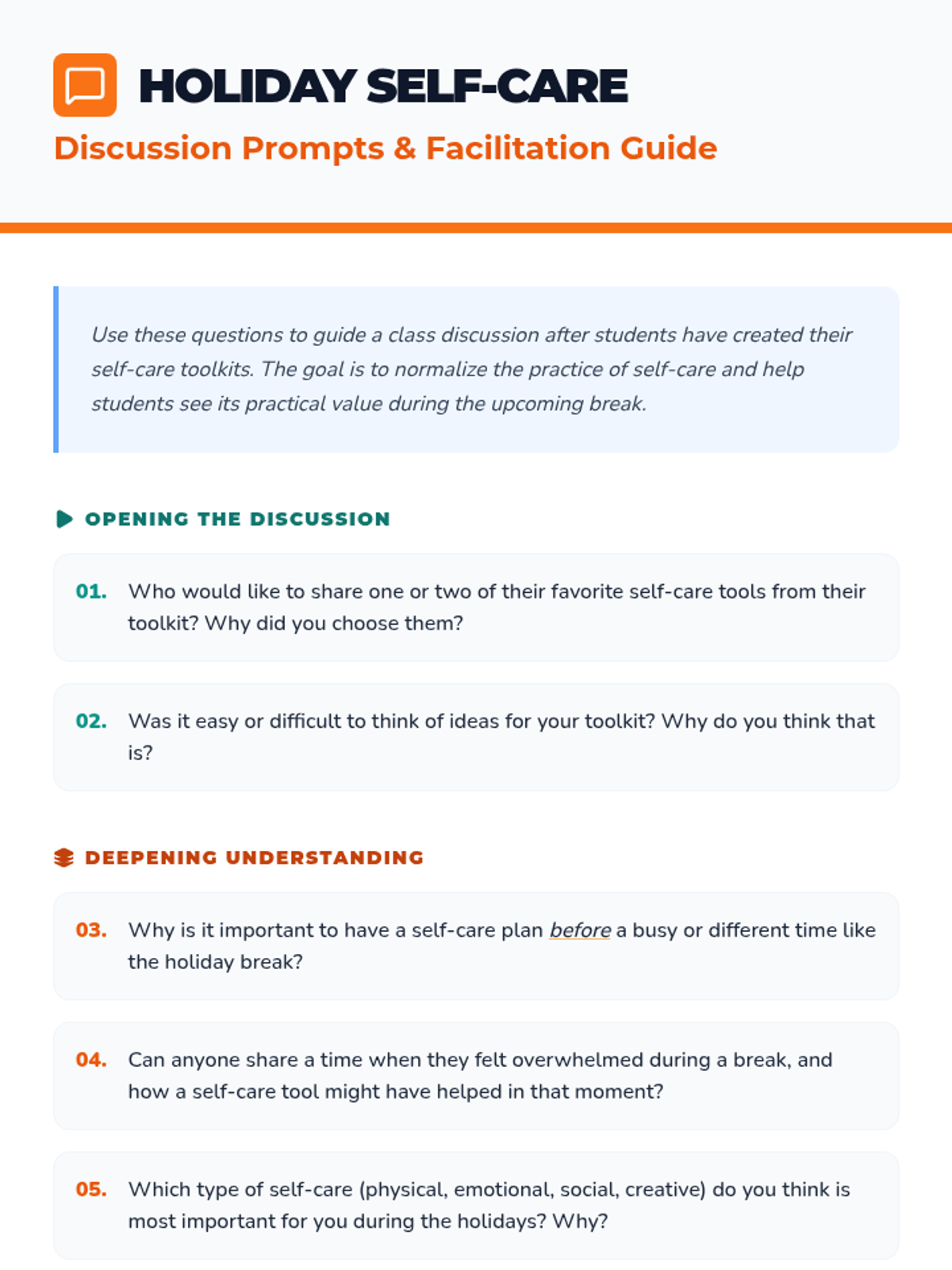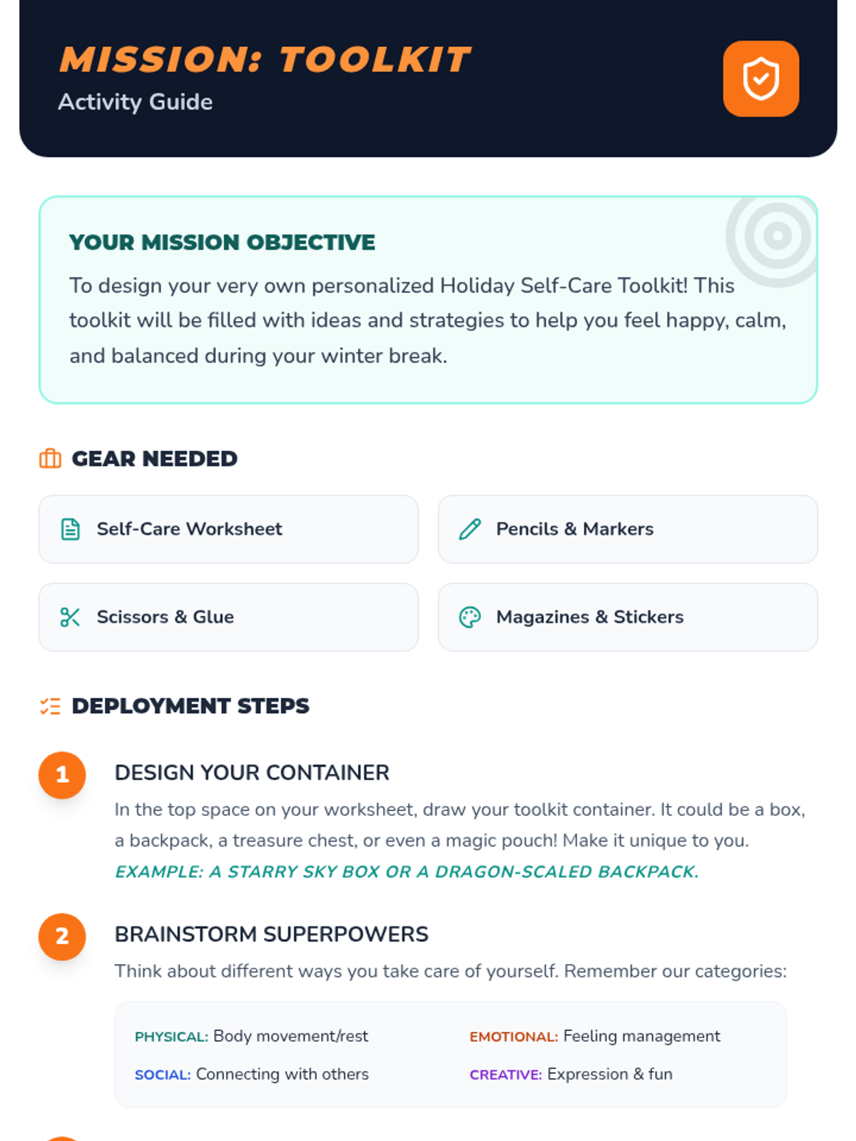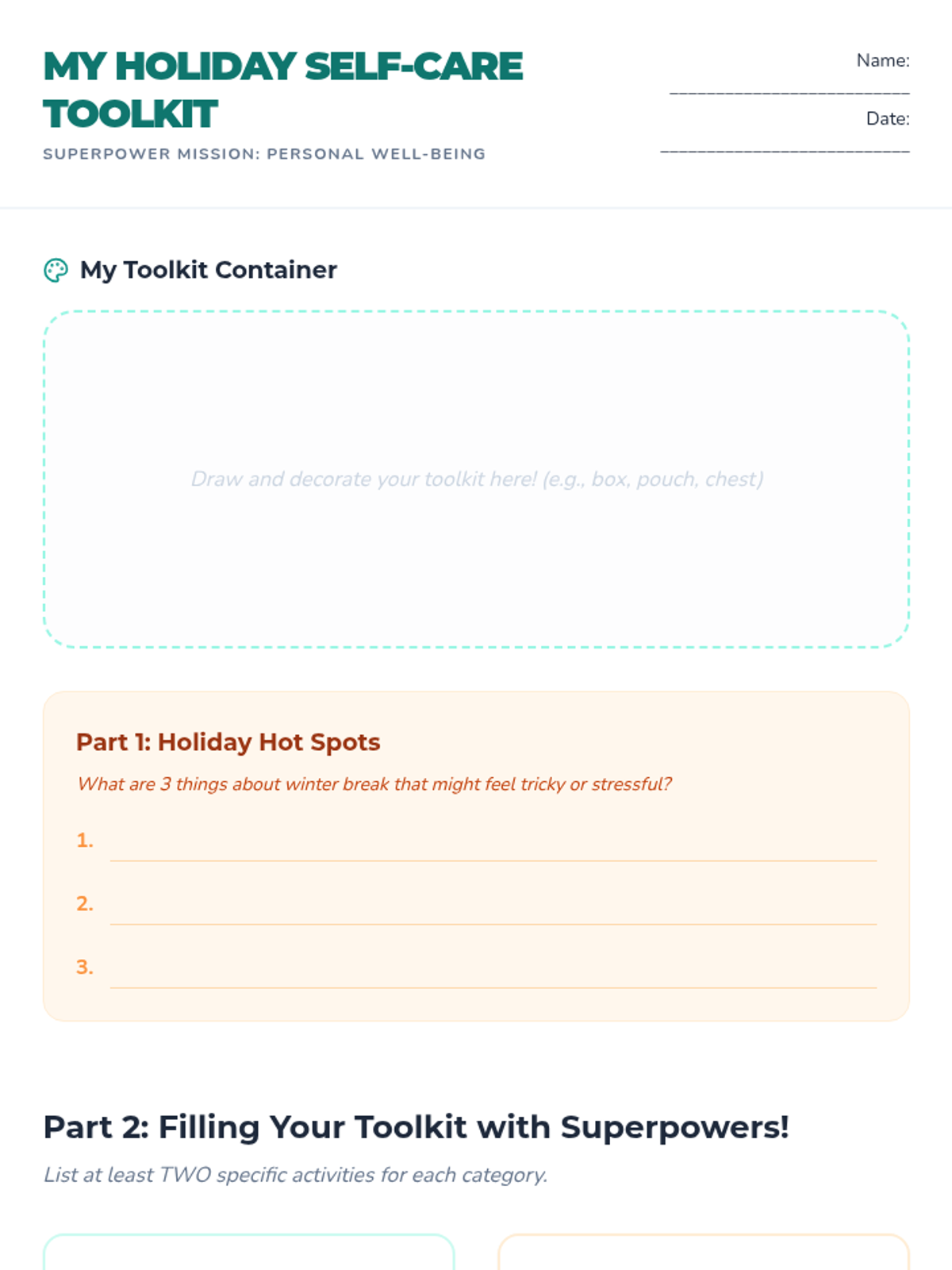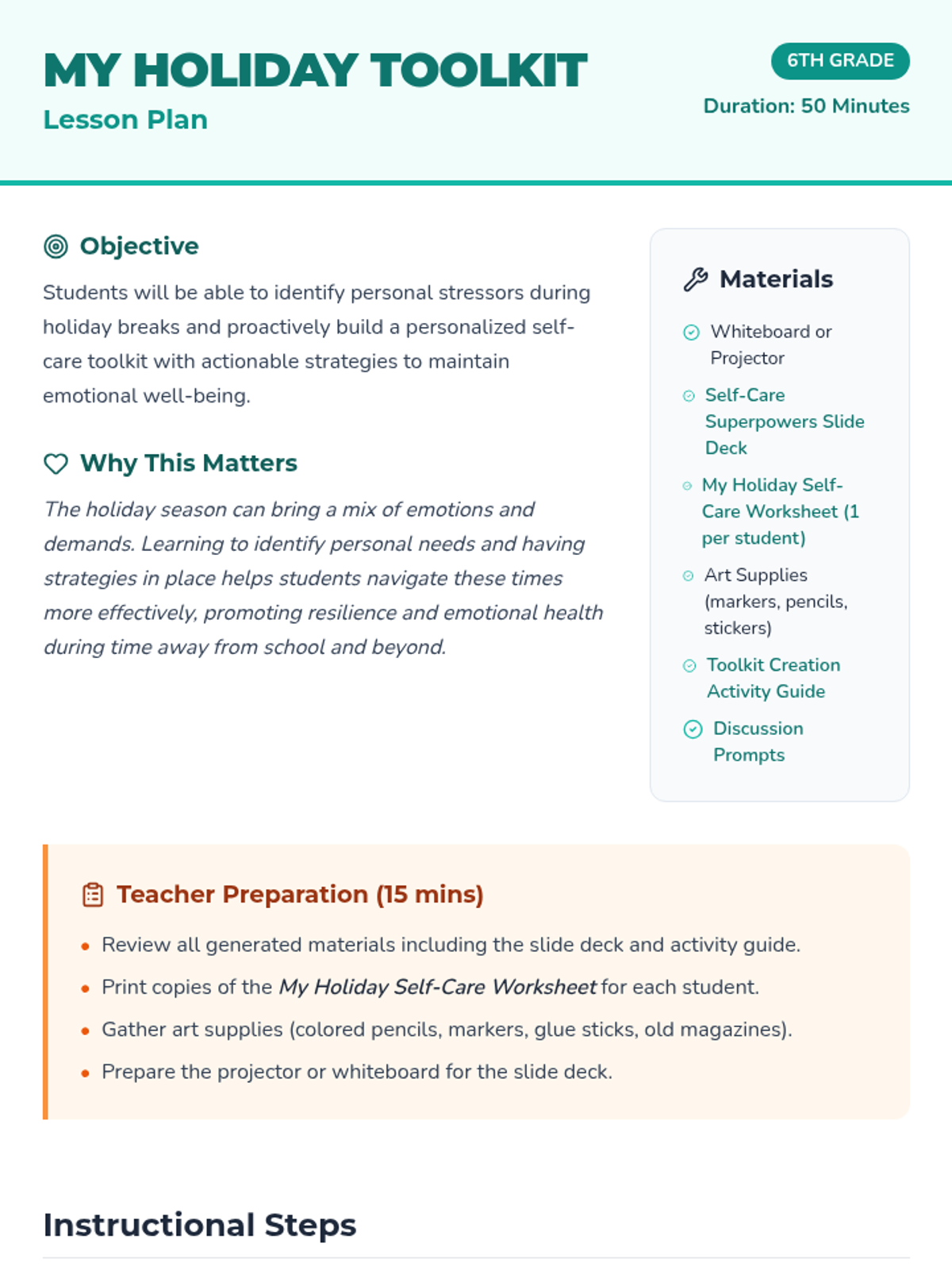 A proactive social-emotional learning lesson for 6th graders to build personalized self-care toolkits for the winter break. Students identify stressors and develop actionable strategies across physical, emotional, social, and creative categories to maintain well-being during the holidays.
