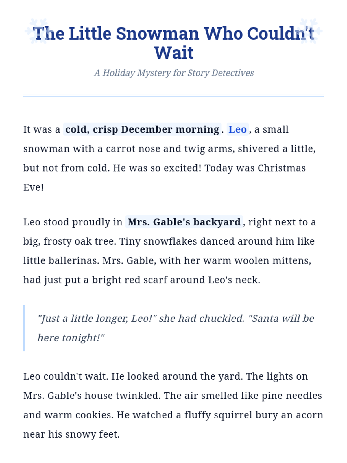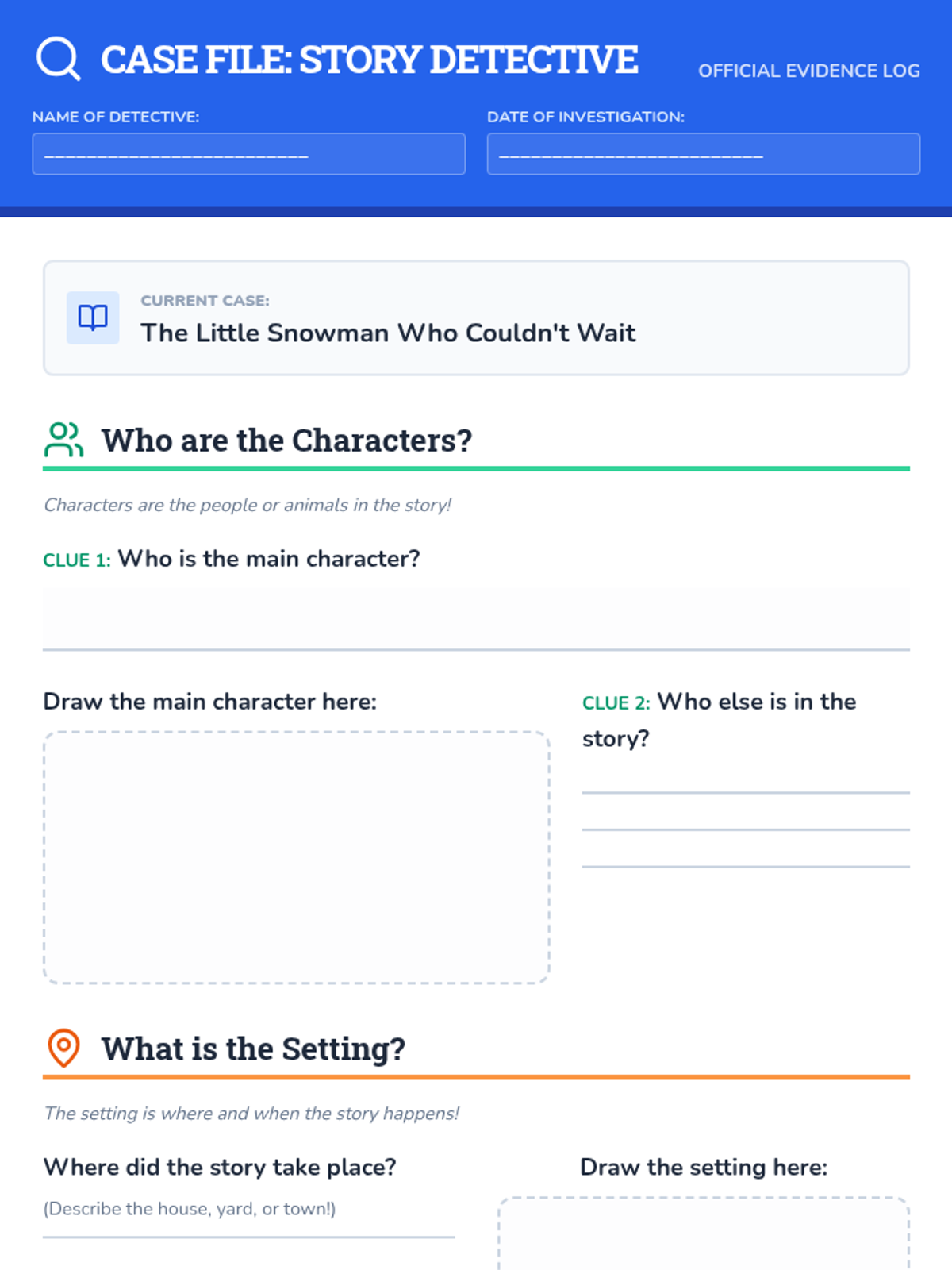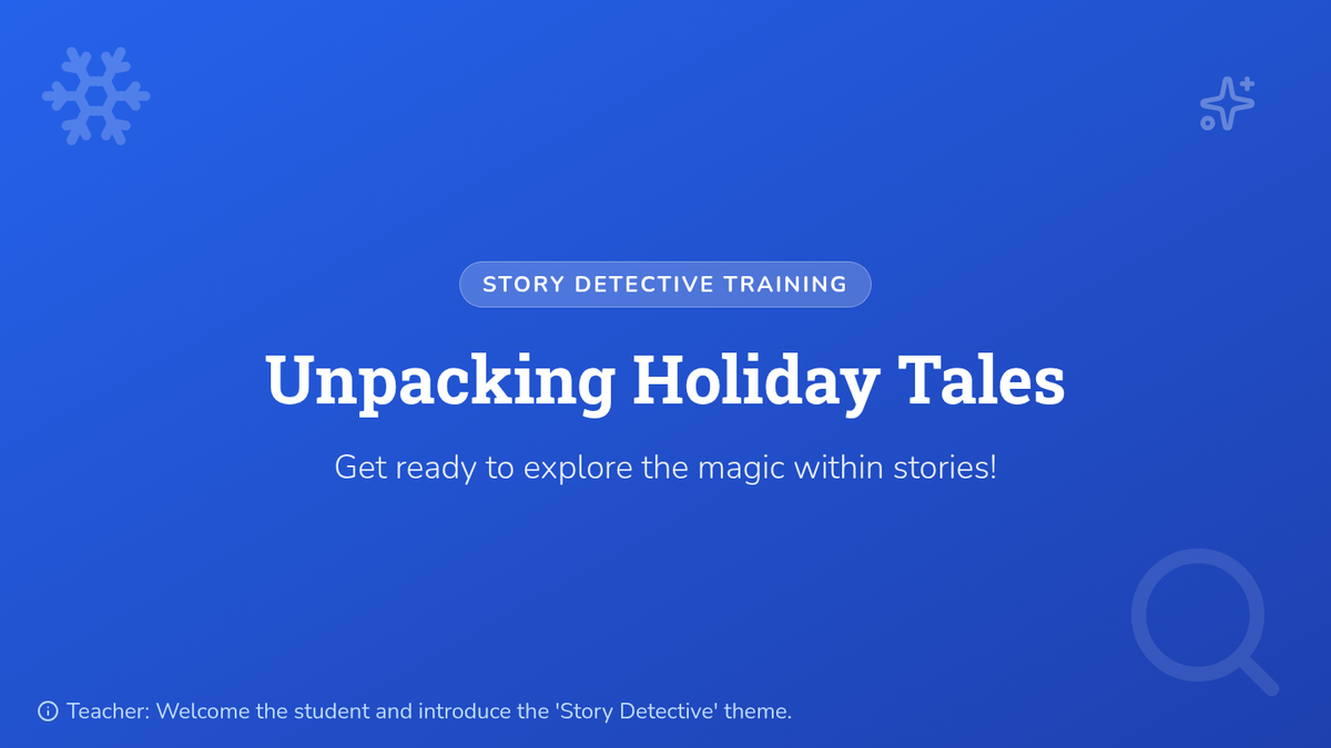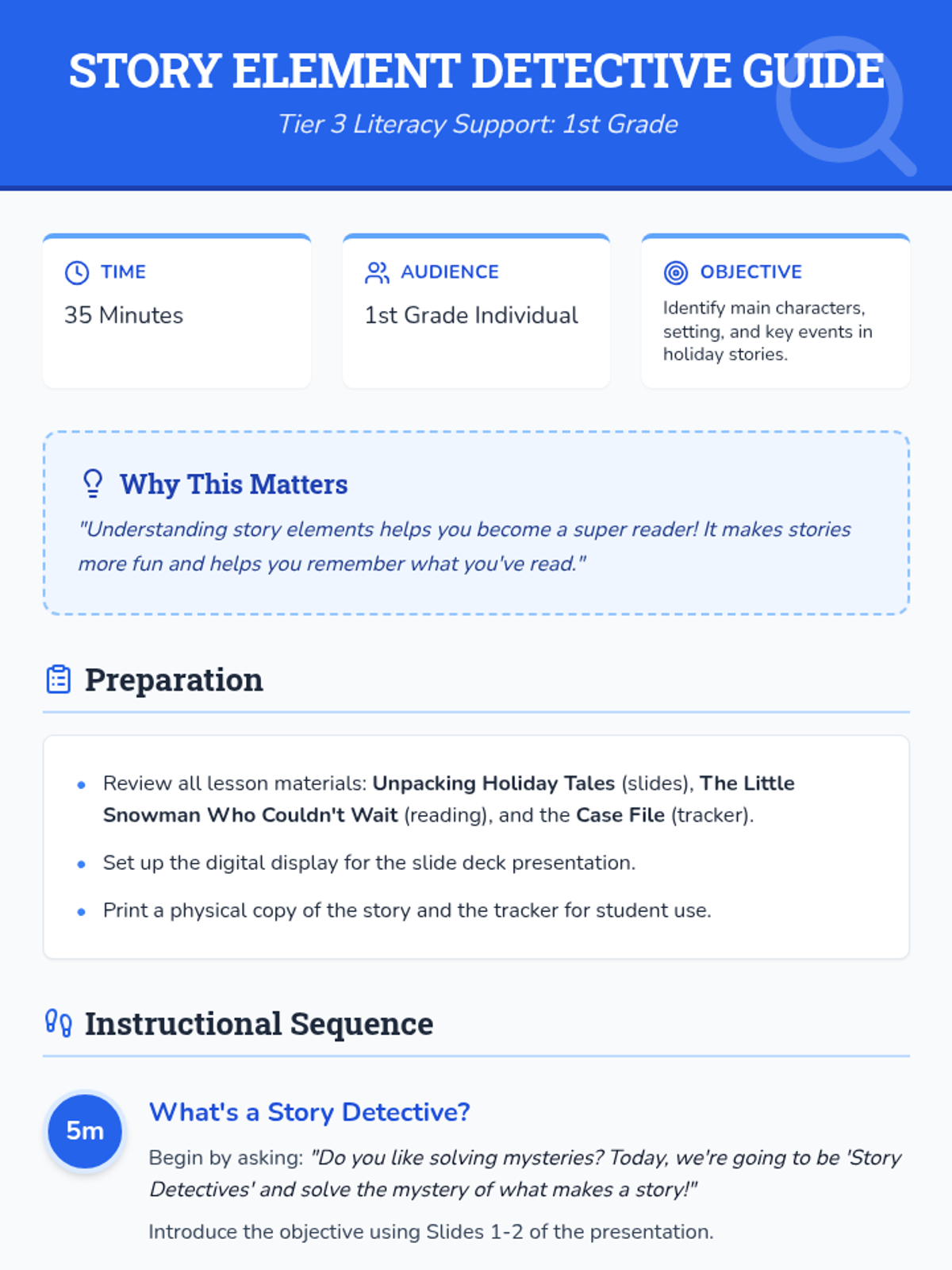 A 35-minute individual lesson for 1st graders to identify characters and settings in holiday stories using a 'Story Detective' theme.