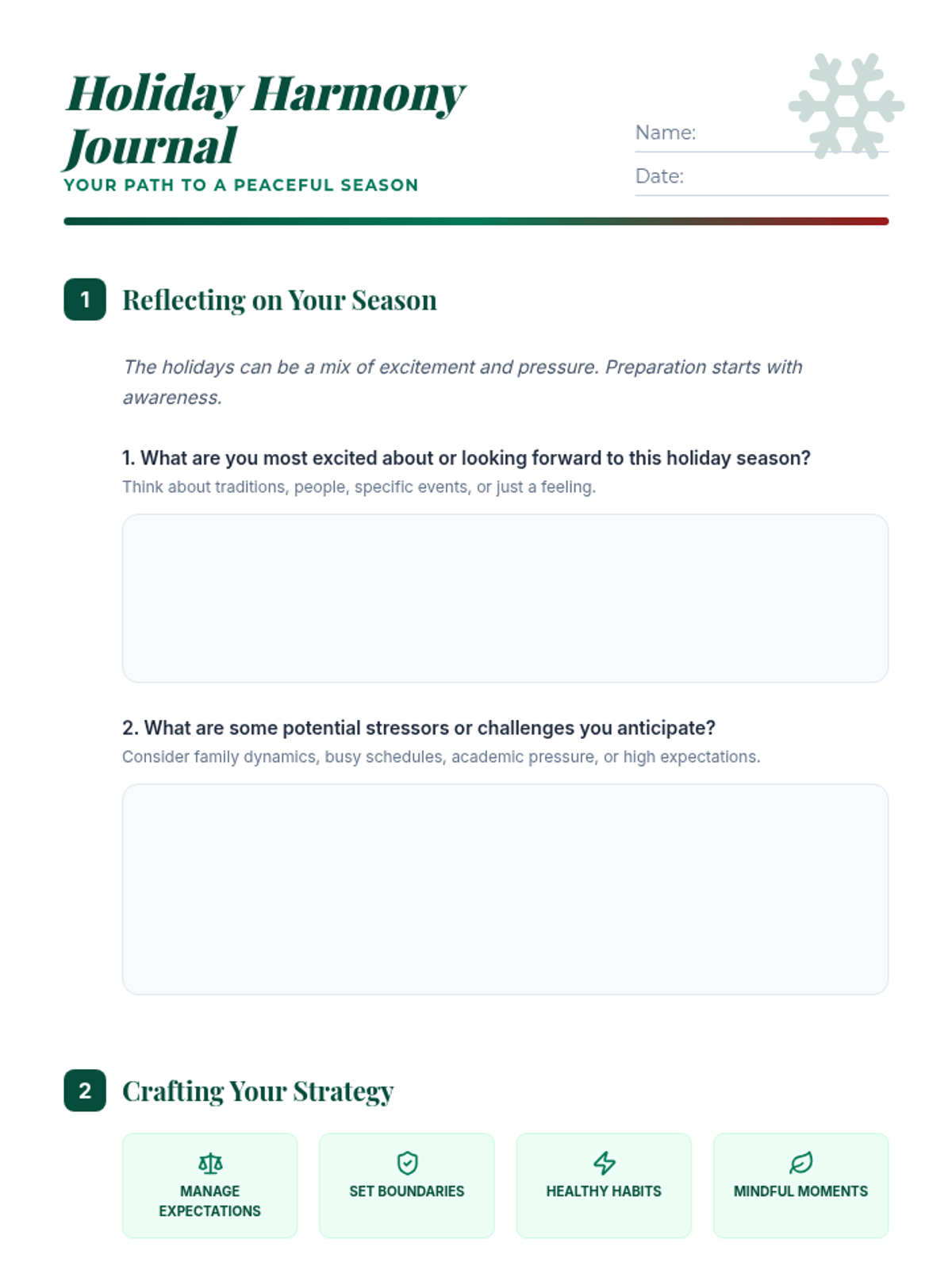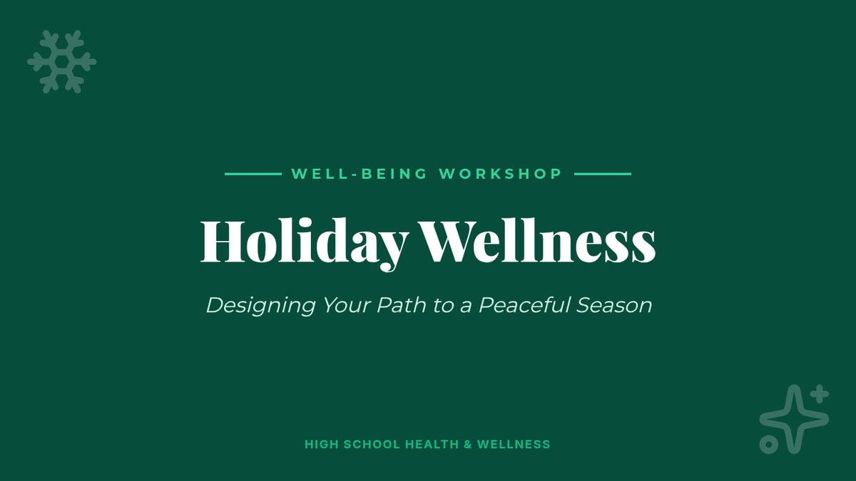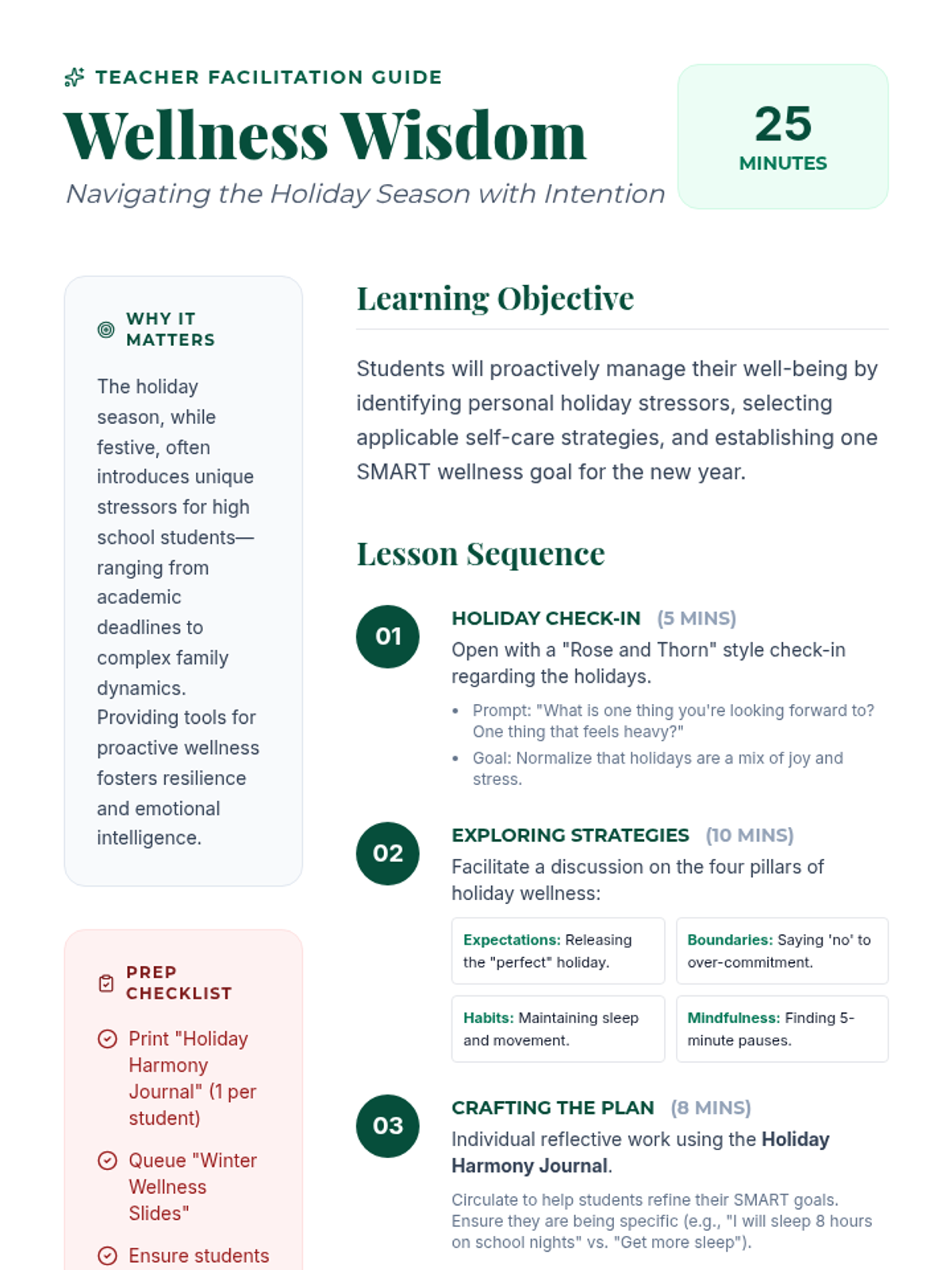 A 25-minute lesson for 9th-12th graders focused on proactive well-being during the holidays. Students identify stressors, select self-care strategies, and set a SMART wellness goal for the new year.