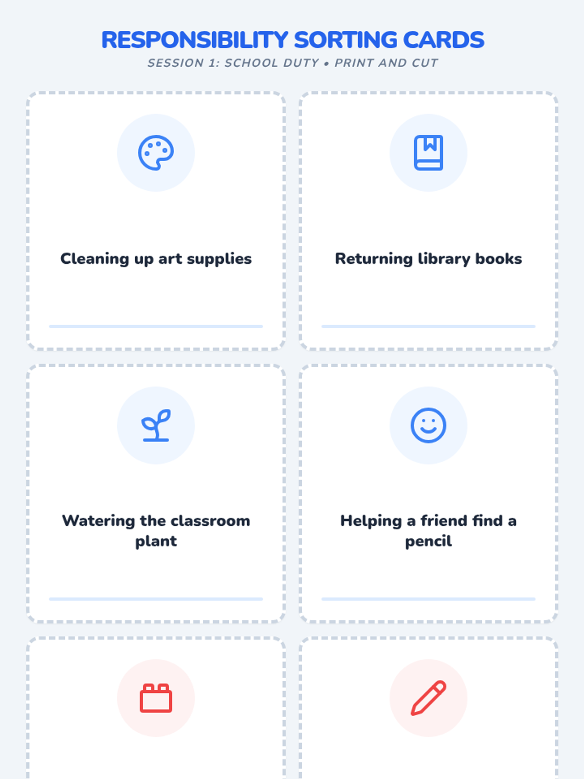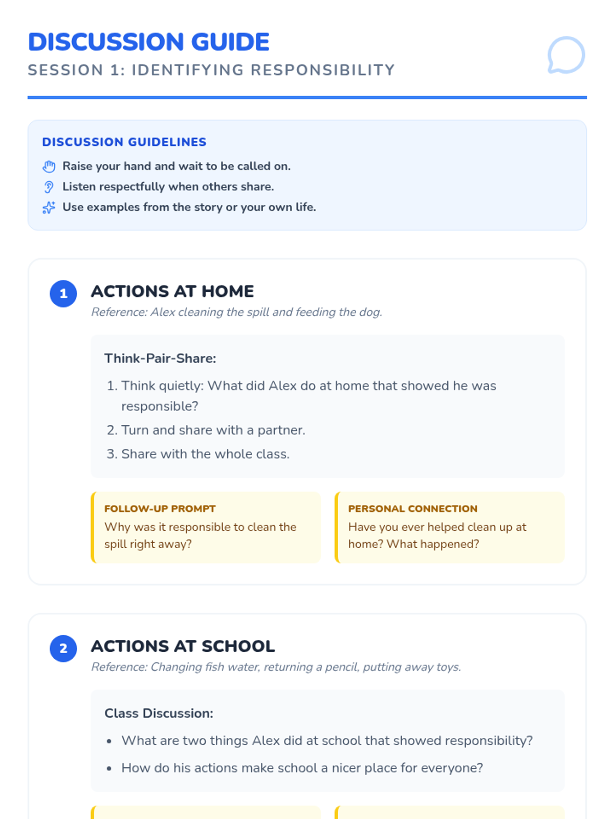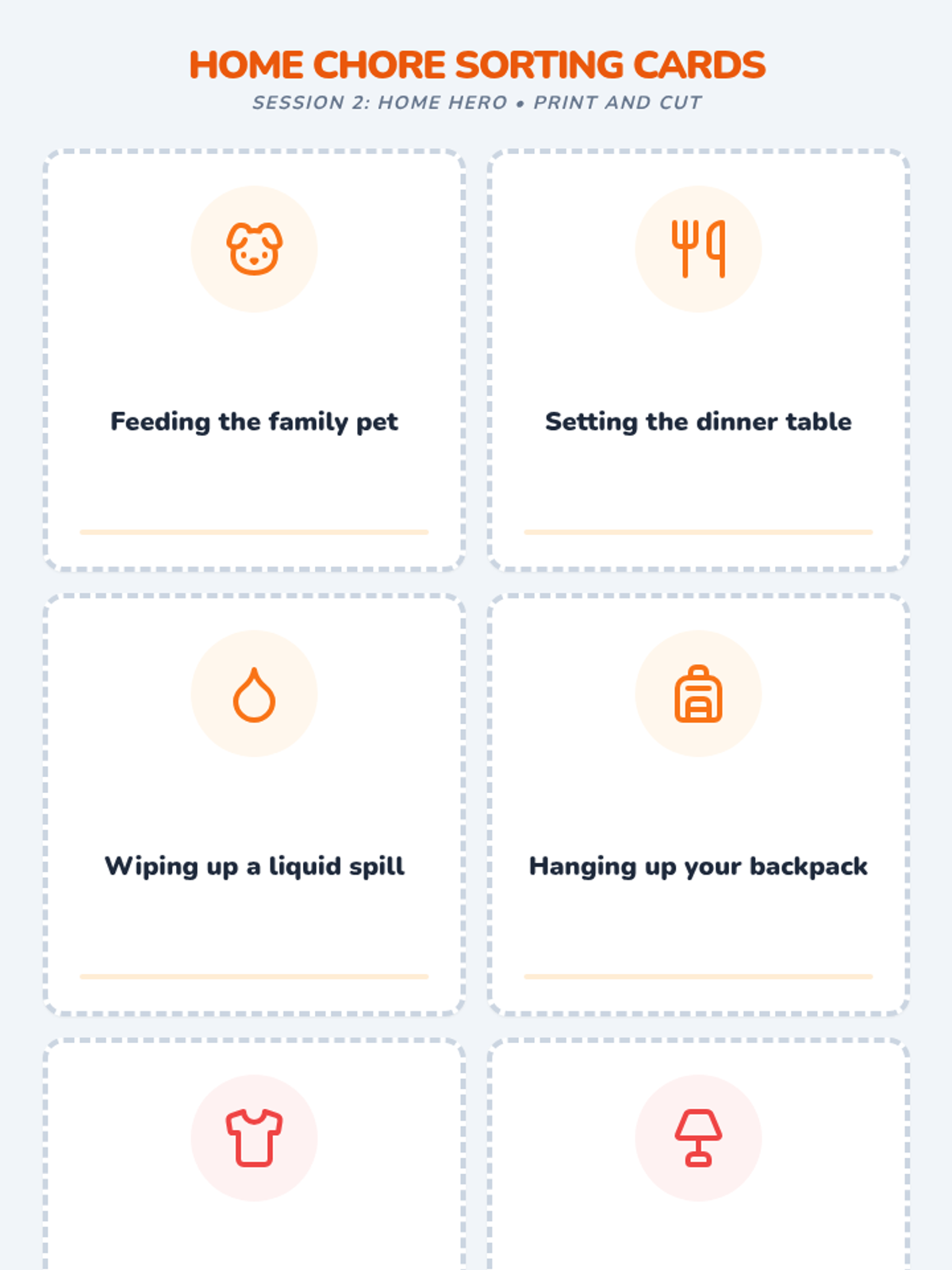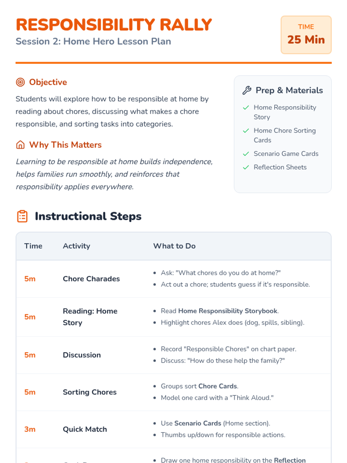 In the second 25-minute session, students shift their focus to home responsibilities, identifying chores and helpful actions that contribute to their family.