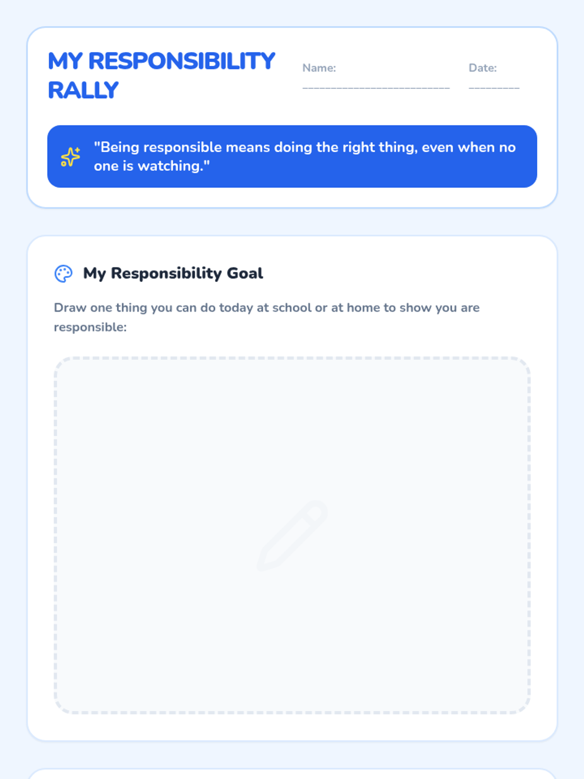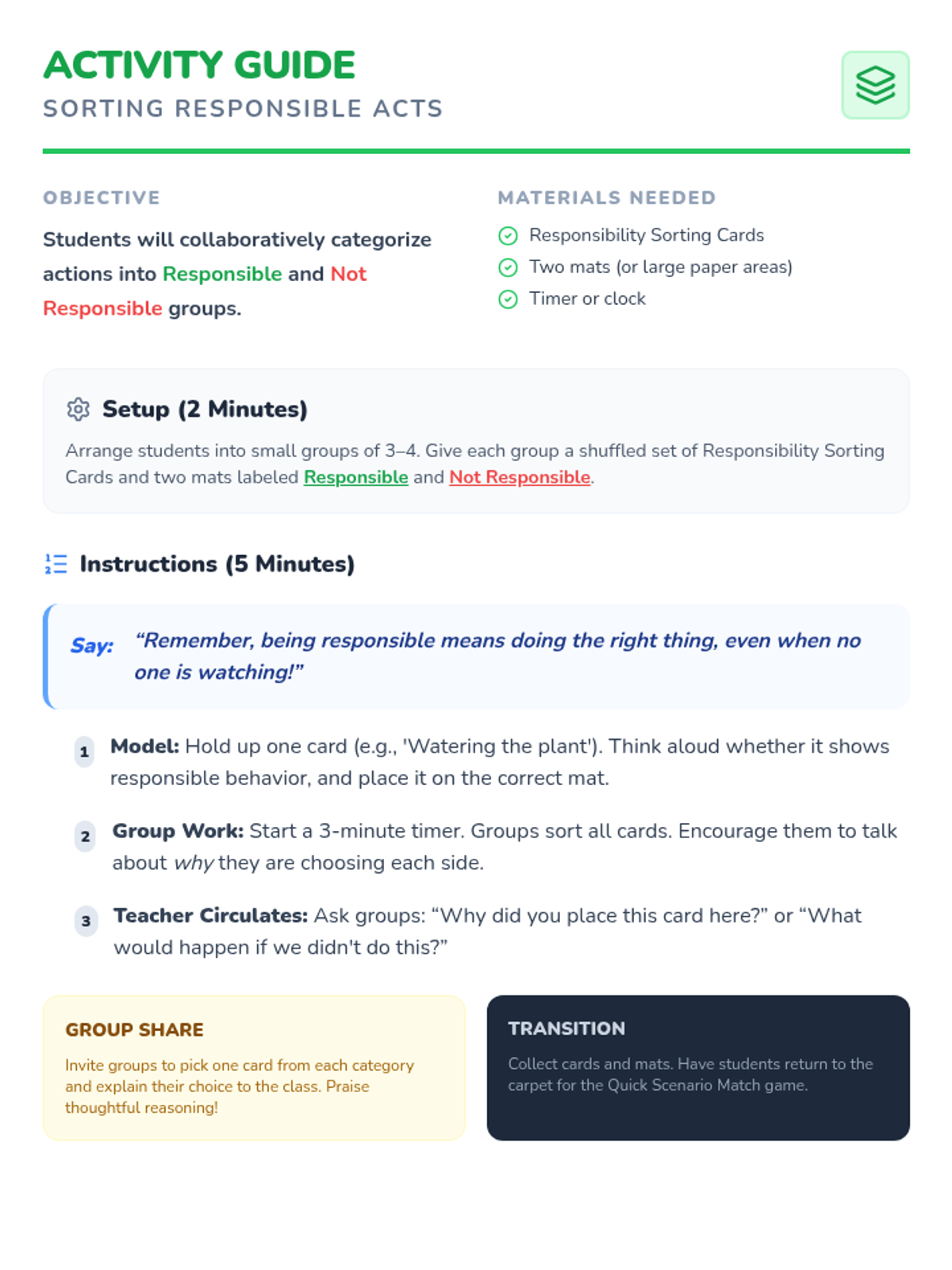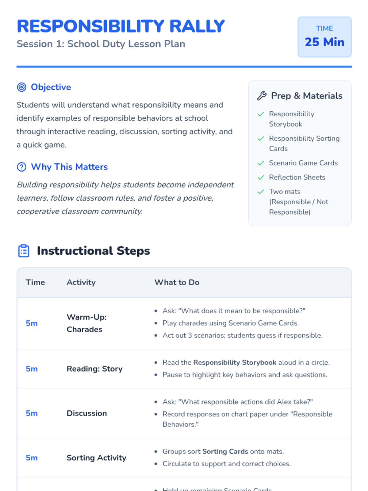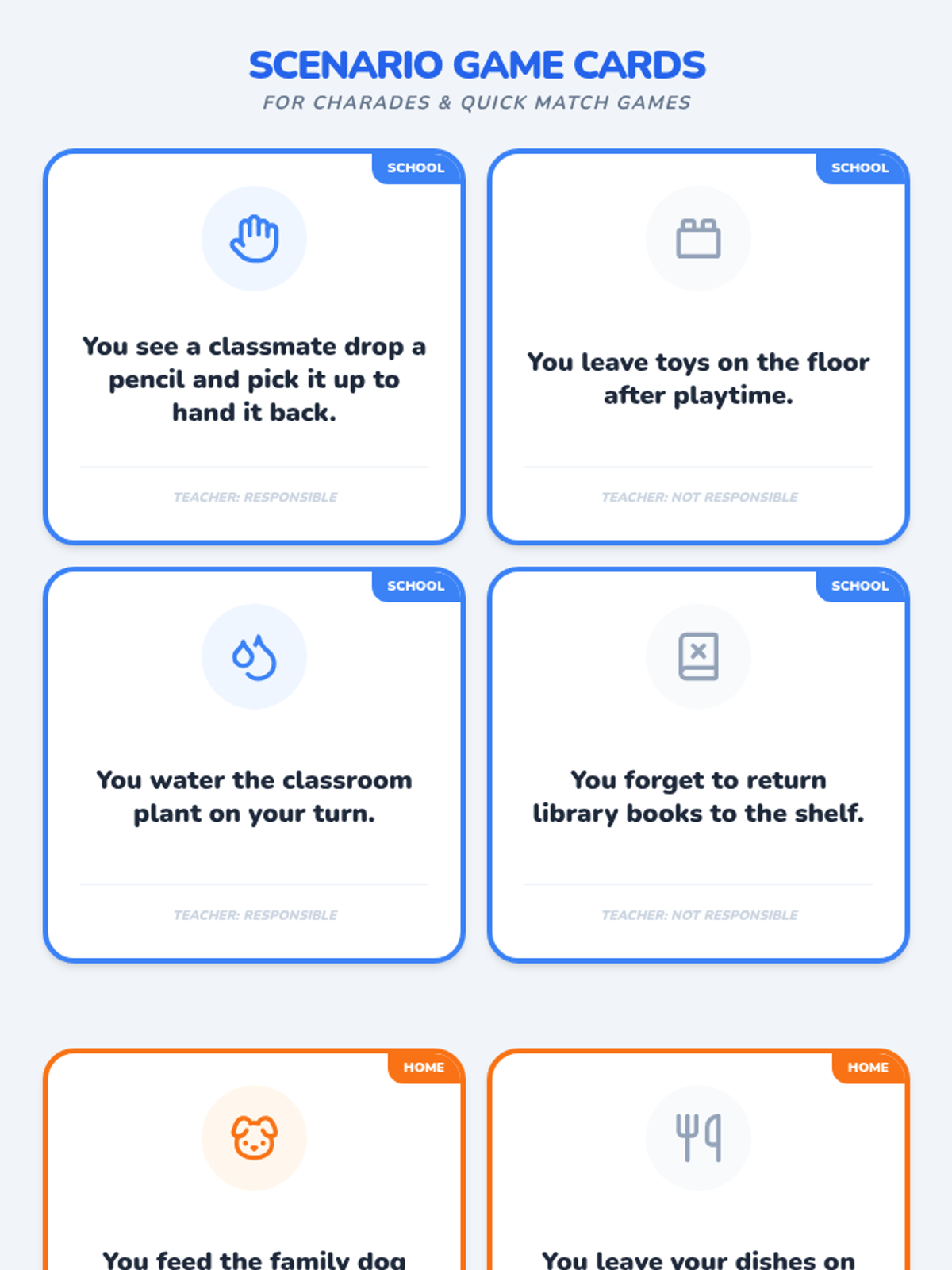 In the second 25-minute session, students shift their focus to home responsibilities, identifying chores and helpful actions that contribute to their family.