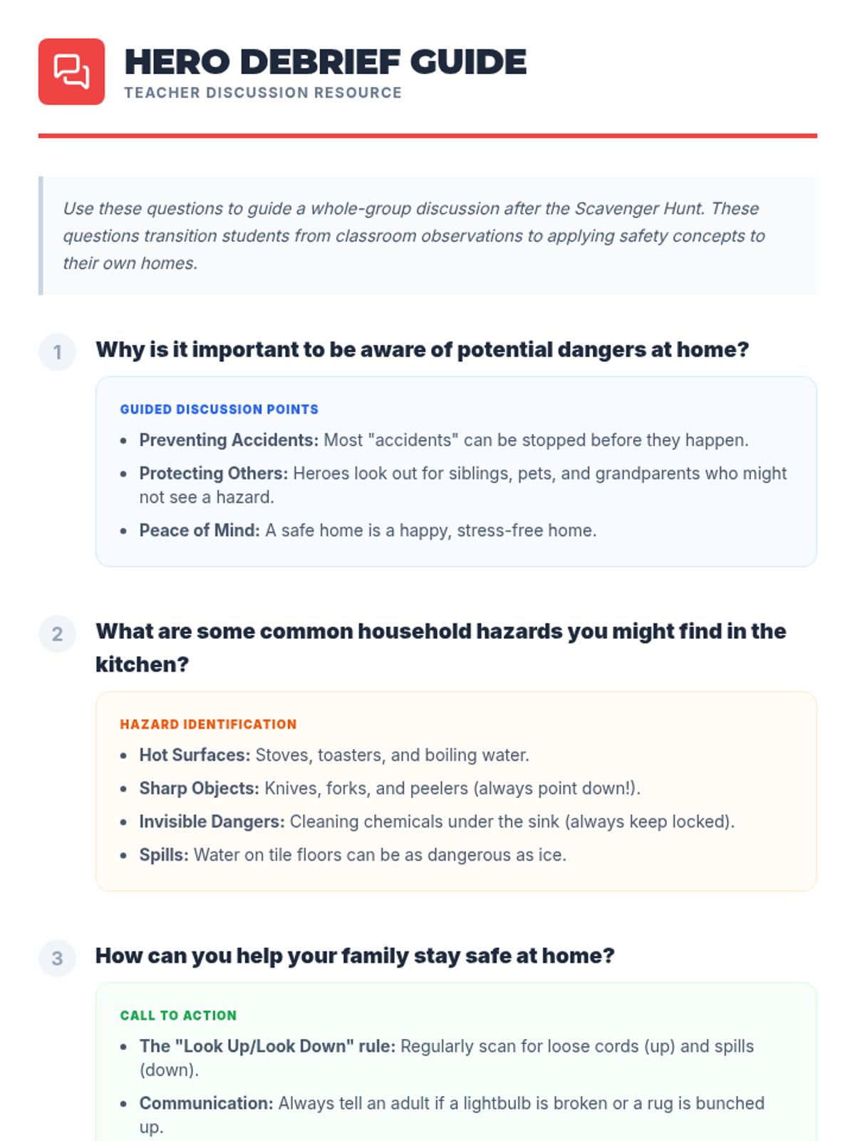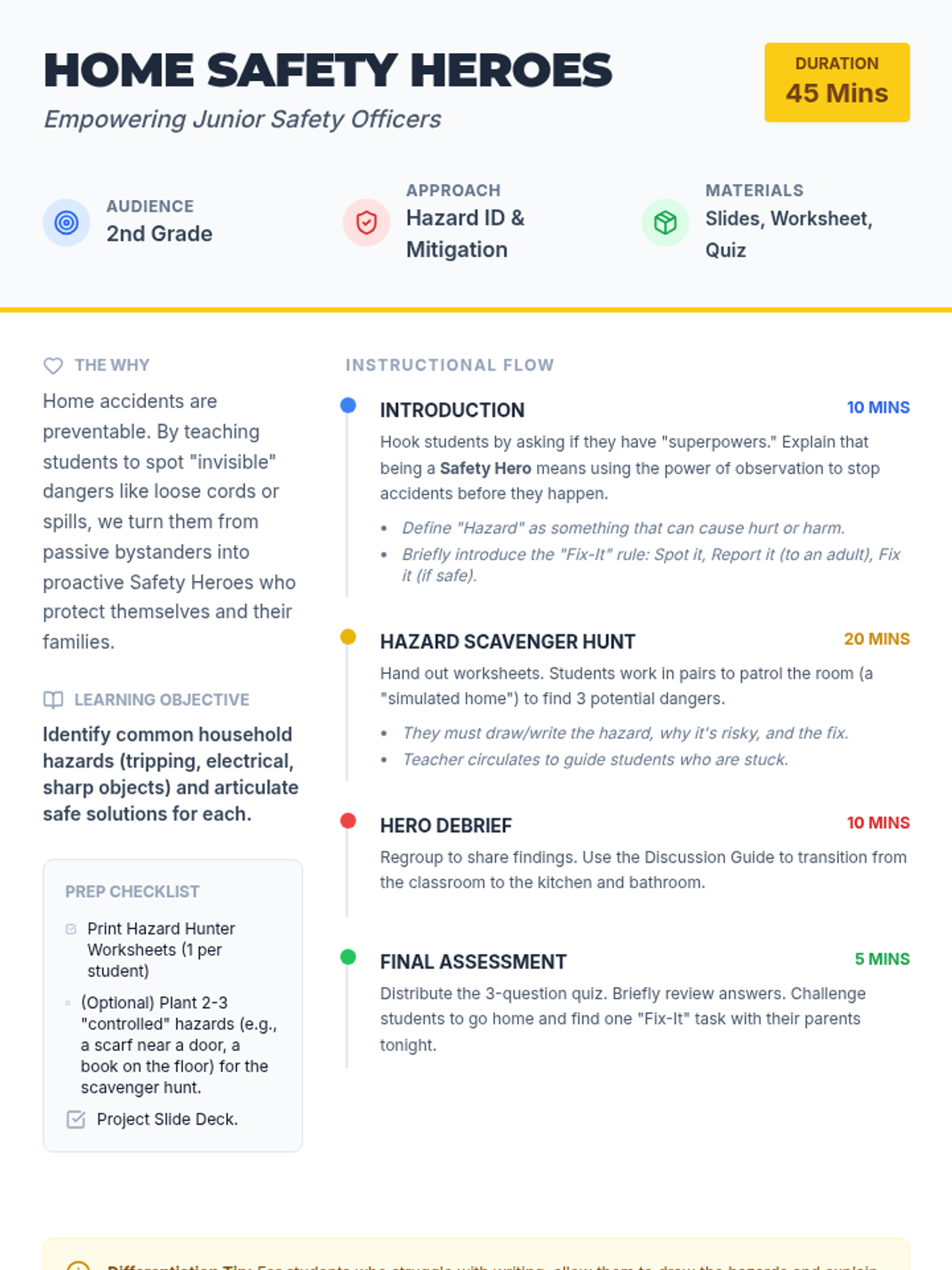 A comprehensive lesson for 2nd graders to identify and mitigate common household hazards through a 'Safety Hero' lens. Includes a scavenger hunt, discussion, and assessment.