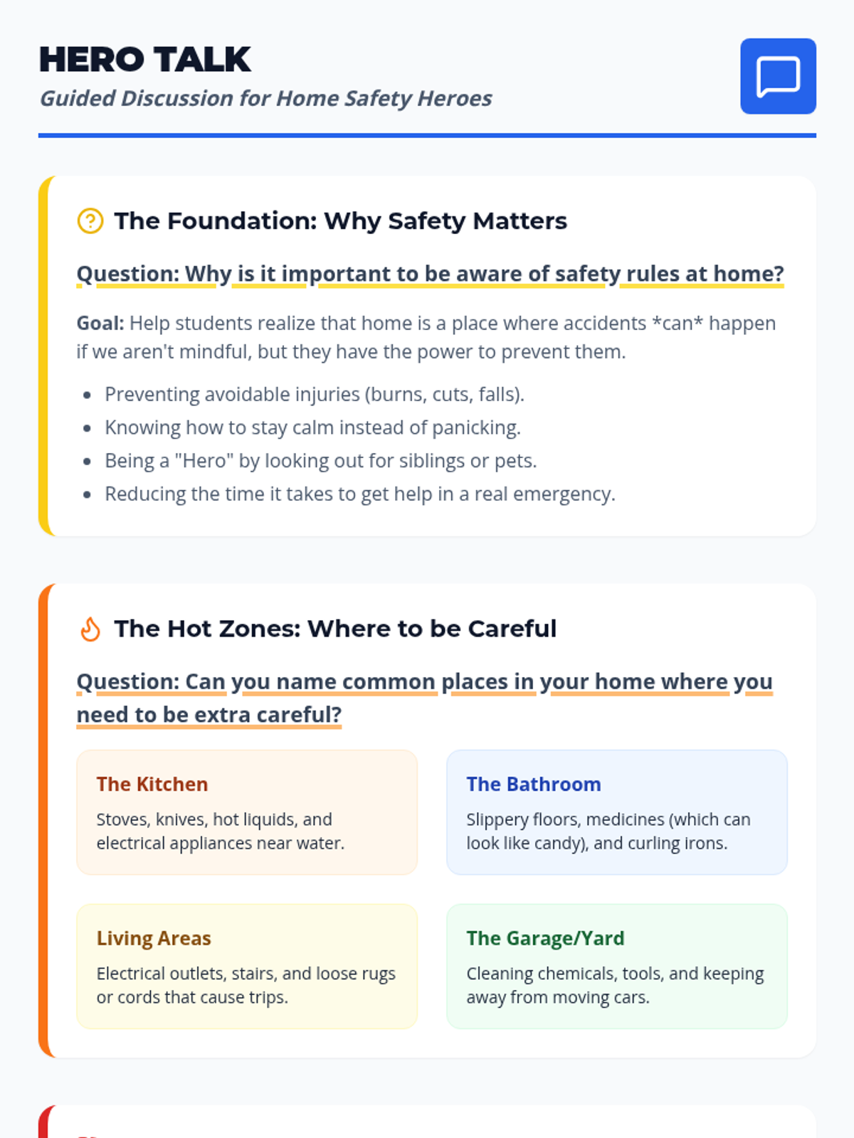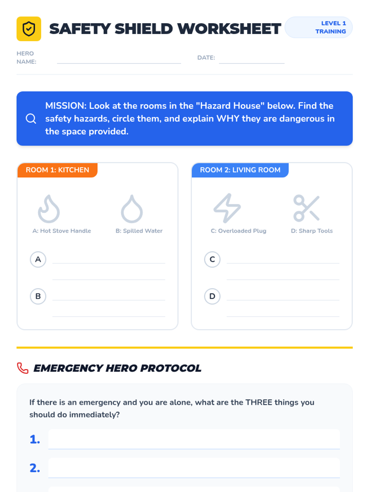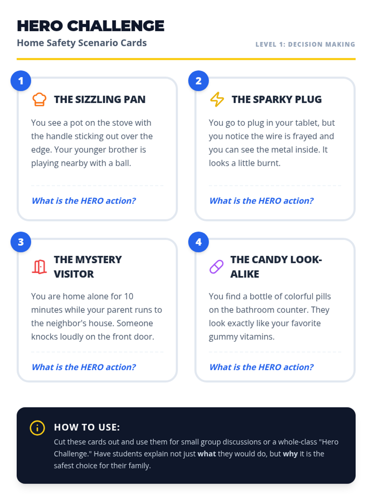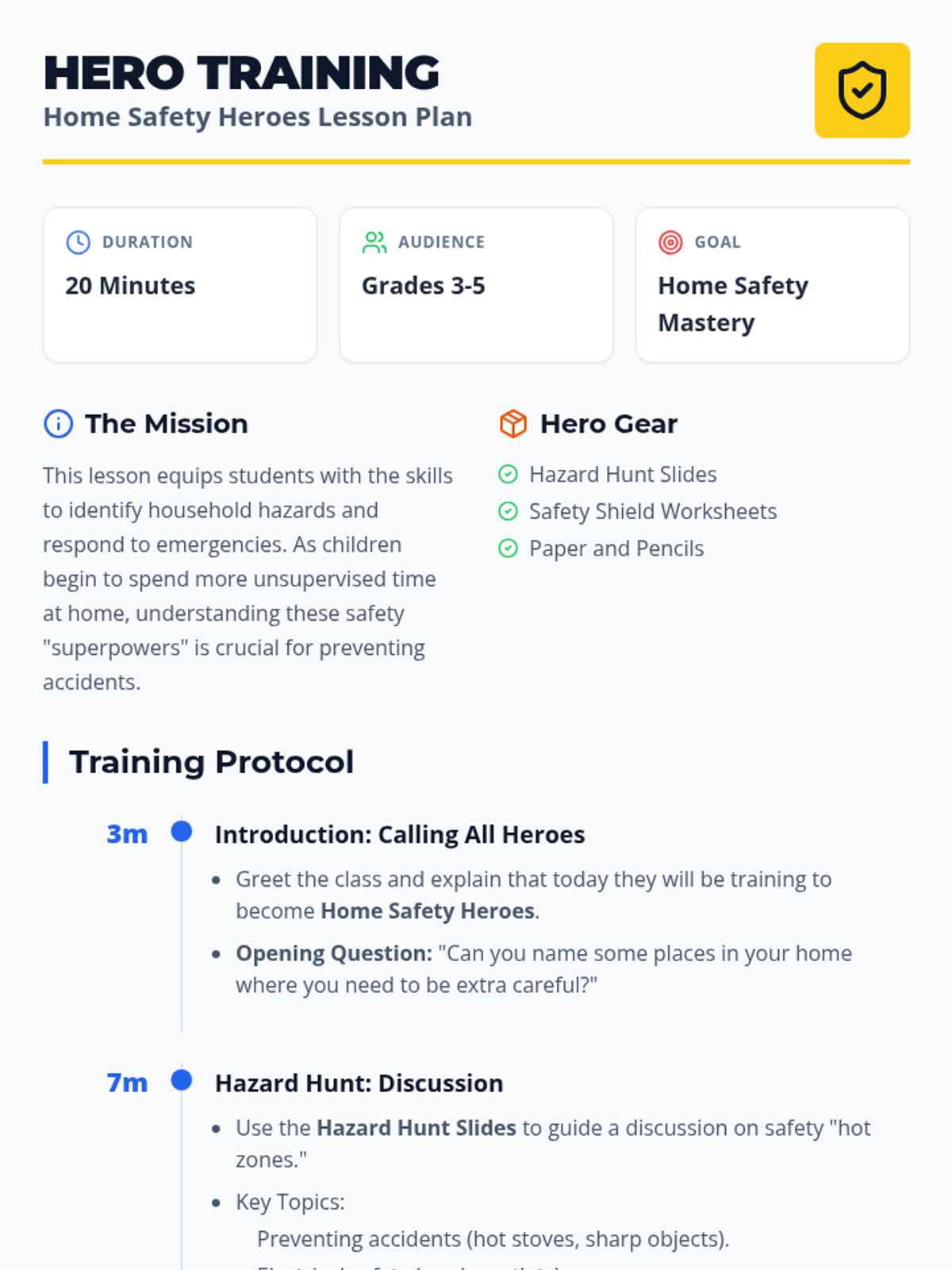 A quick 20-minute lesson designed for 3rd-5th graders to identify household hazards and learn emergency procedures, turning students into 'Safety Heroes' who can protect themselves and their families at home.