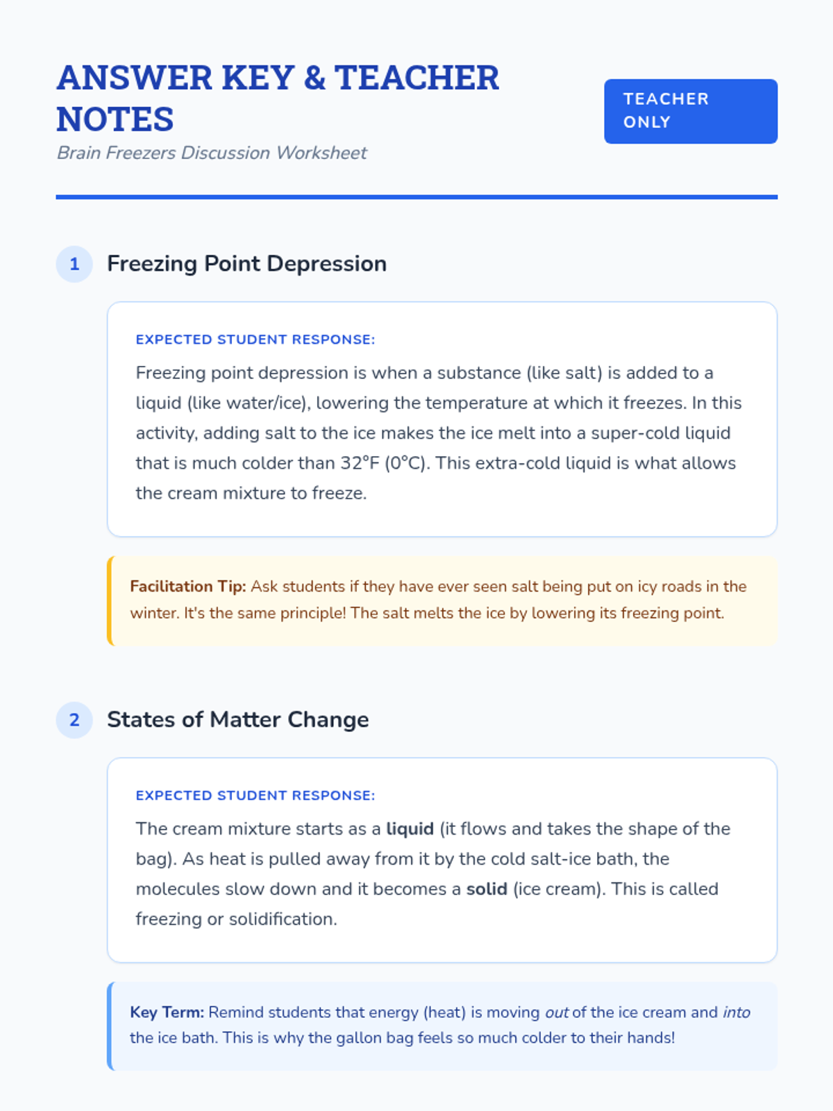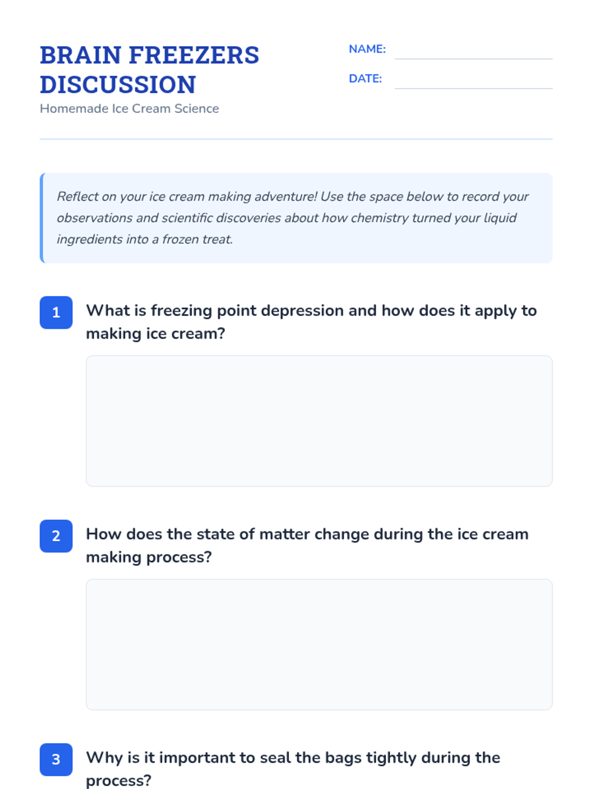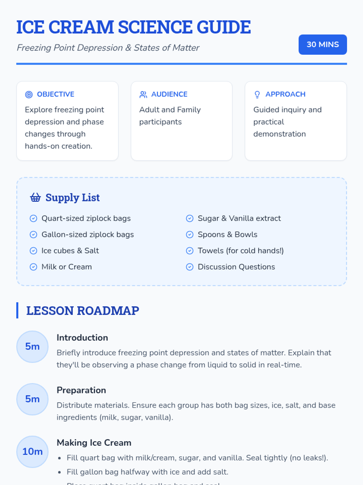 A hands-on chemistry lesson where participants explore freezing point depression and states of matter by making homemade ice cream in a bag.
