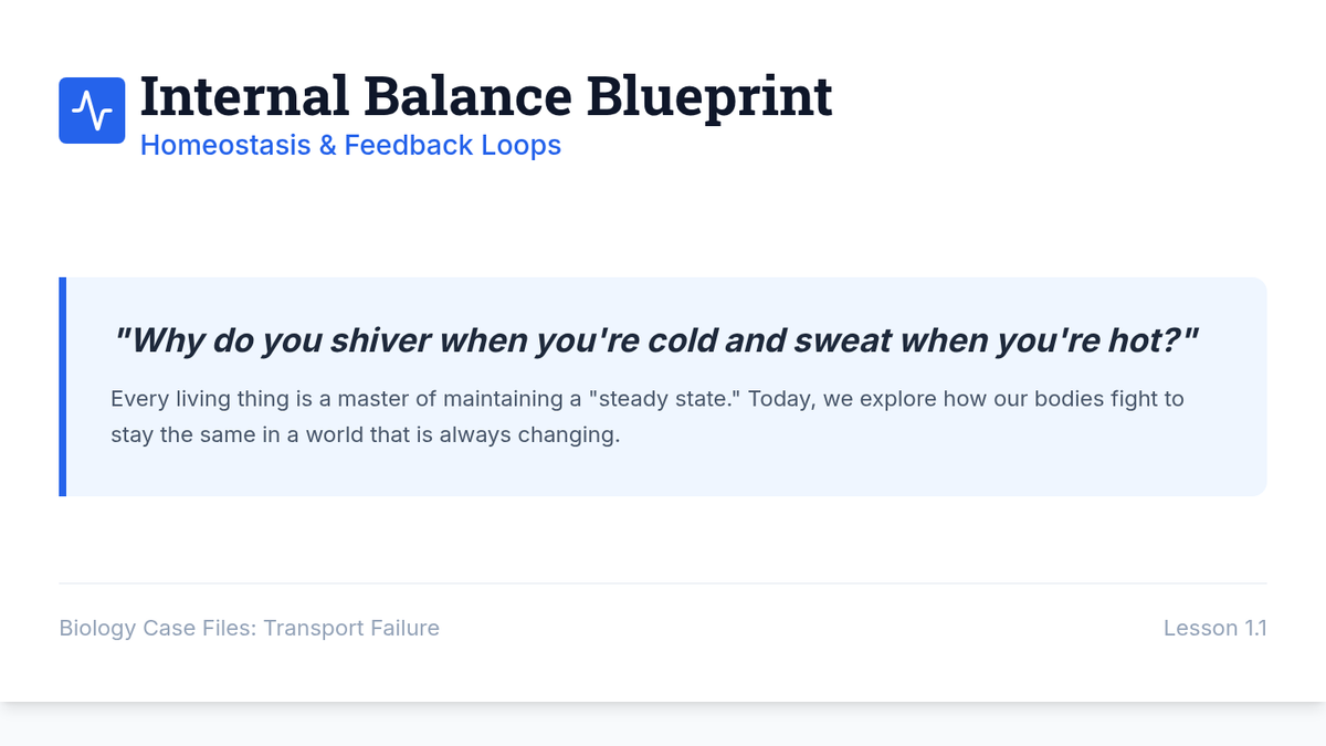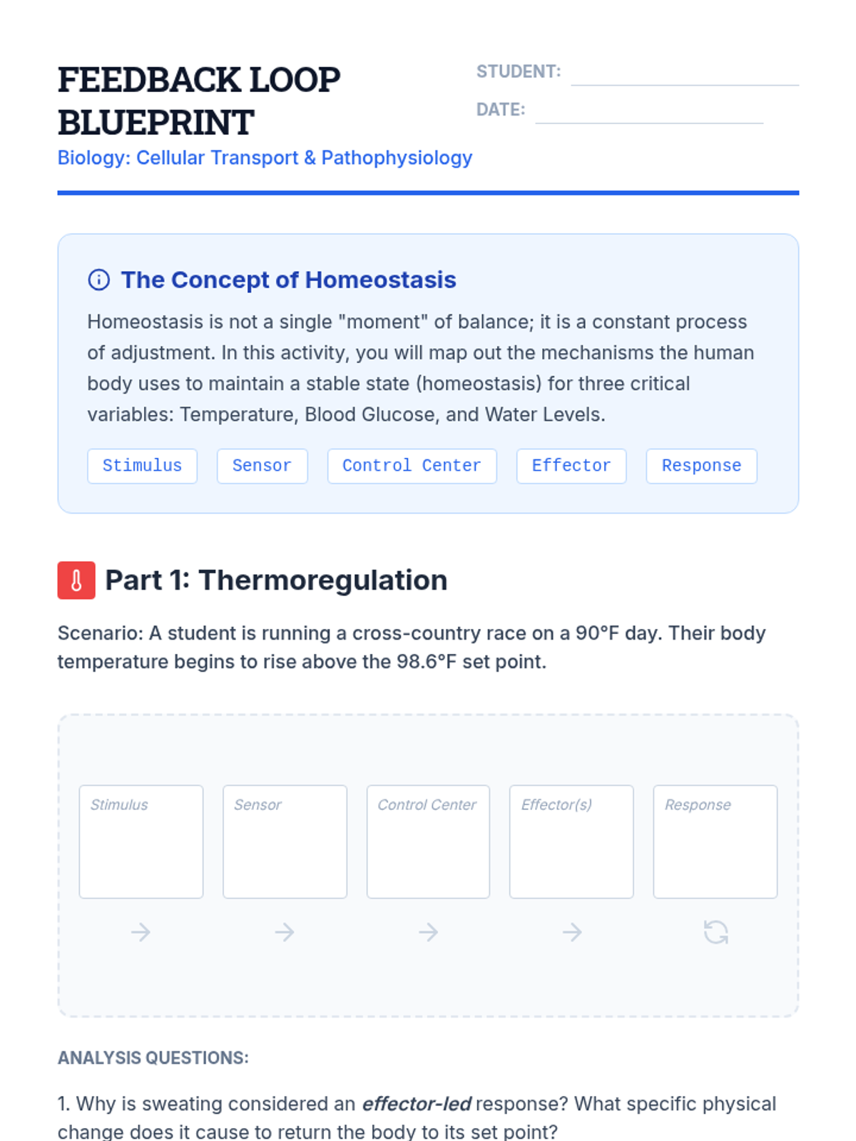 Students establish the foundational concept of homeostasis and the feedback loops that maintain it. They learn to identify set points and map how the body responds to internal and external changes to keep cells in their ideal environment.