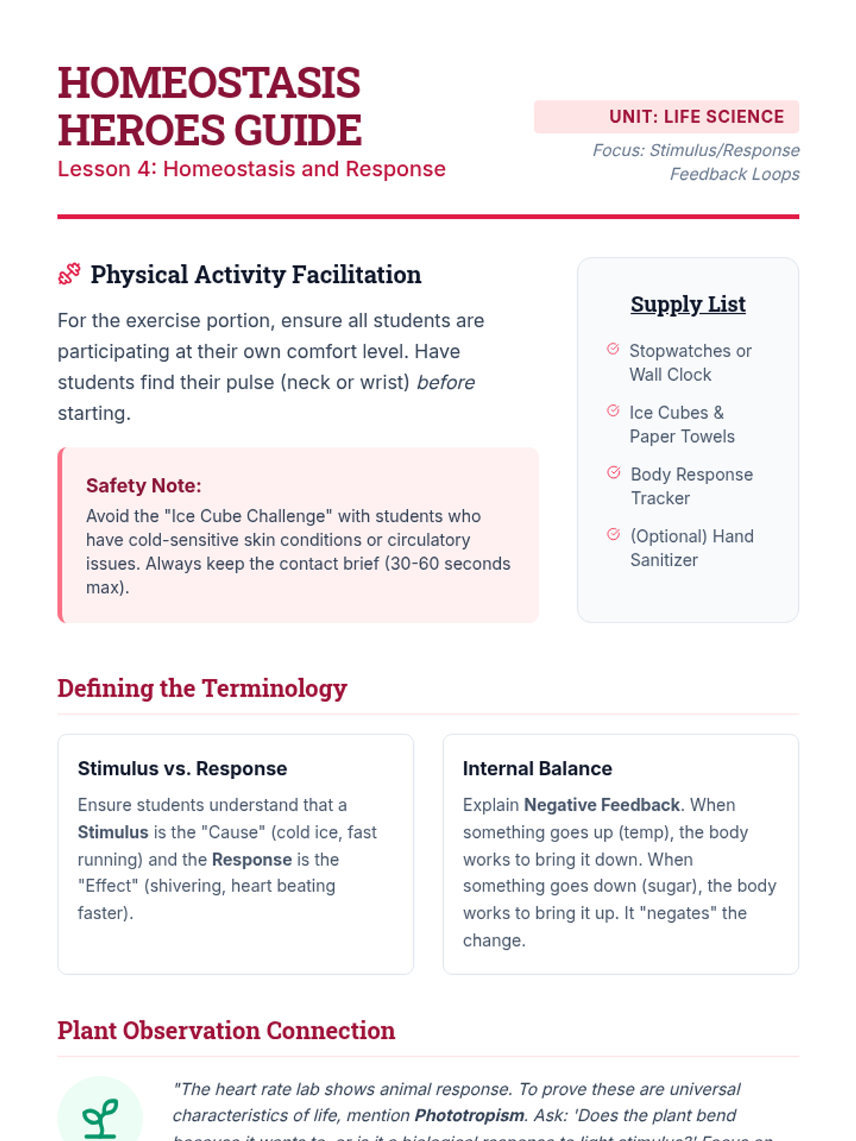 Focusing on homeostasis and response to stimuli, students analyze their own physiological reactions and observe plant phototropism to understand internal balance.