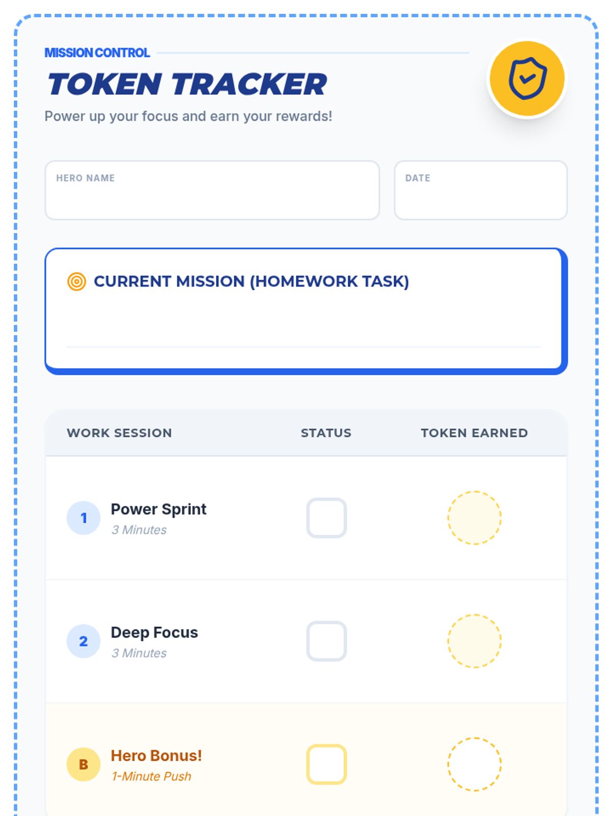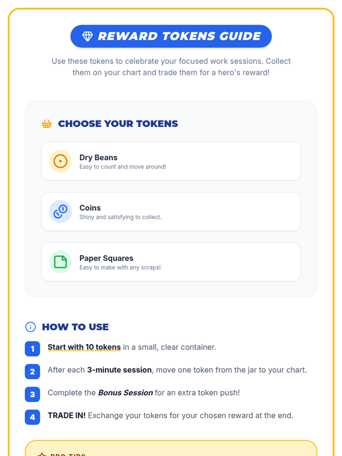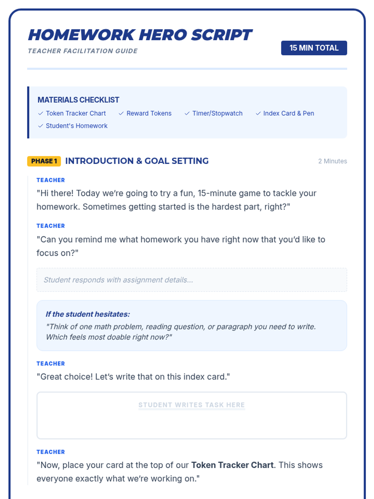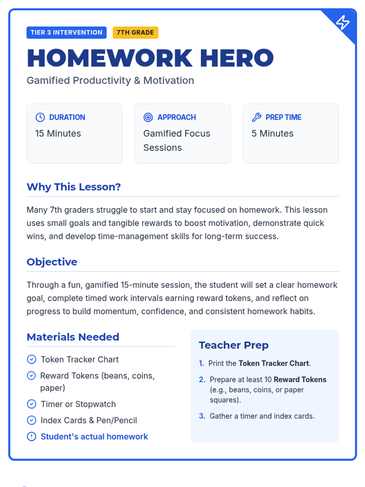 A 15-minute Tier 3 individual lesson for 7th graders to combat homework procrastination through a gamified, token-based system focusing on short, timed bursts of productivity.