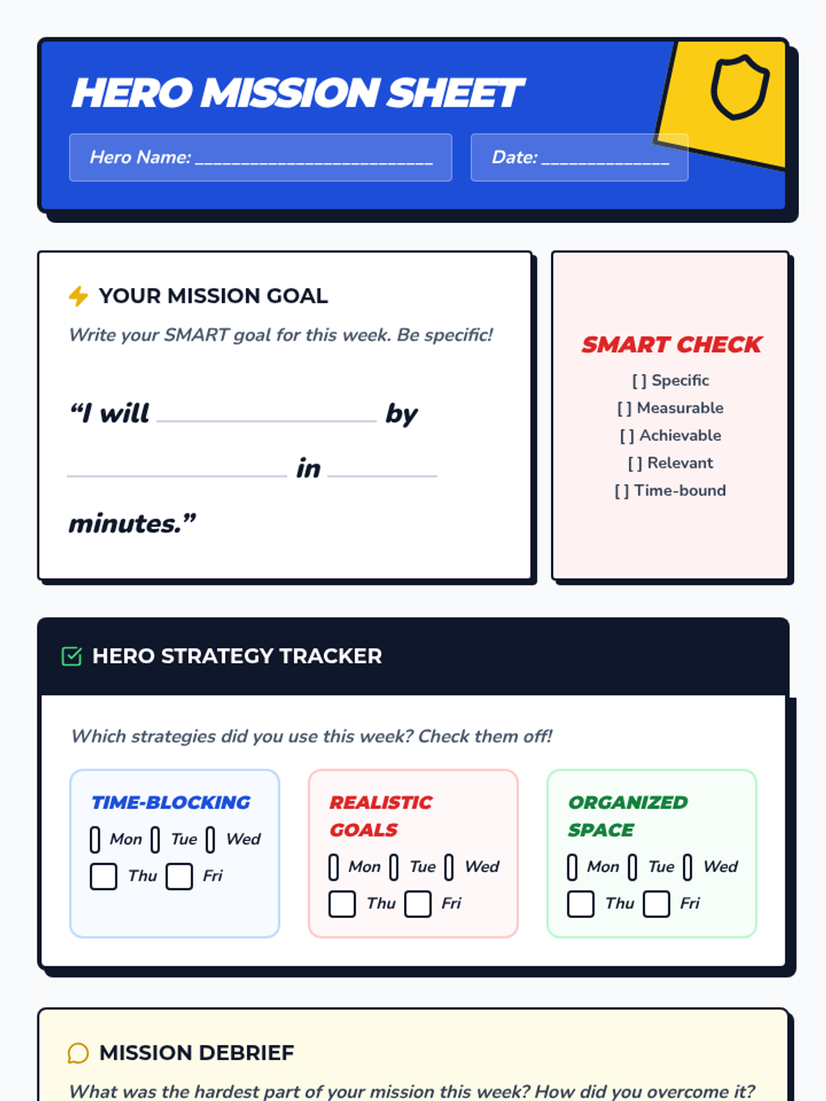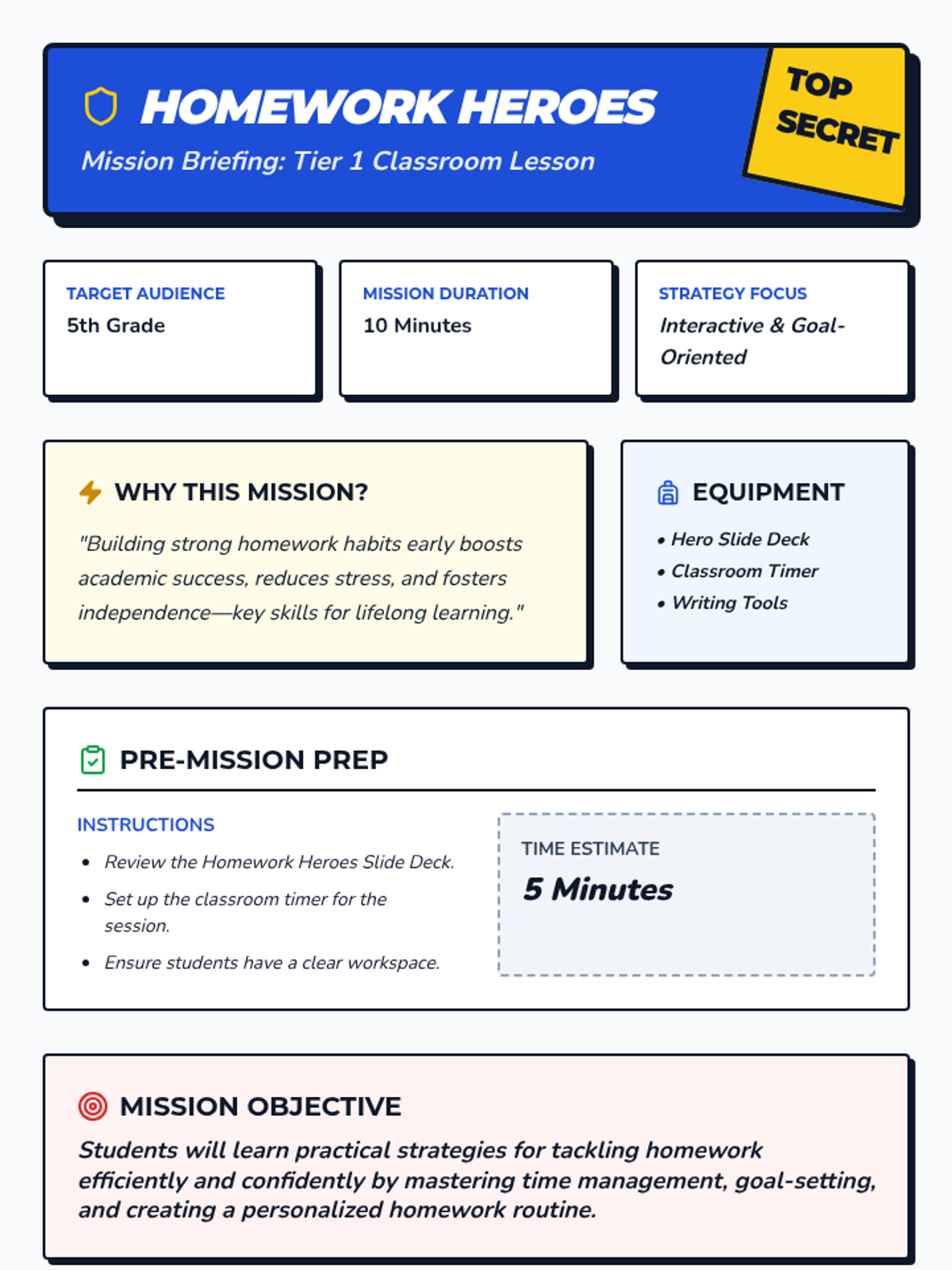 A quick, high-energy 10-minute session for 5th graders to master time-management, goal-setting, and workspace organization for homework success.