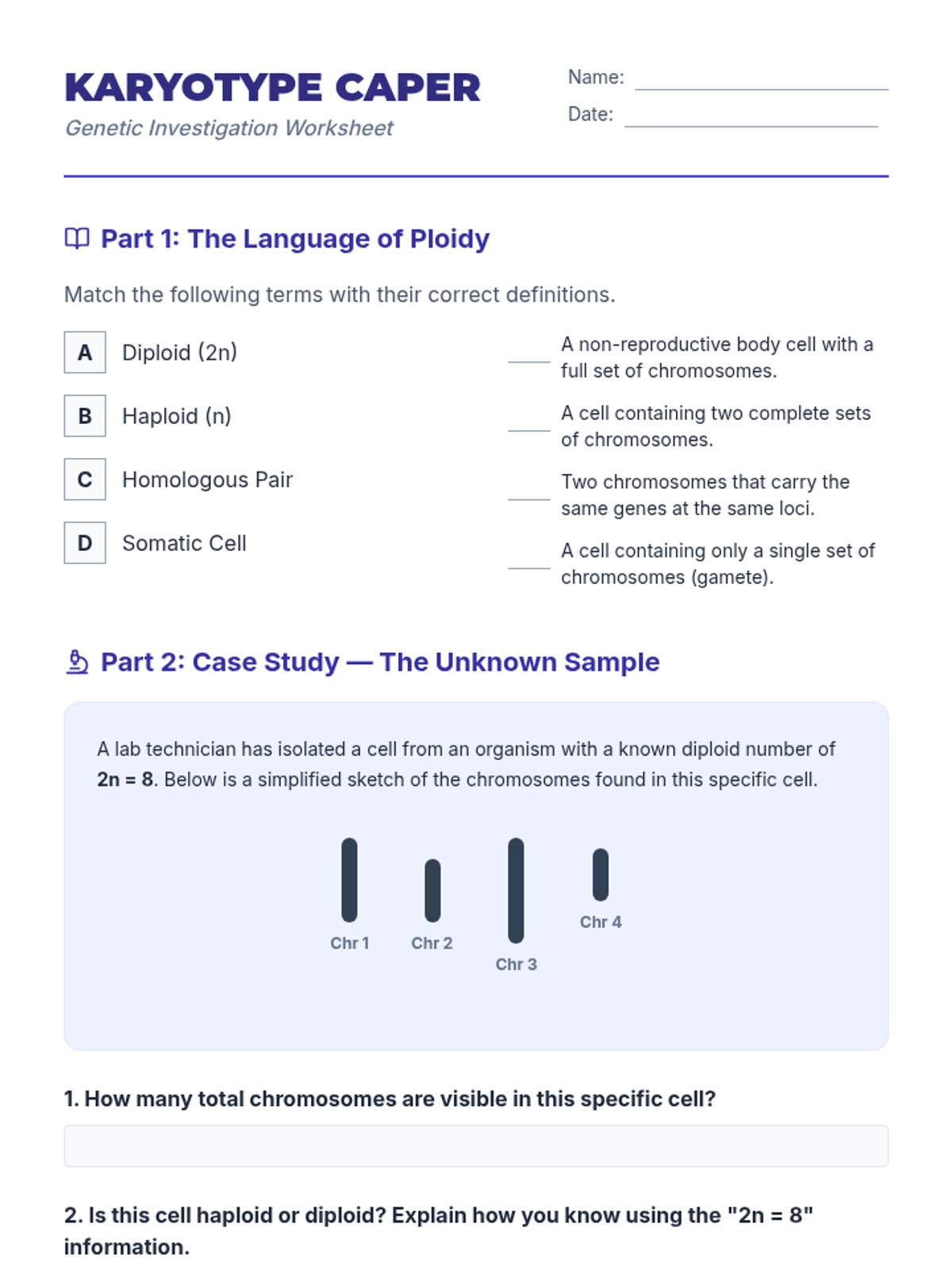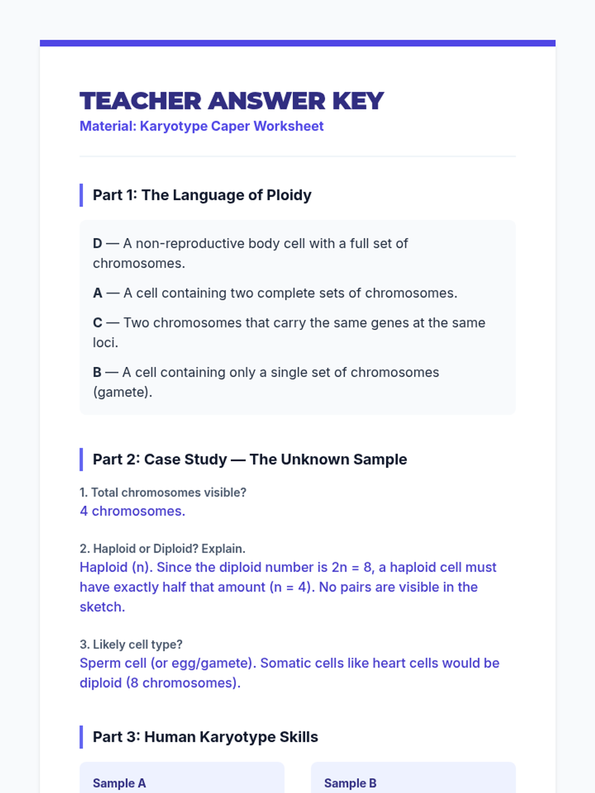 Students distinguish between haploid and diploid cells and define homologous pairs, using karyotype charts to identify somatic cells versus gametes based on chromosome count.