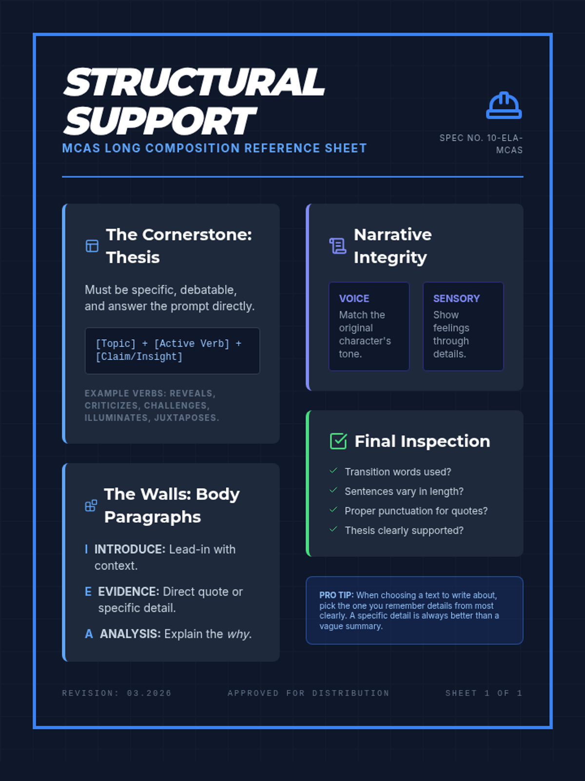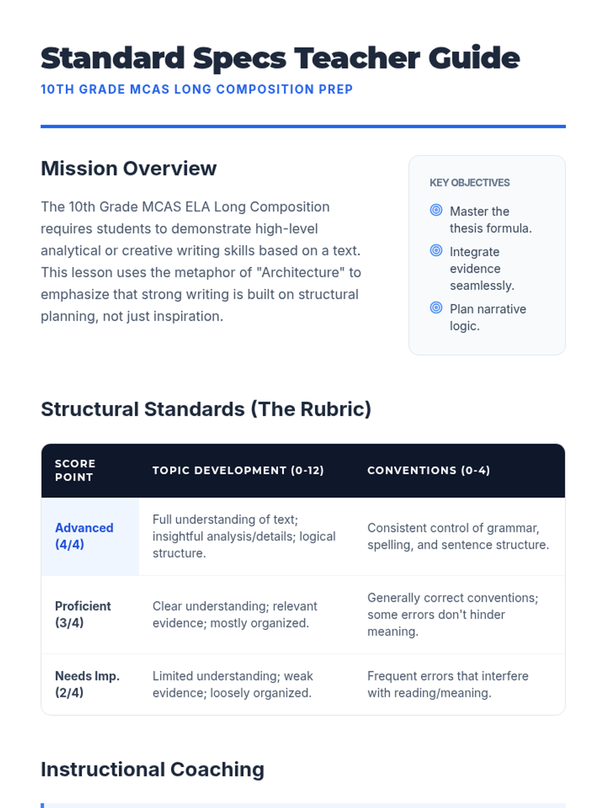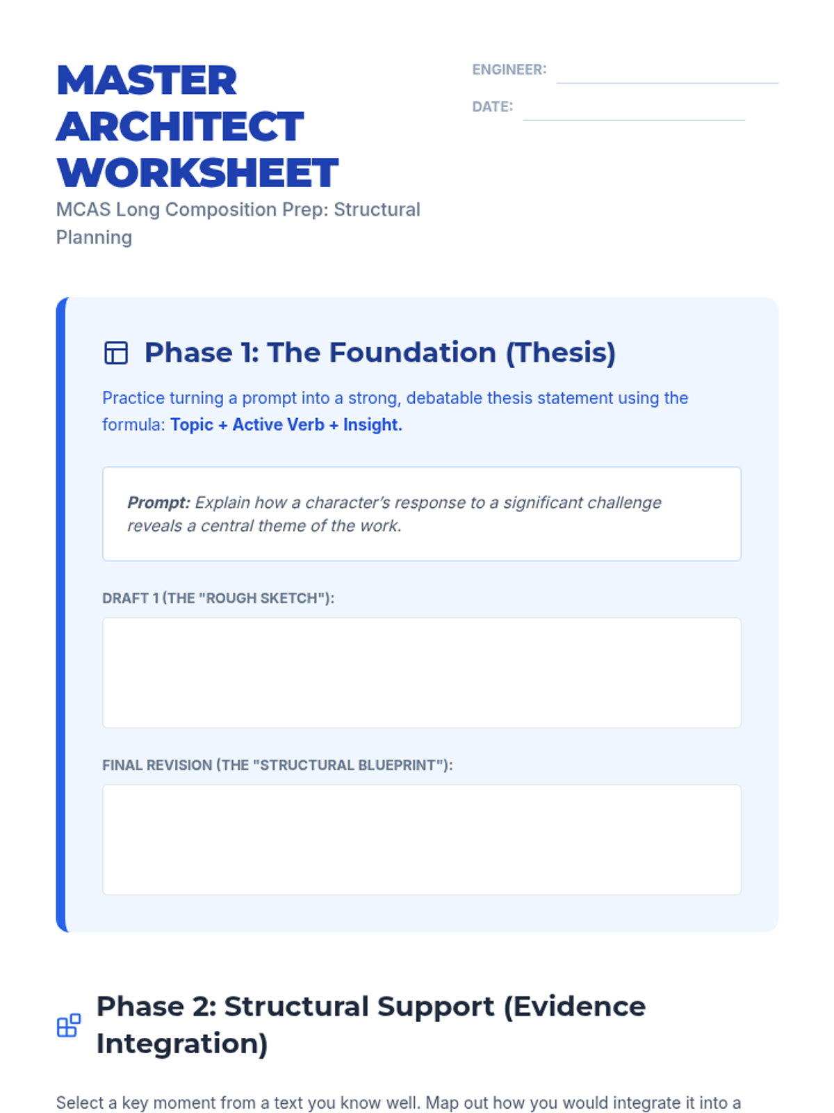 A comprehensive prep lesson for the 10th grade ELA MCAS long composition, focusing on structural planning for both argument and narrative responses. Students will master thesis construction, evidence selection, and revision techniques through architectural metaphors.